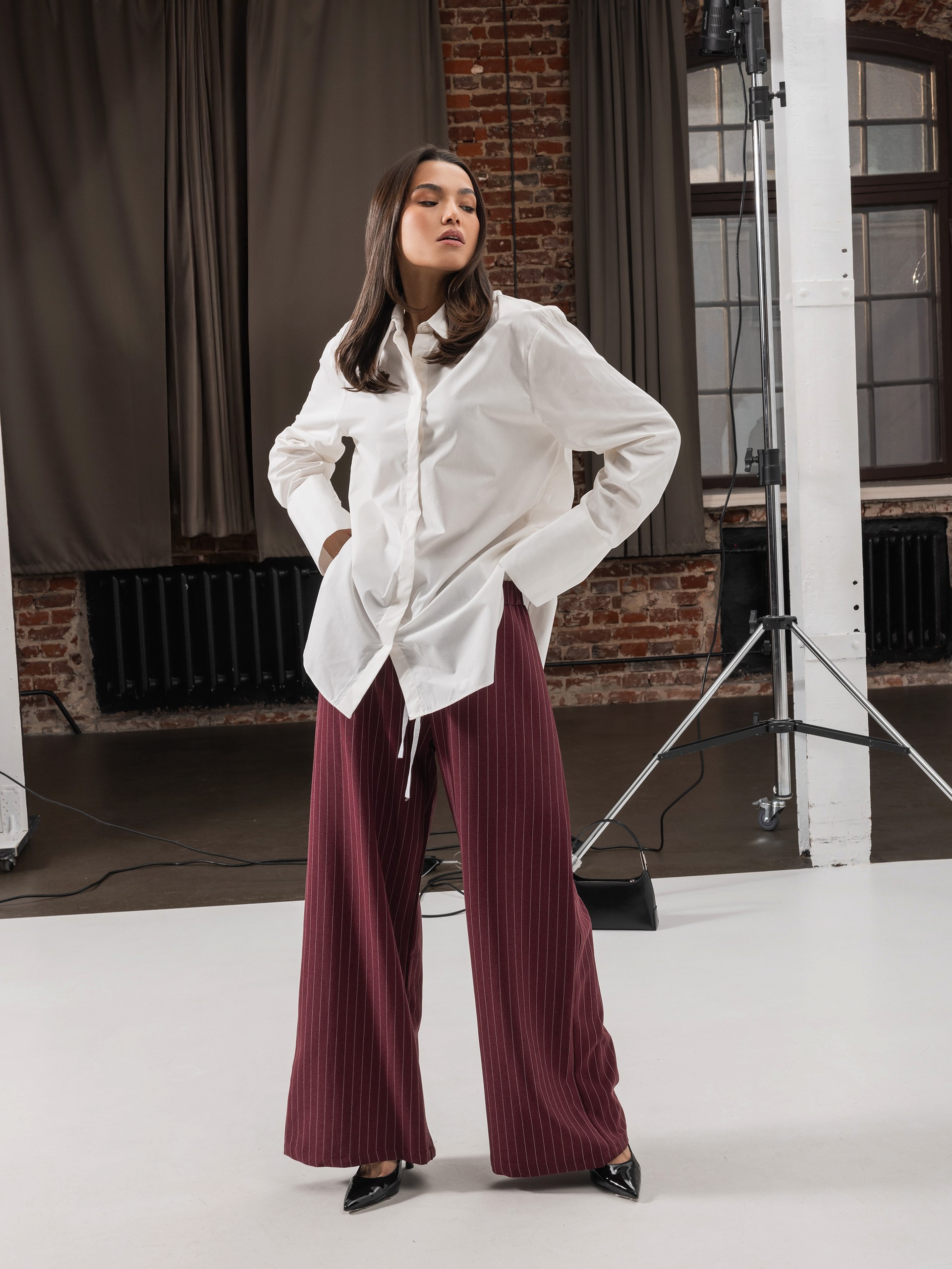 Брюки, с эластичным поясом (резинка) и завязками, имеют прямой крой и ткань брюк с вертикальными полосками.