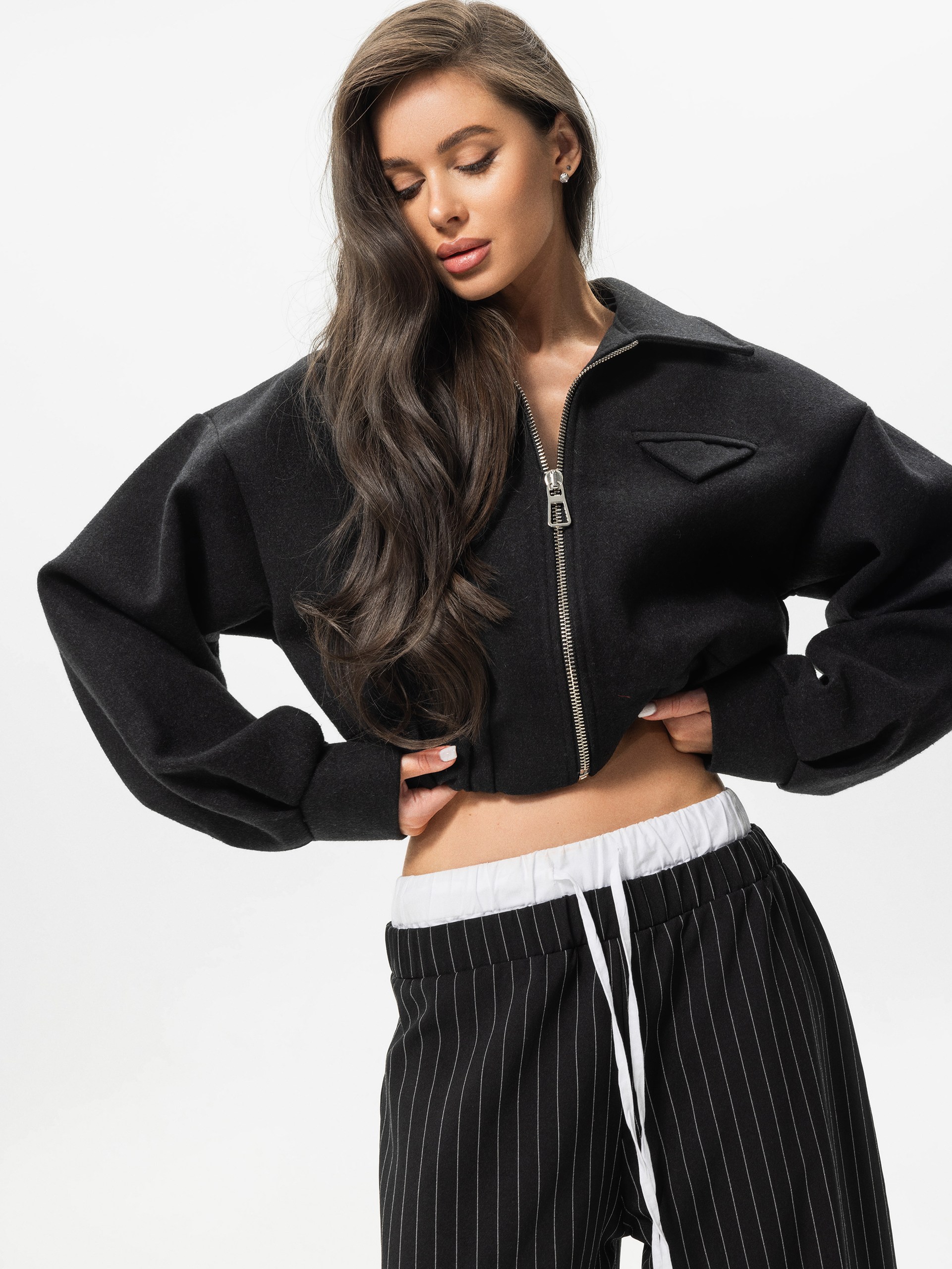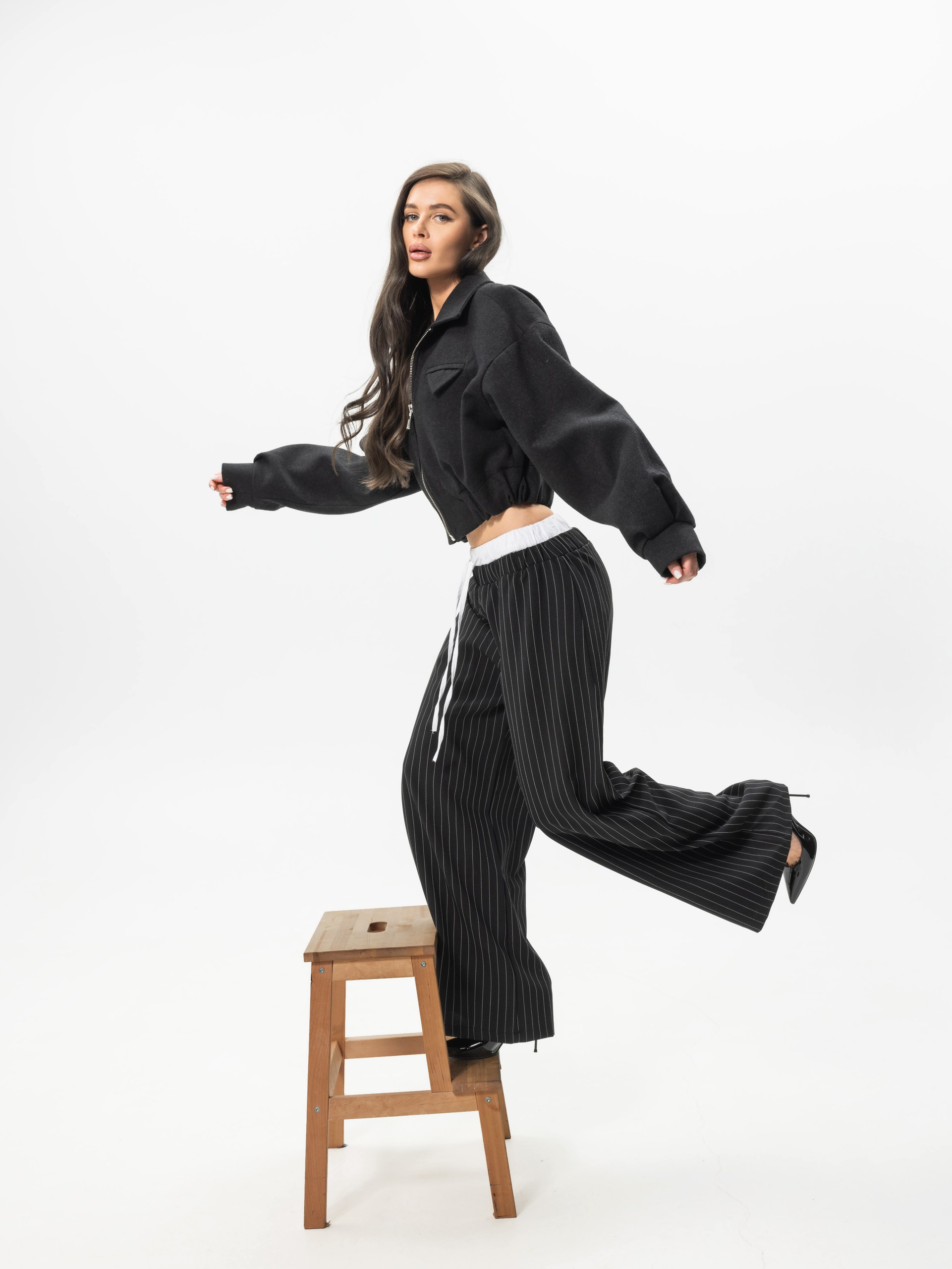 Брюки, с эластичным поясом (резинка) и завязками, имеют прямой крой и ткань брюк с вертикальными полосками.
