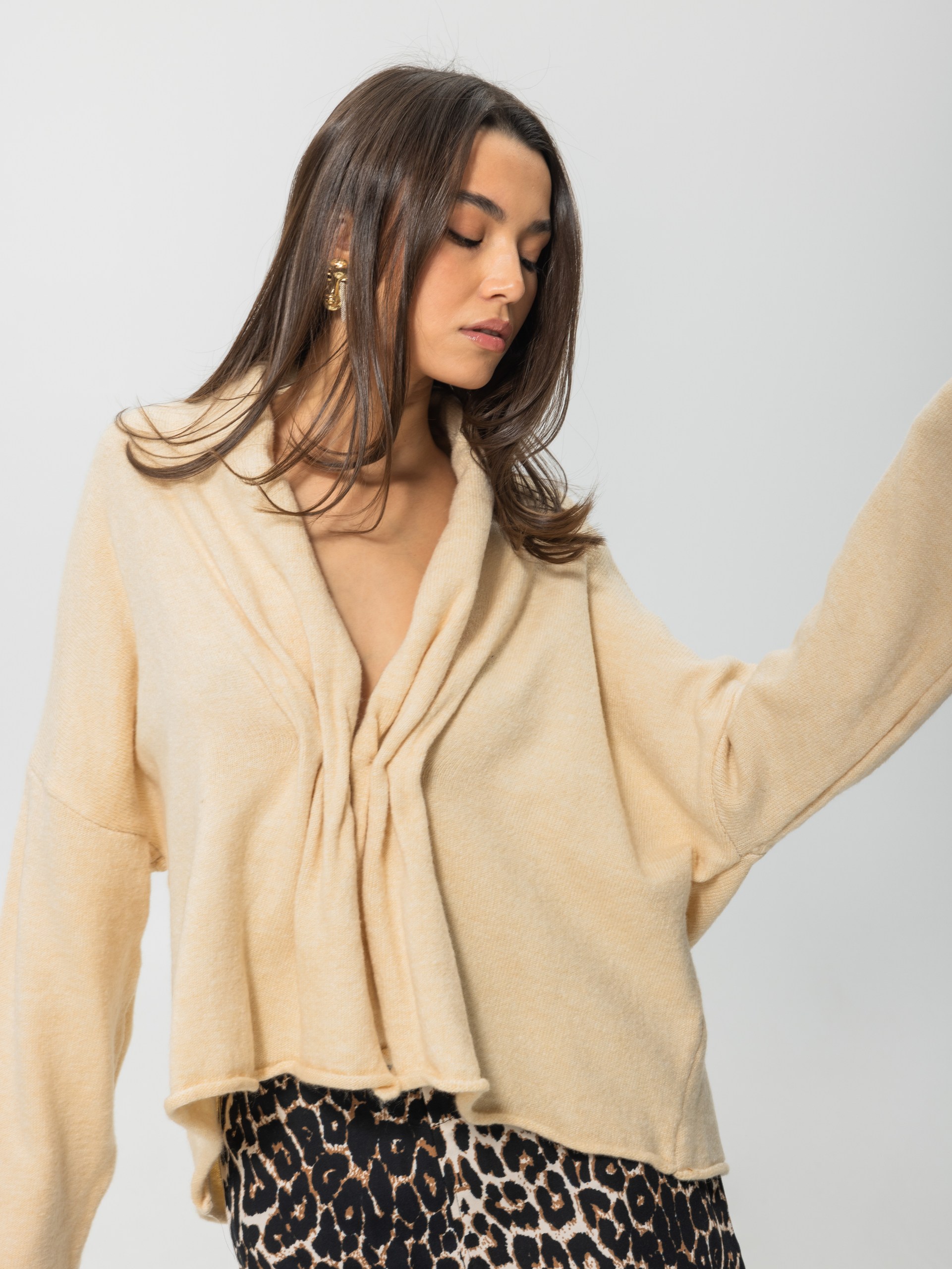 Кардиган имеет длинный рукав, шаль воротник и застегнут на брошь