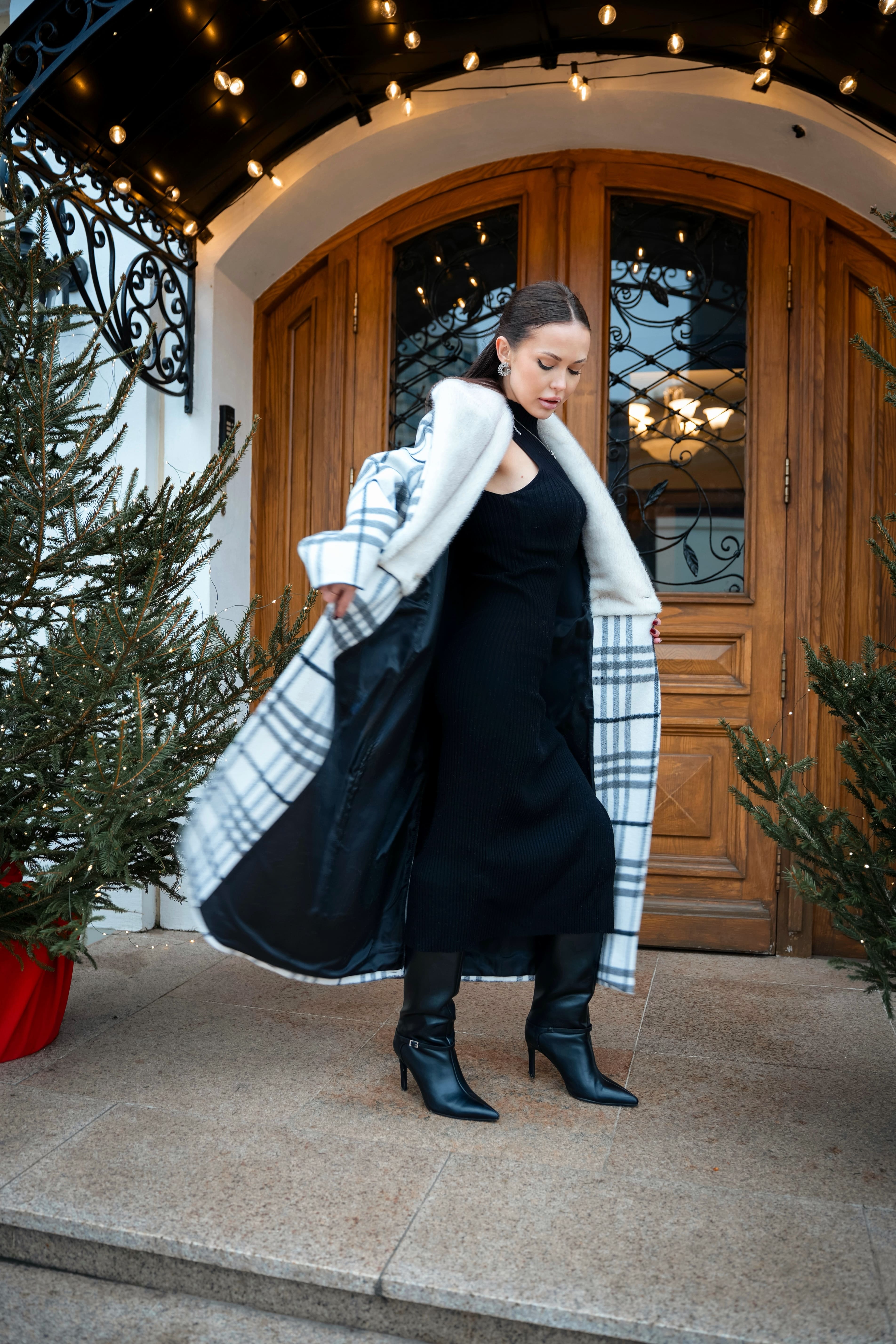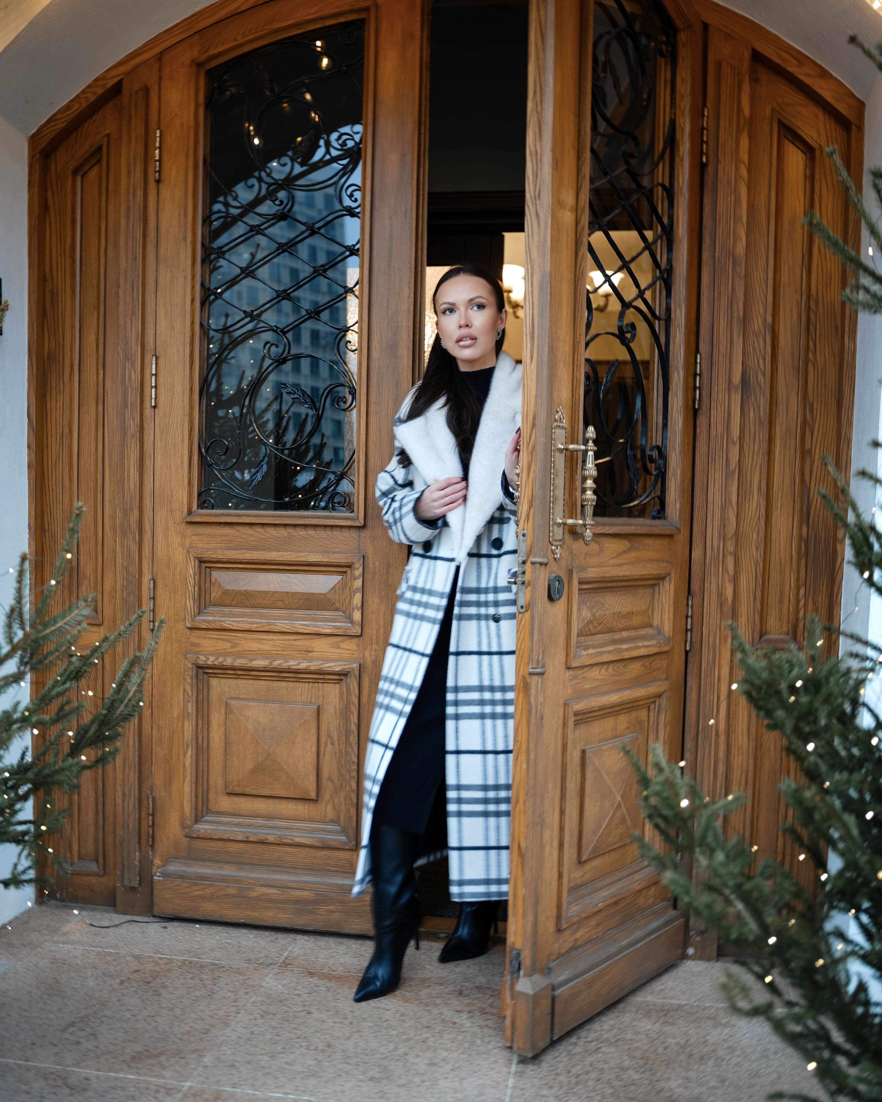 Пальто в клетку с акцентным воротником
