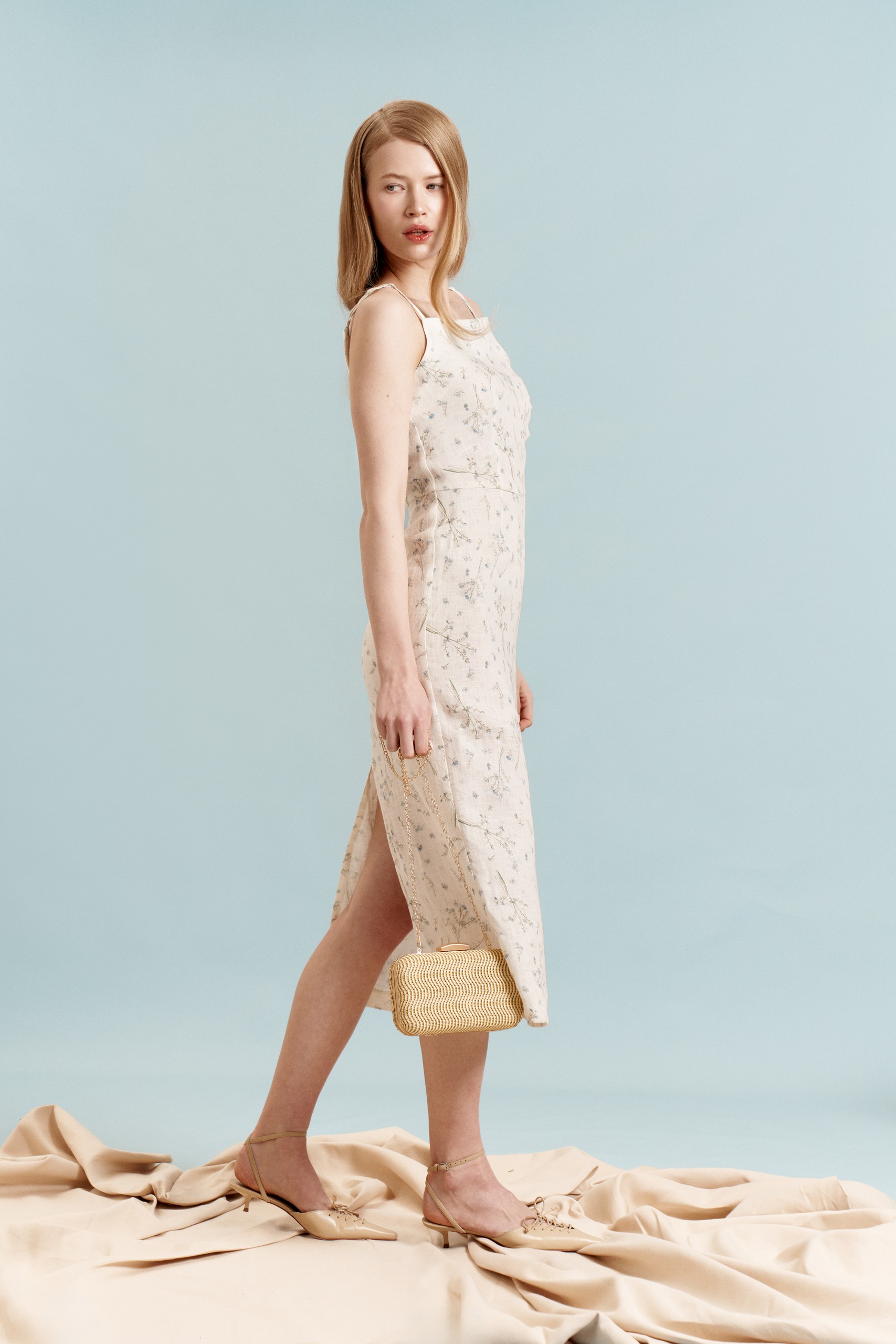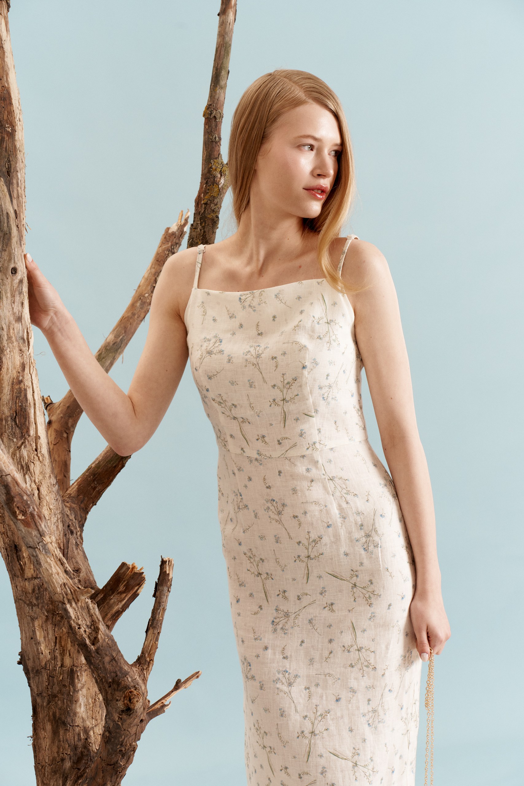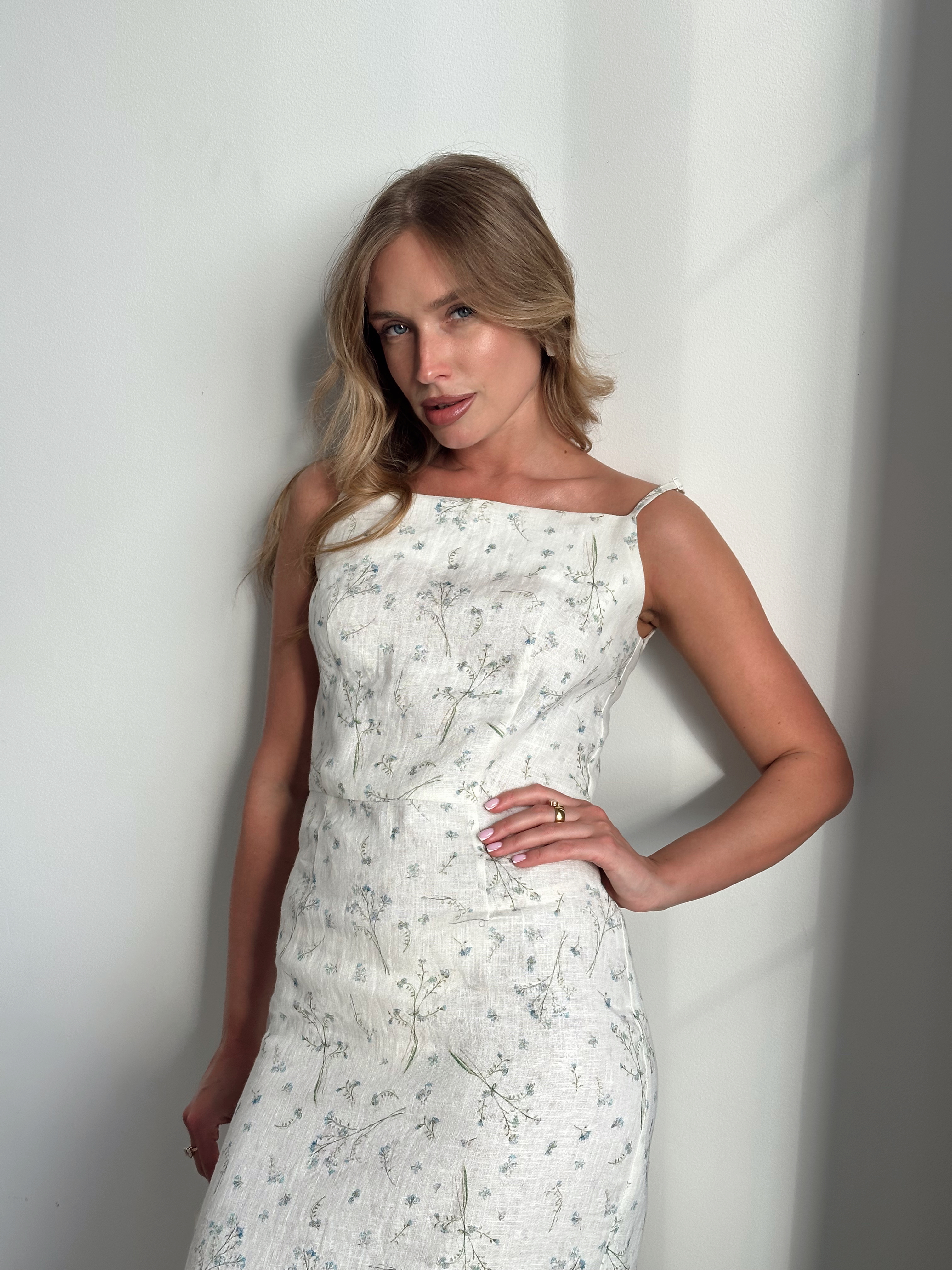 Льняной сарафан на тонких бретелях в цветочном принте