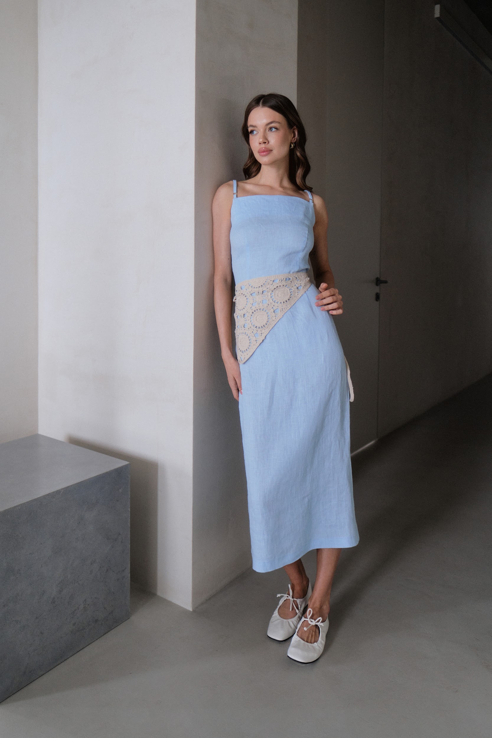 Льняной сарафан на тонких бретелях в голубом цвете
