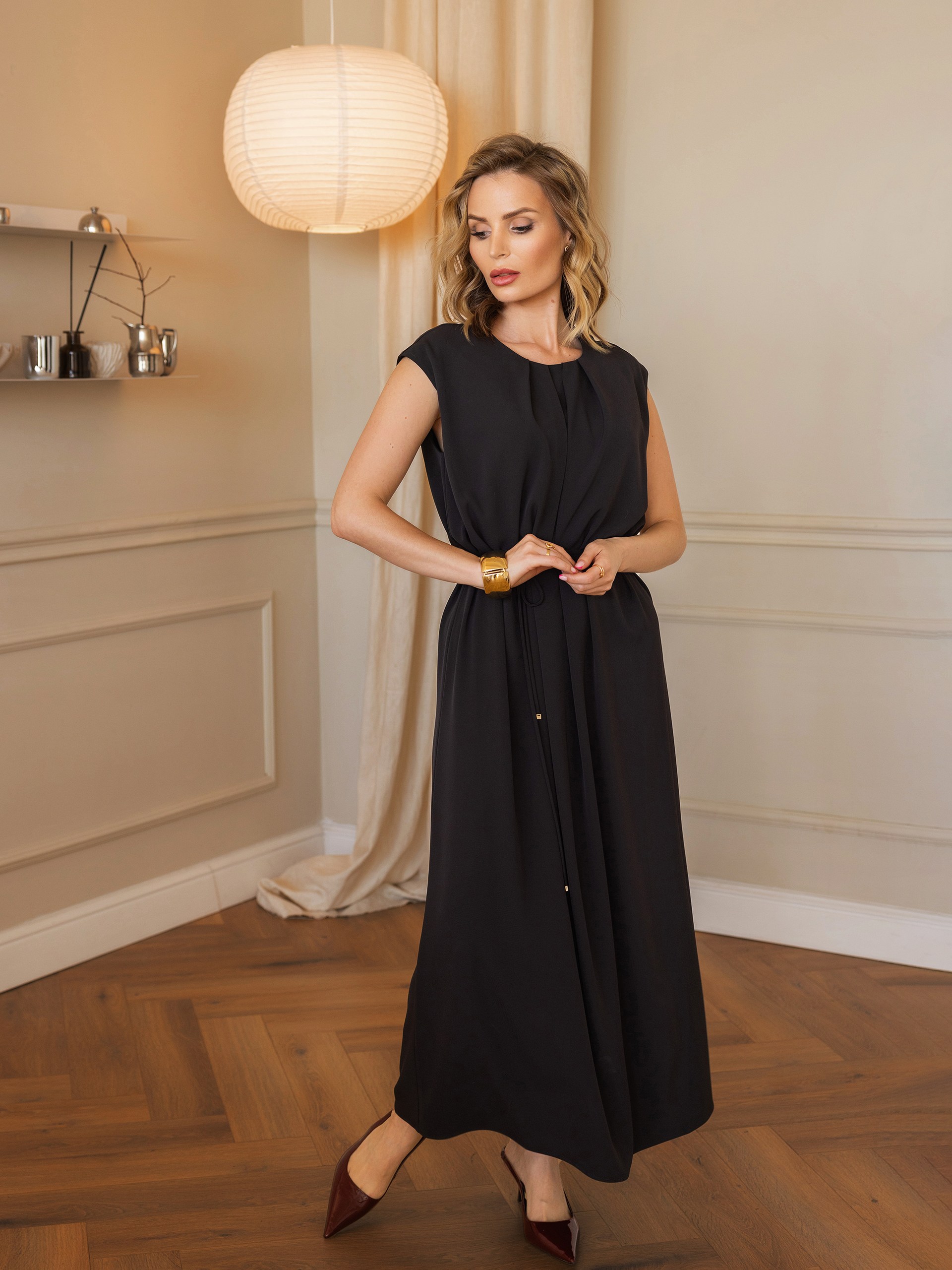 Платье в длине миди без рукавов с тонким поясом в чёрном цвете, застежка молния