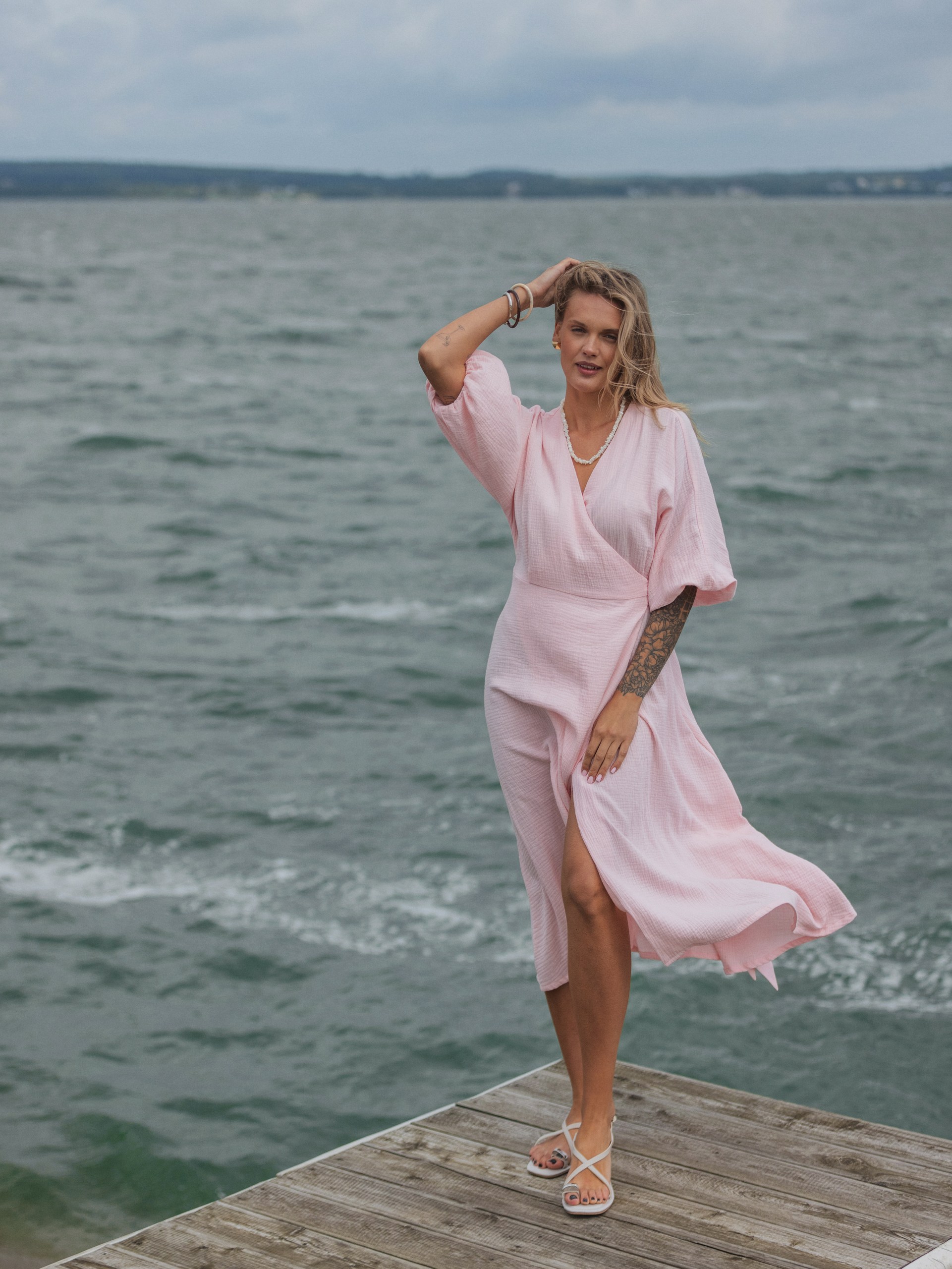 Платье из муслина с поясом на запах в розовом цвете