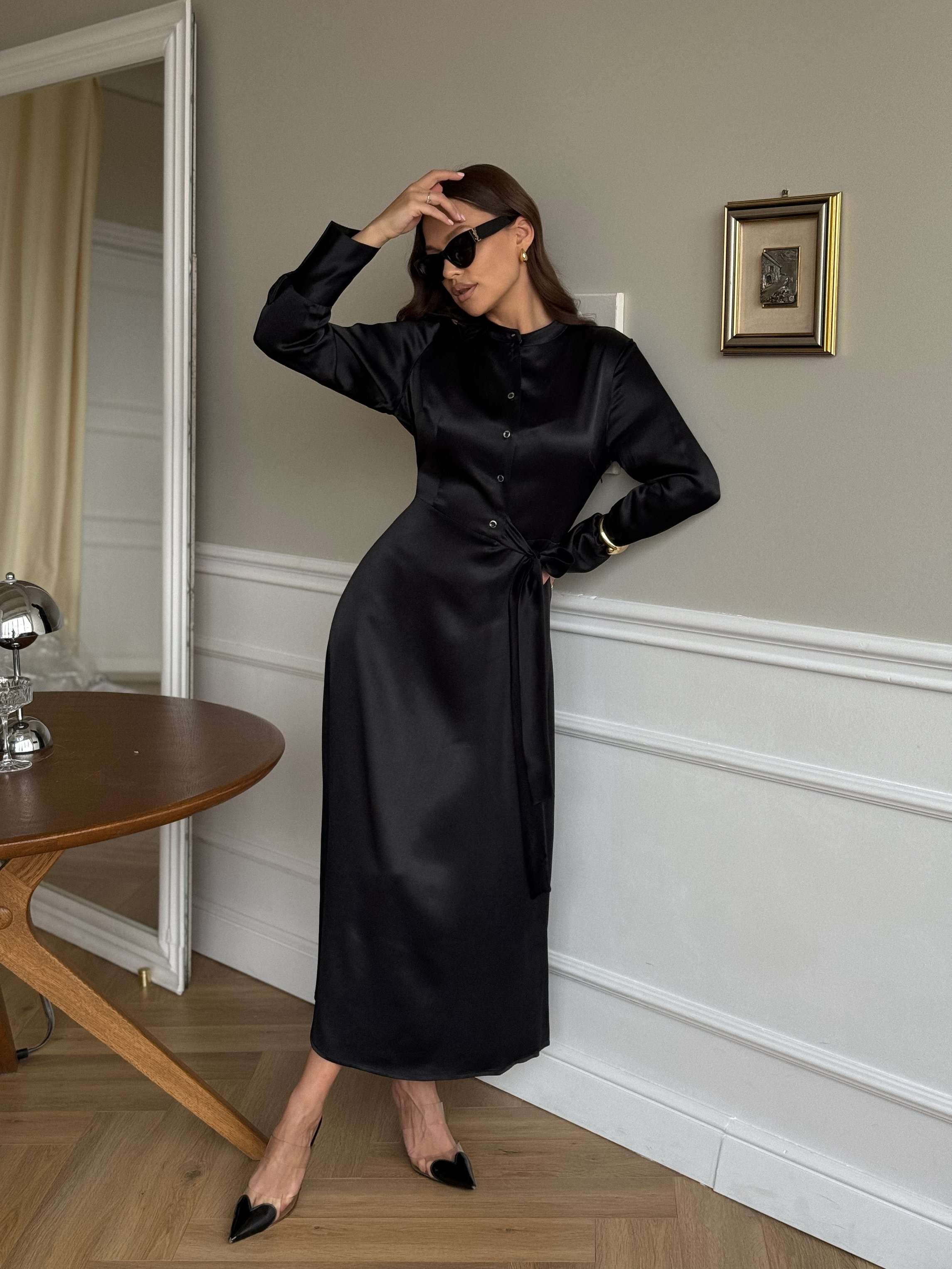Платье имеет длинные рукава, застегивается на пуговицы спереди, также оснащено поясом, завязывается сбоку.