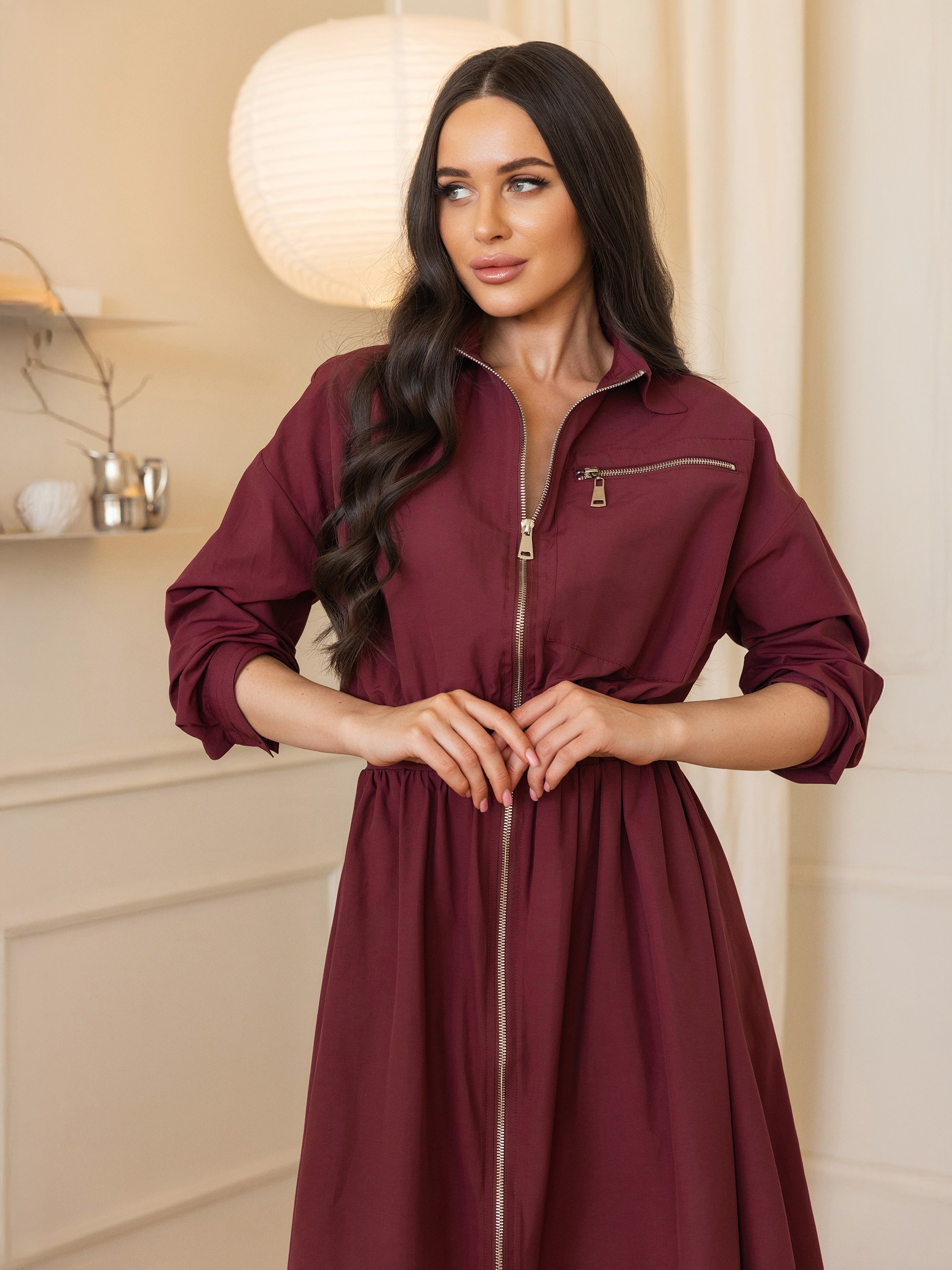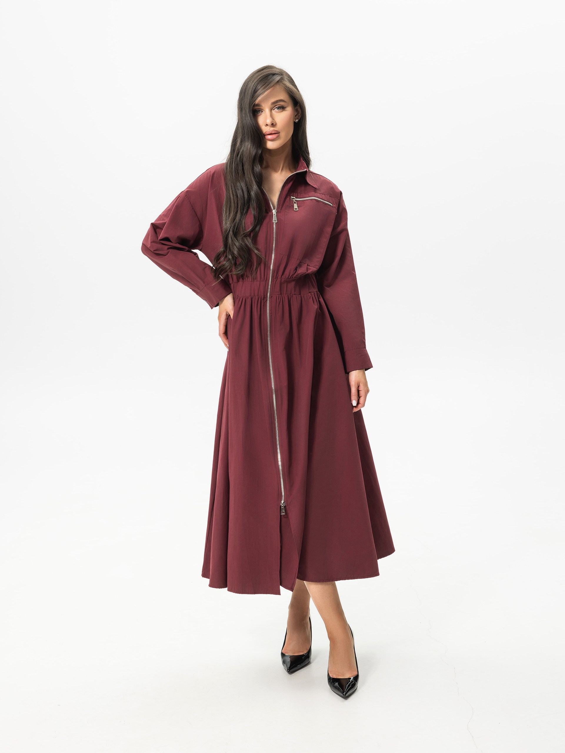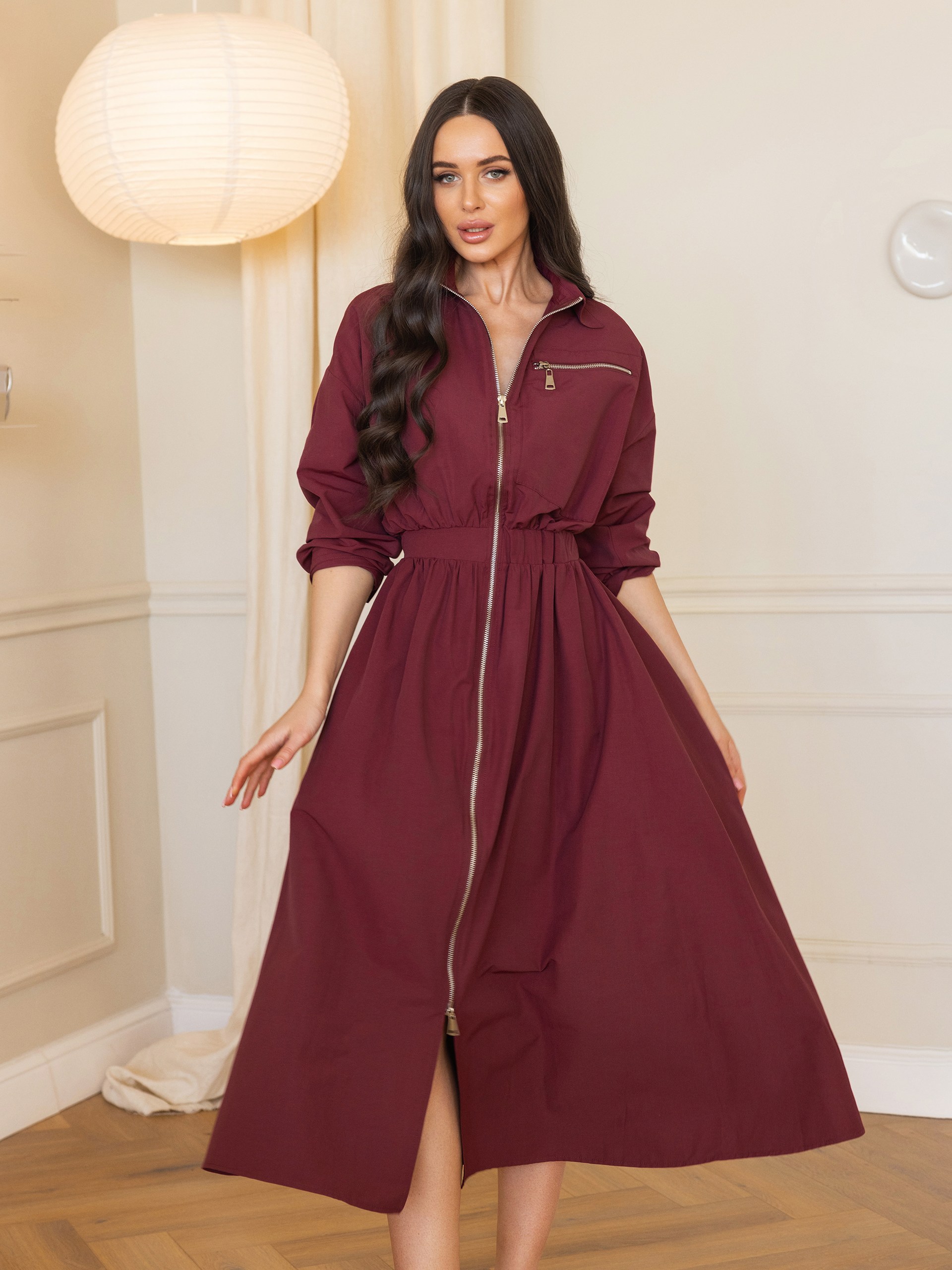 Платье, с длинными рукавами, длина миди. На поясе декоративная резинка подчеркивающая талию. Воротник и застежка-молния, проходящая по всей длине платья спереди. На груди с левой стороны имеется горизонтальный карман на молнии. На вшивной бирке ( имеется запасная пуговица )