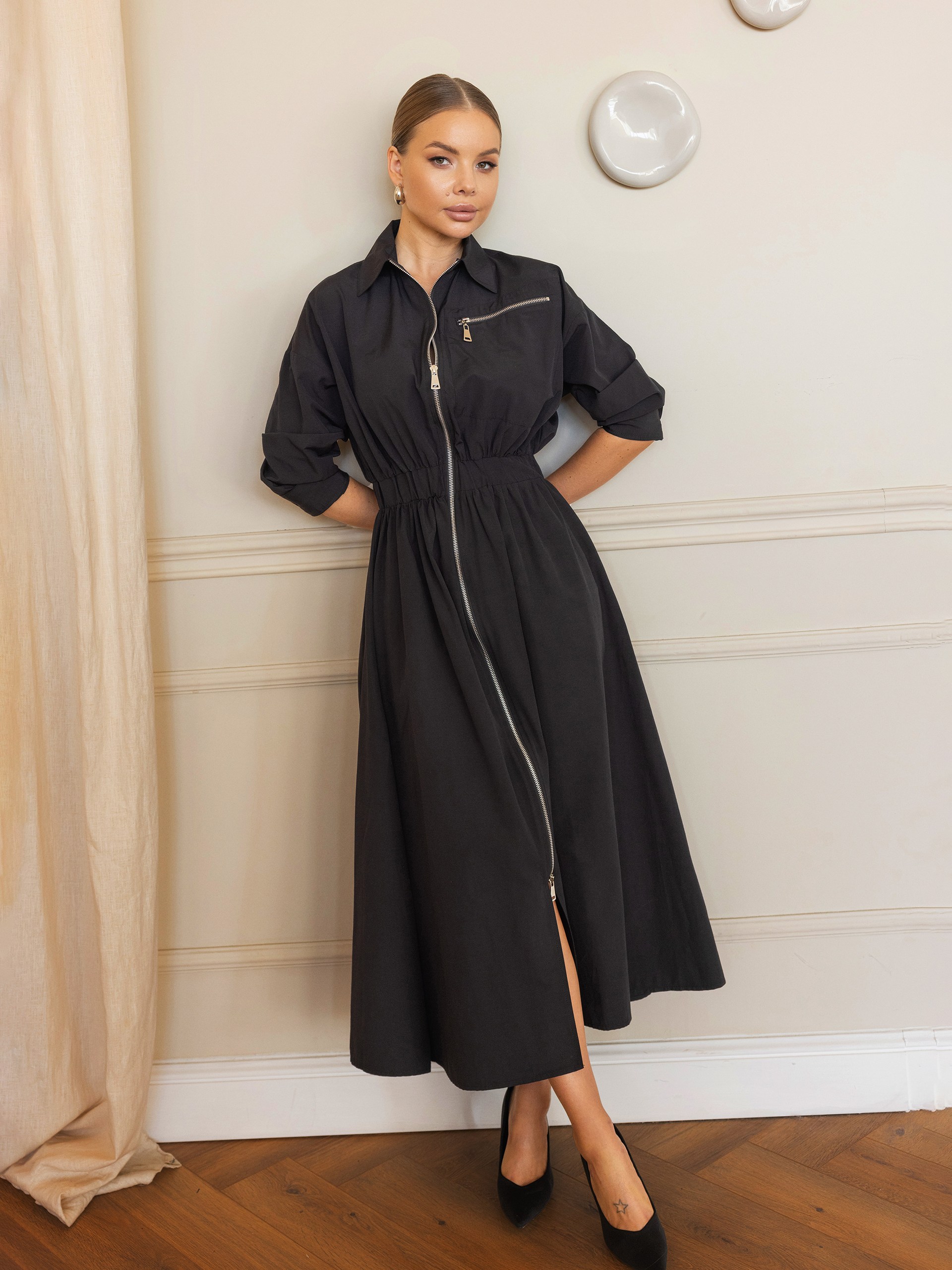 Платье, с длинными рукавами, длина миди. На поясе декоративная резинка подчеркивающая талию. Воротник и застежка-молния, проходящая по всей длине платья спереди. На груди с левой стороны имеется горизонтальный карман на молнии. На вшивной бирке ( имеется запасная пуговица )