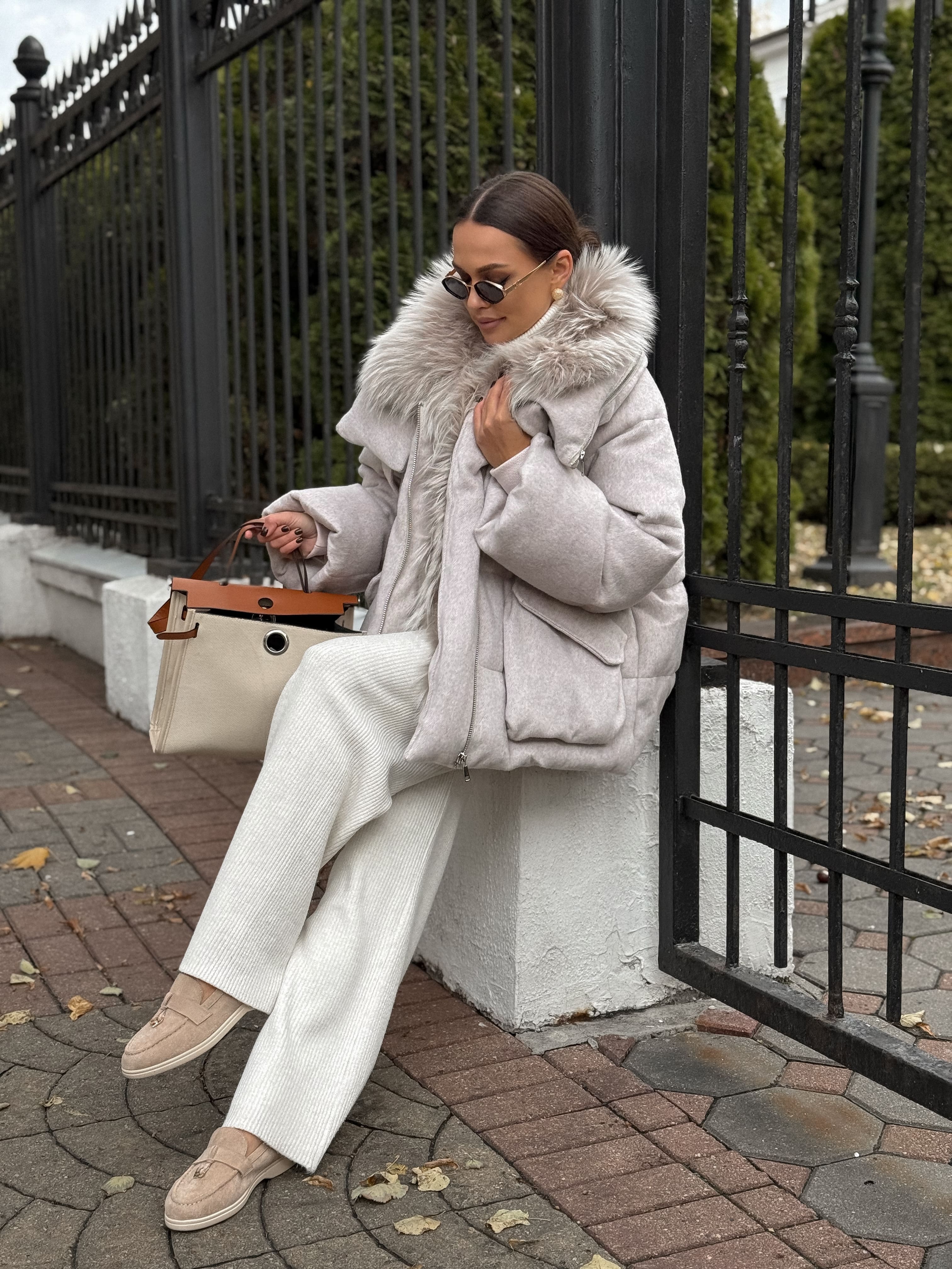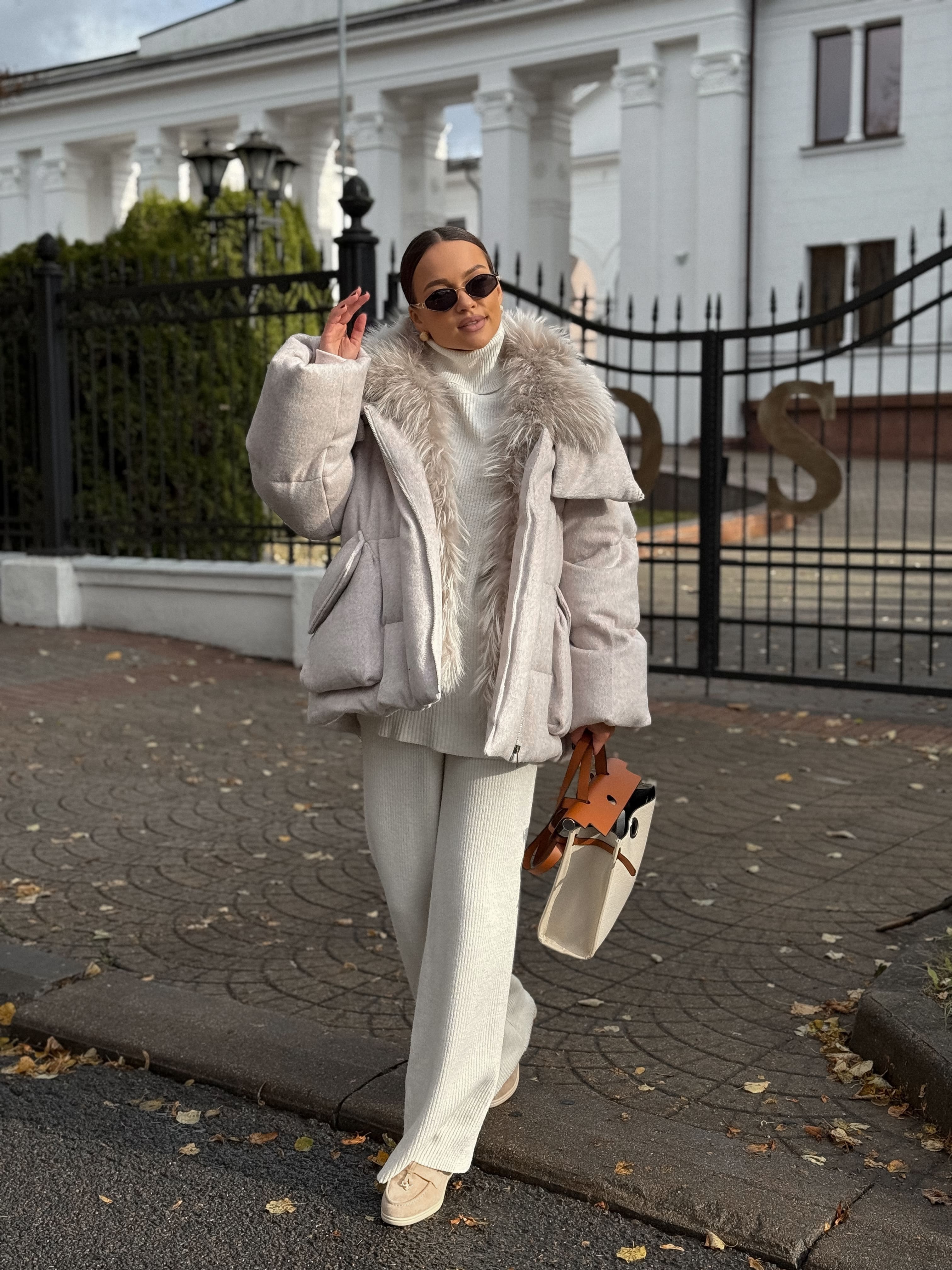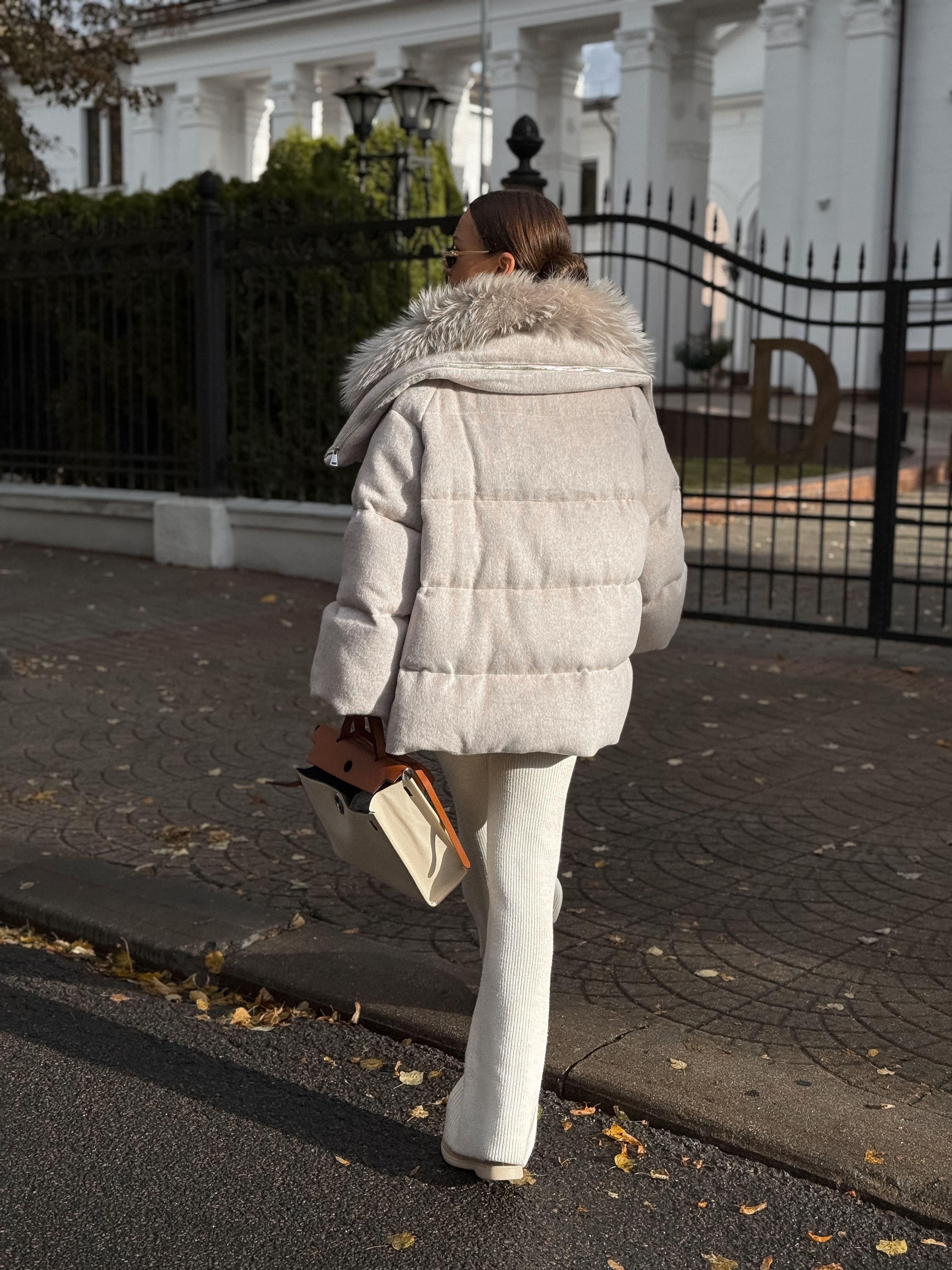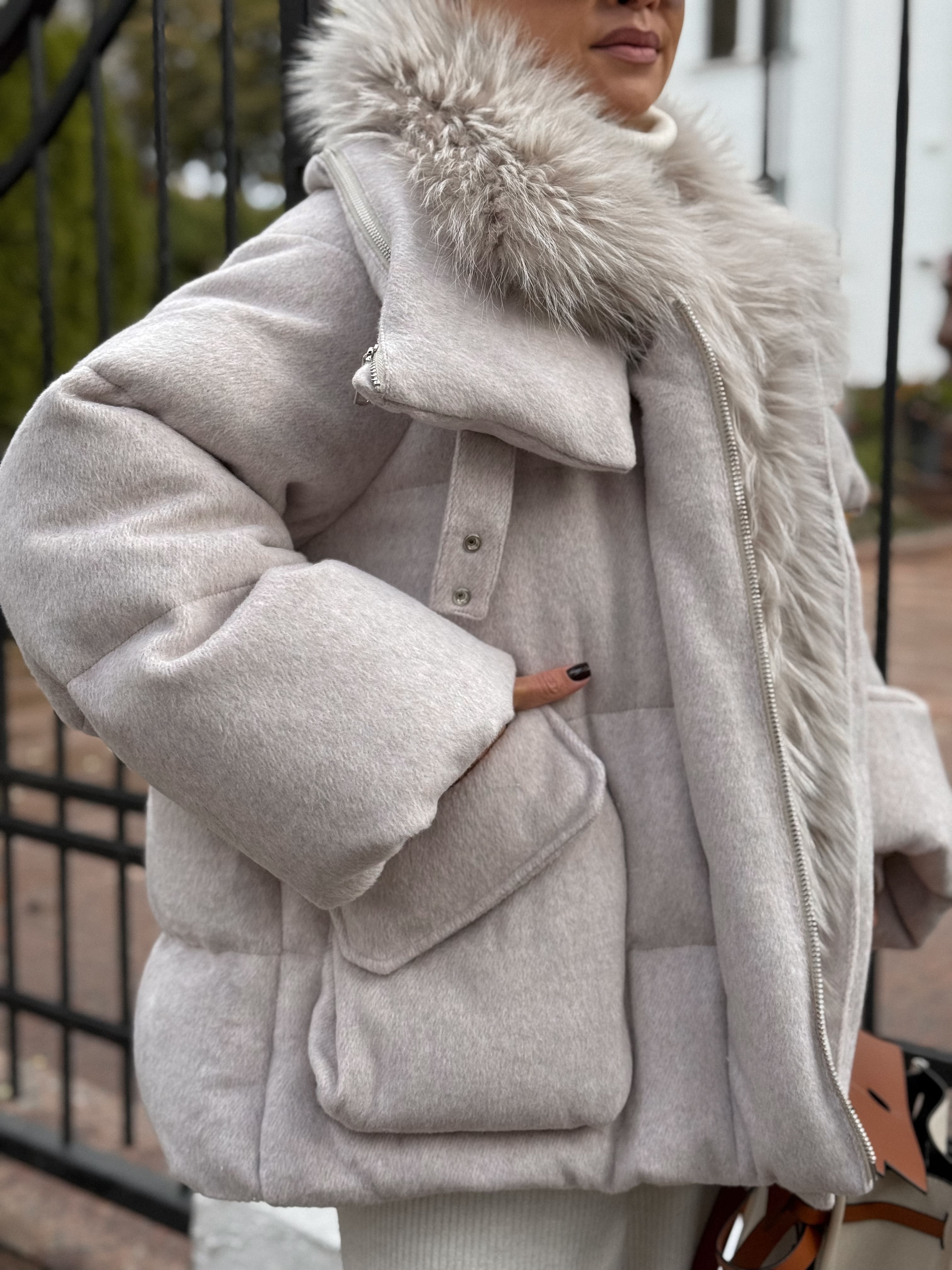 Пуховик с мехом лисы из махера, белый