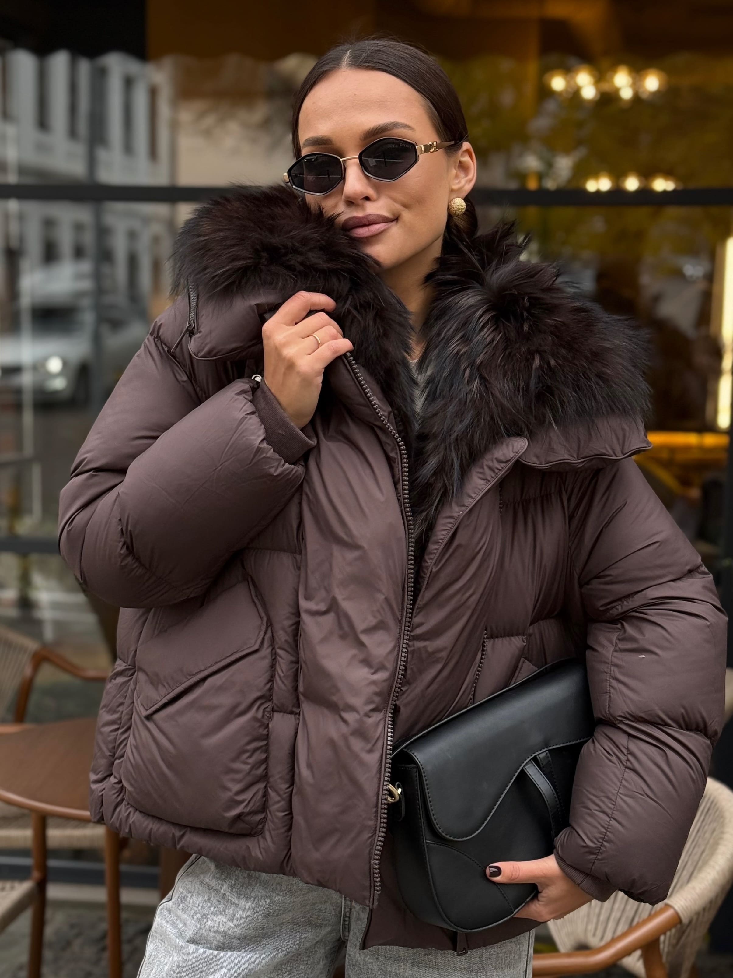 Пуховик укороченный с мехом лисы, шоколадный