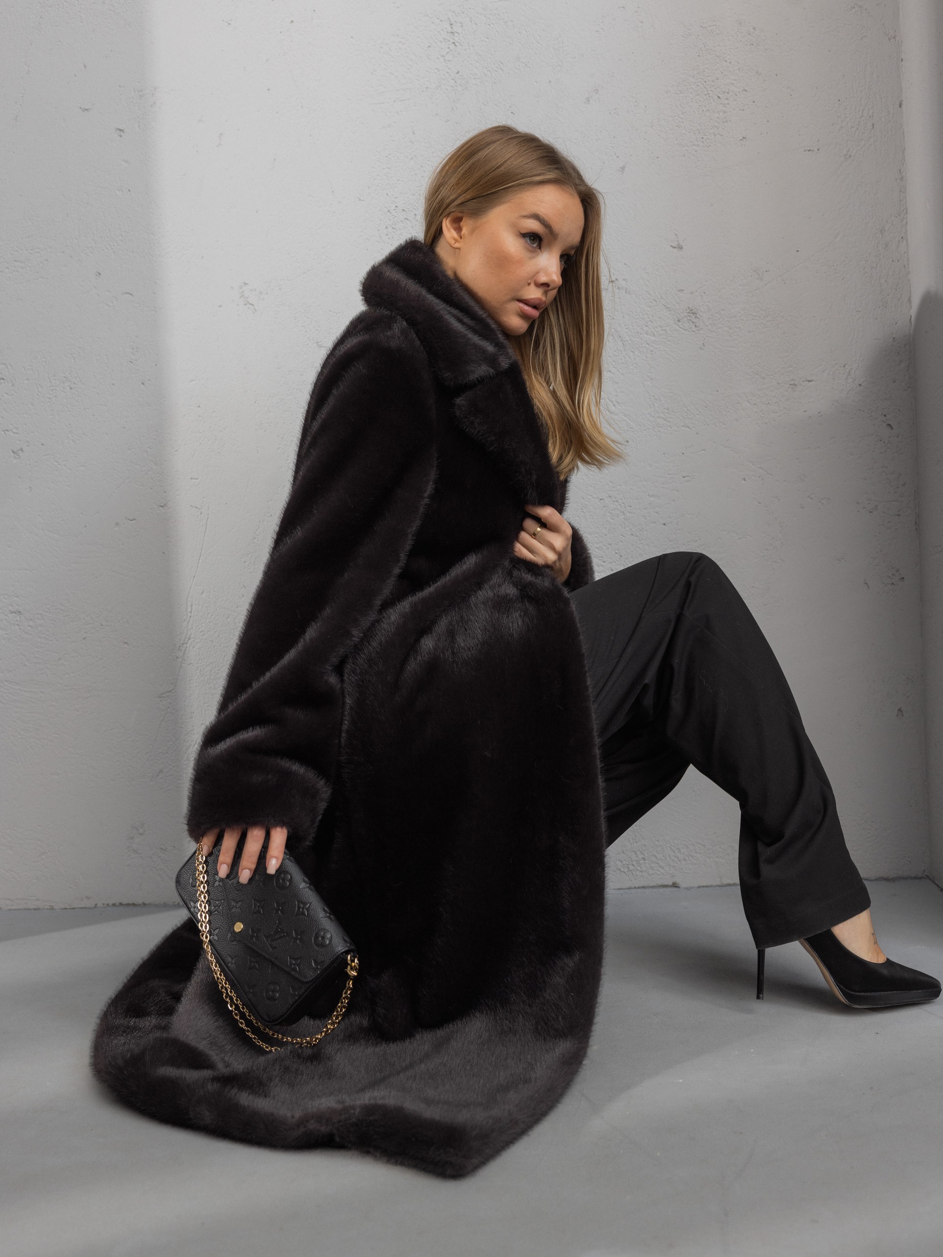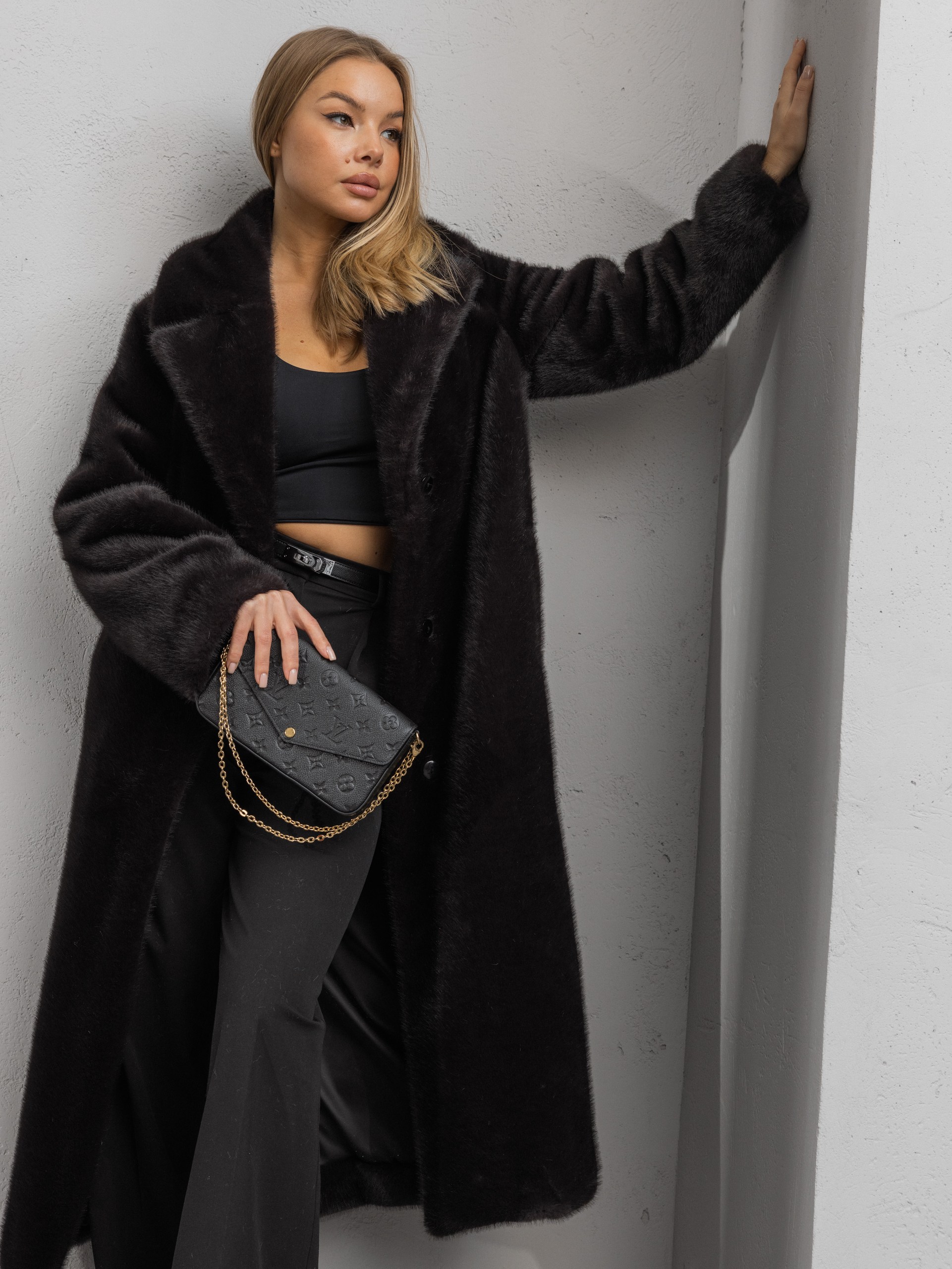 Шубка "волк" в макси длине, черный