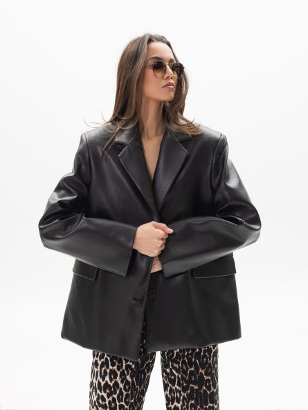 Кожаный пиджак ,классического кроя с лацканами, с двумя пуговицами спереди и двумя карманами с клапанами. Сзади небольшой разрез внизу .