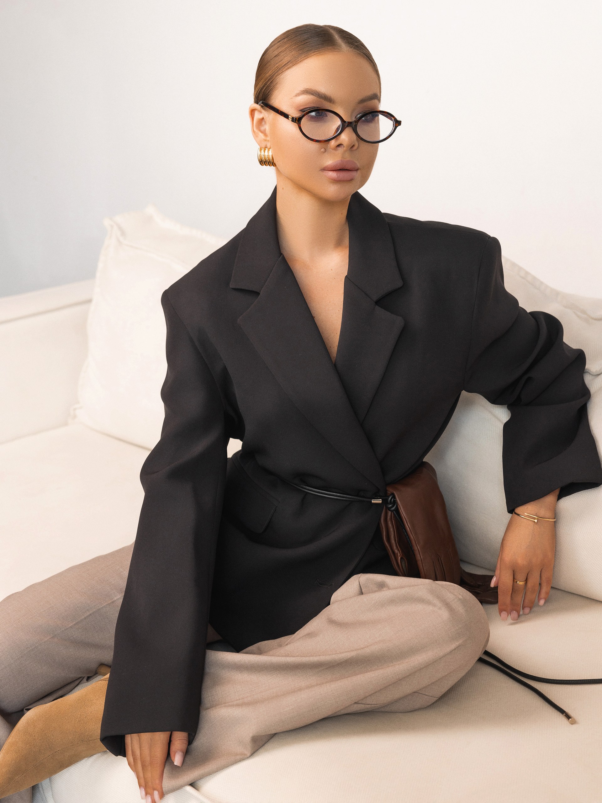 Пиджак с отложным воротником, большими плечами, двумя пуговицами и двумя передними карманами с клапанами.