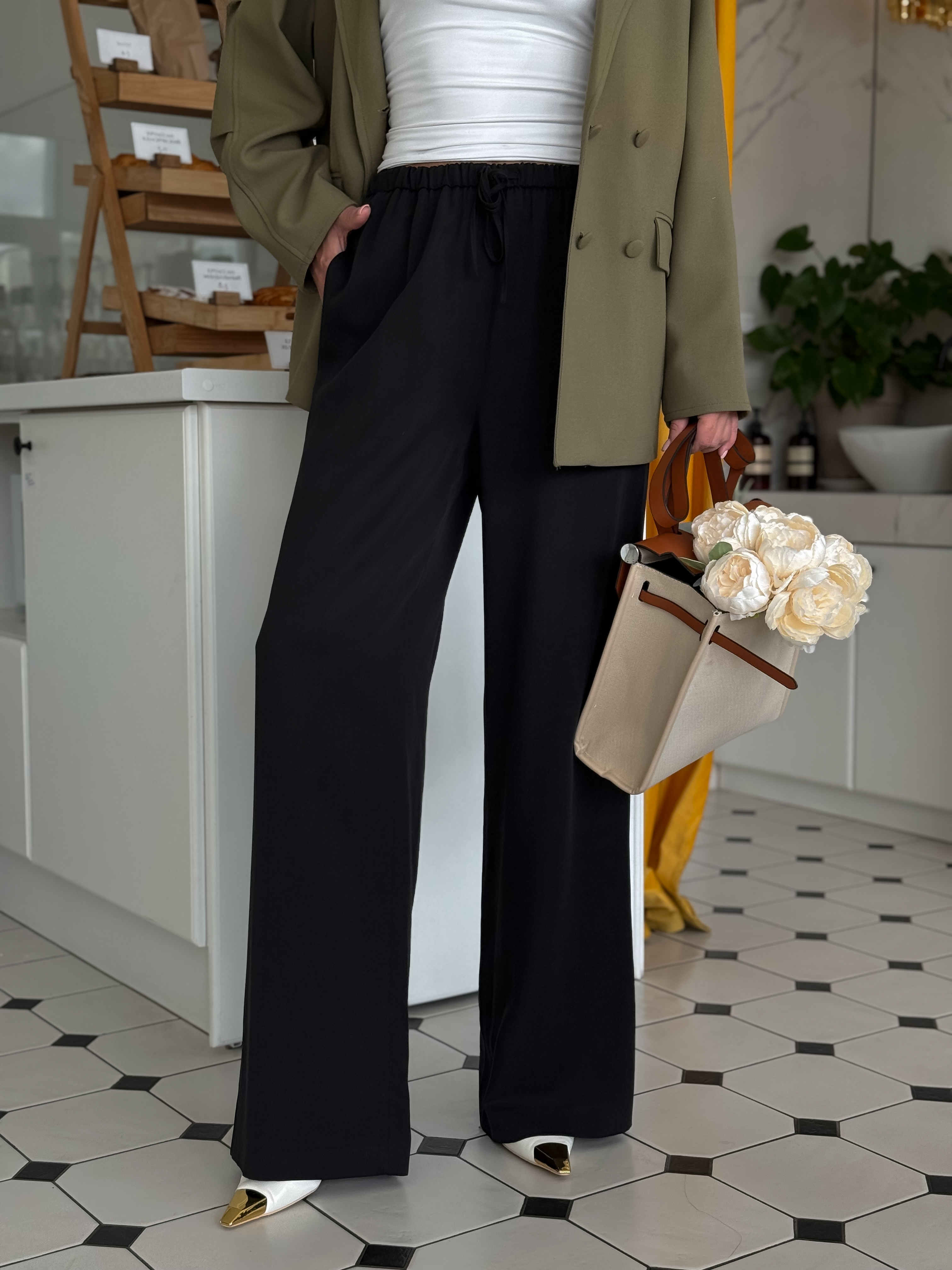 Брюки с широкими штанинами, имеют свободный крой и эластичную резинку на поясе с завязками для регулировки посадки.