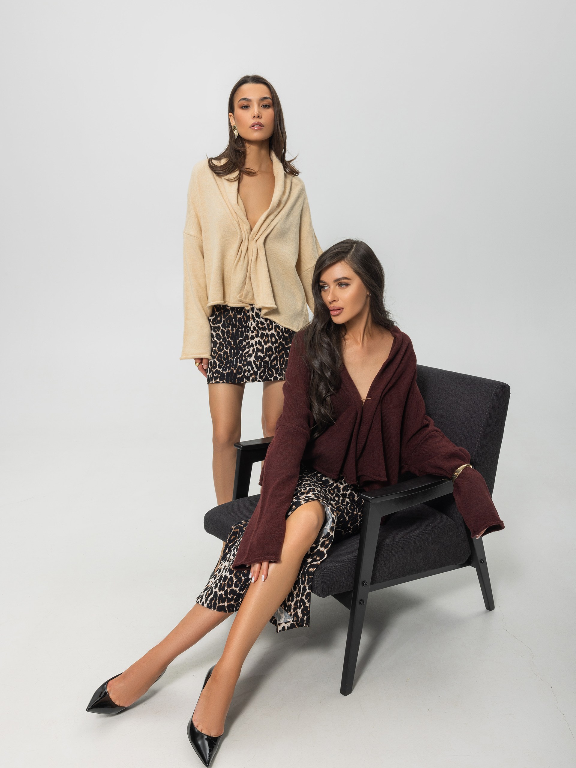Кардиган имеет длинный рукав, шаль воротник и застегнут на брошь