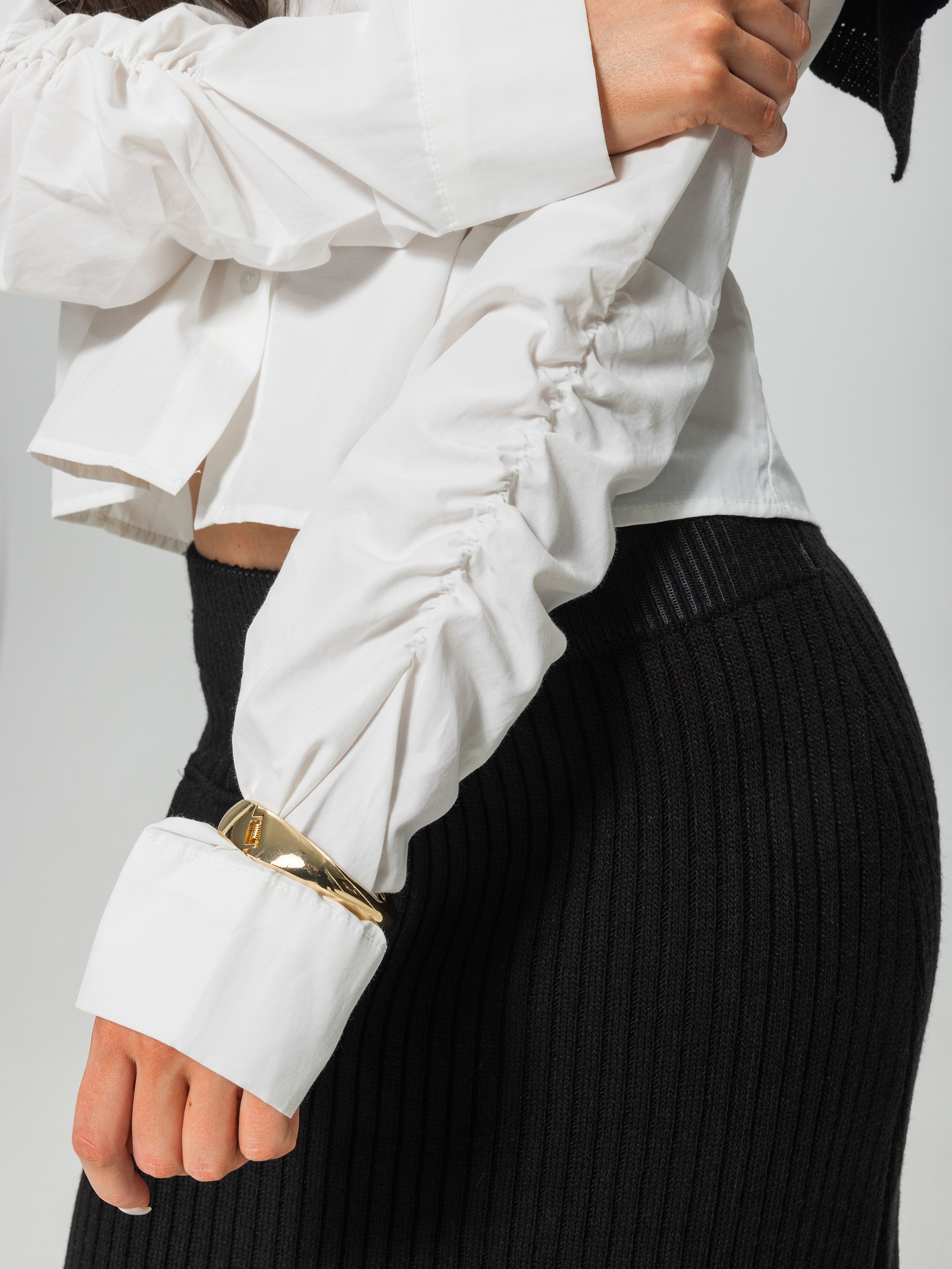 Рубашка белая с длинными рукавами собранными гормокшой (резинка) ближе к манжетам , с воротником на пуговицах, также черный укороченный вязаный свитер, надевается поверх рубашки.