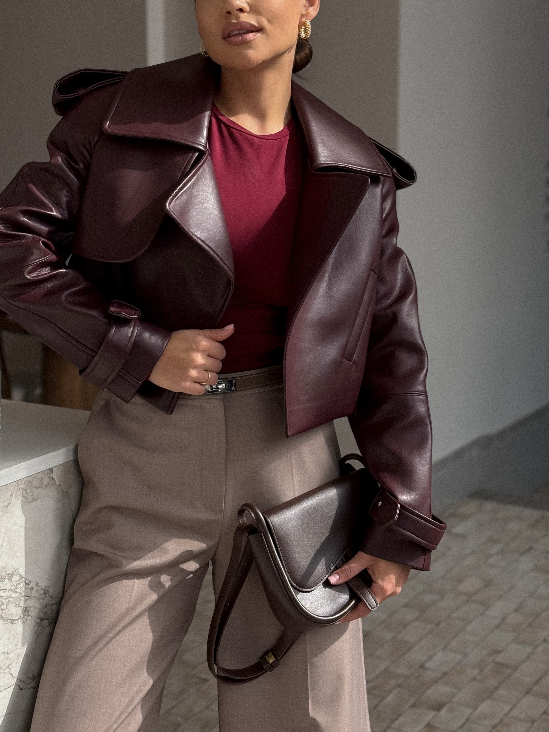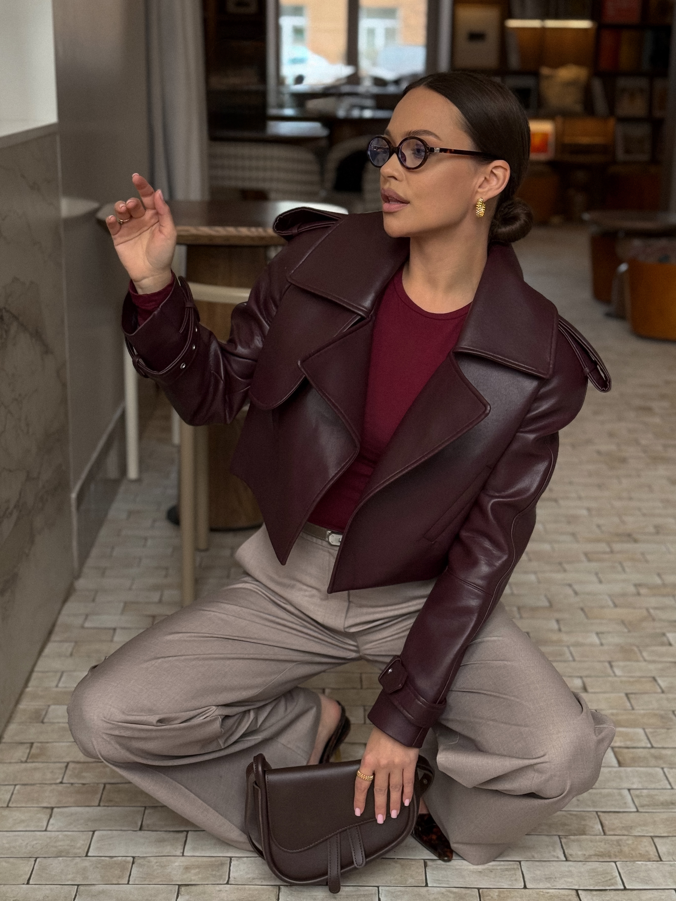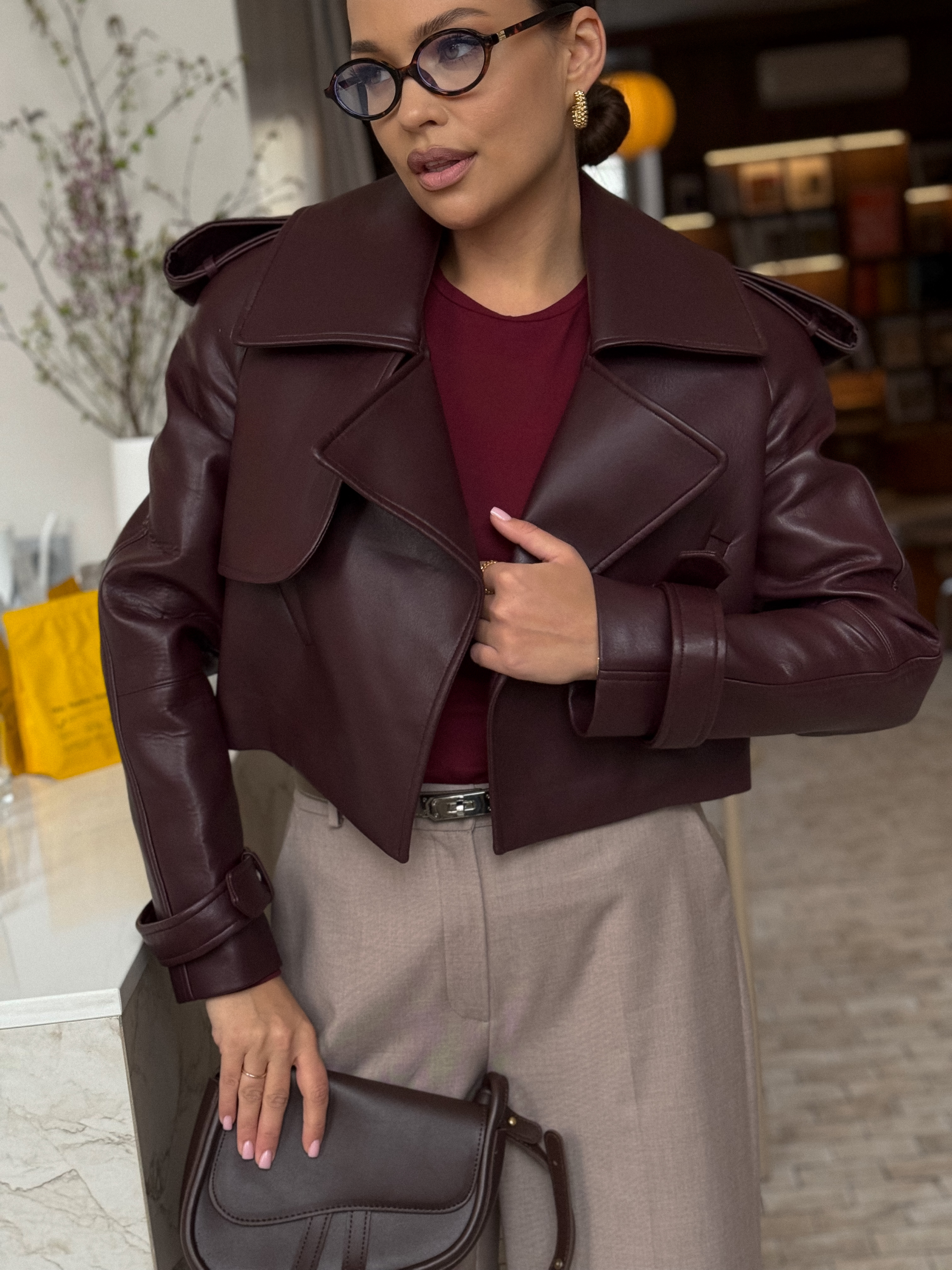 Тренчкот с широким лацканом, погонами на плечах , с поясом на талии , с двумя большими фронтальными карманами. На задней части тренчкота снизу имеется разрез.