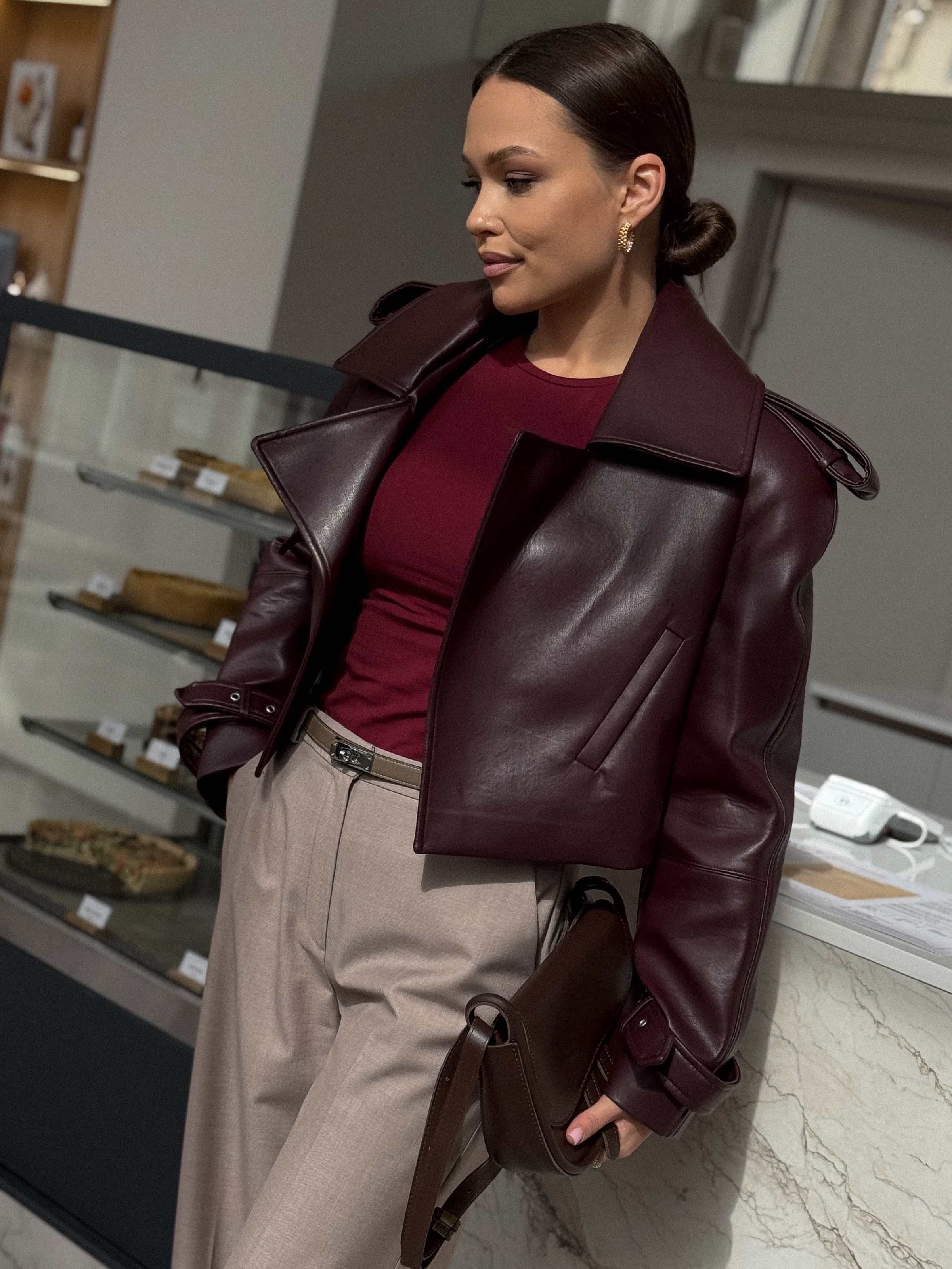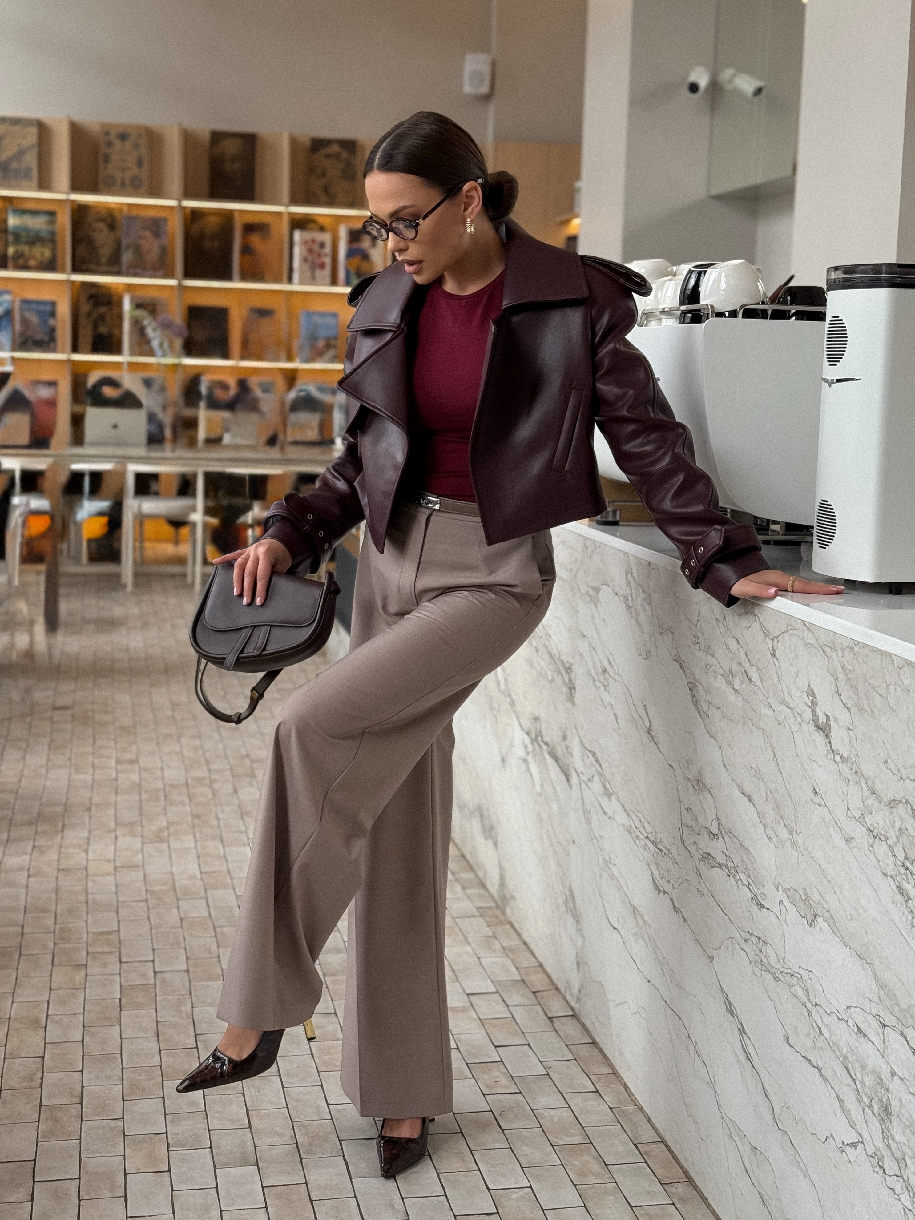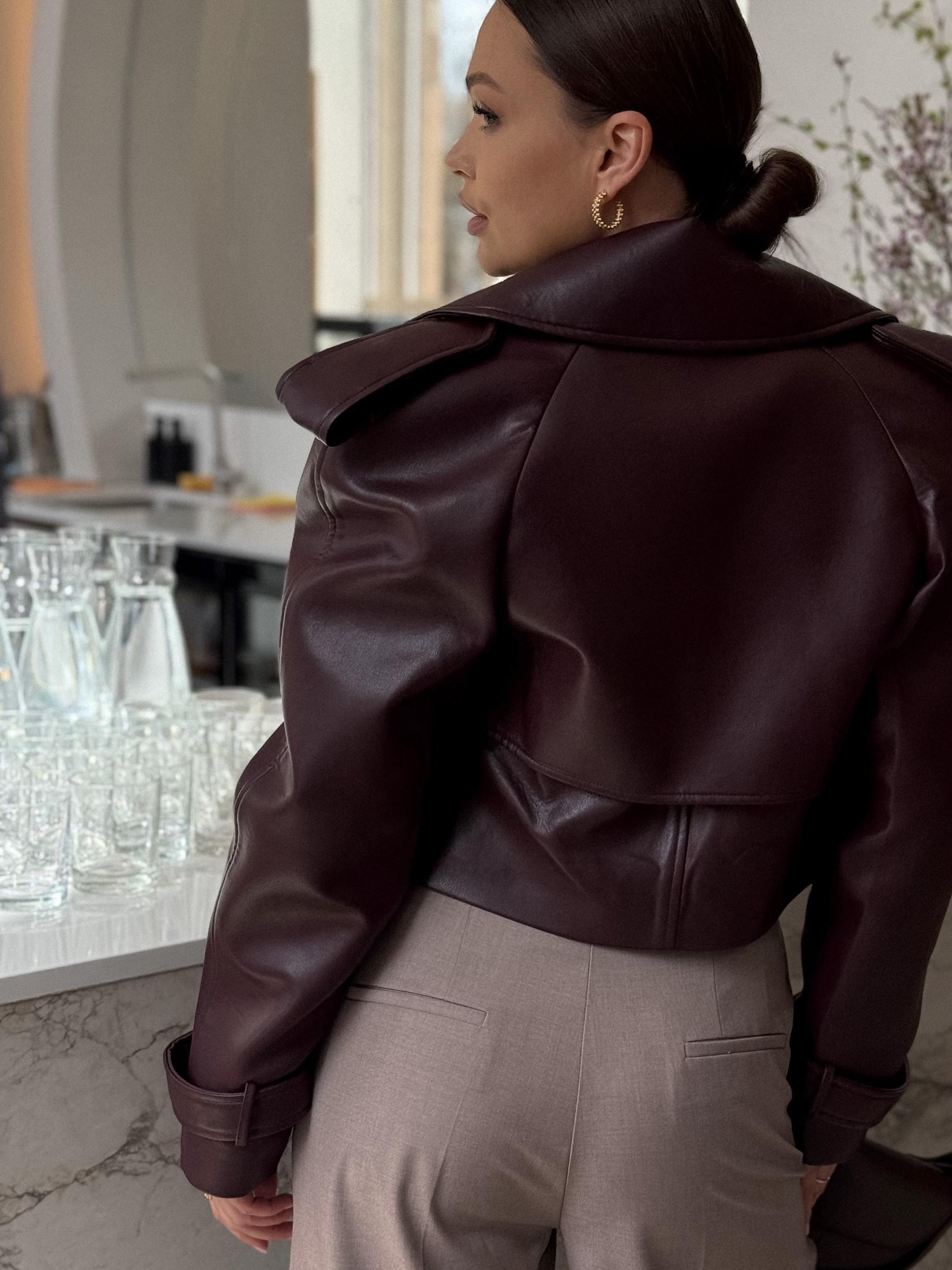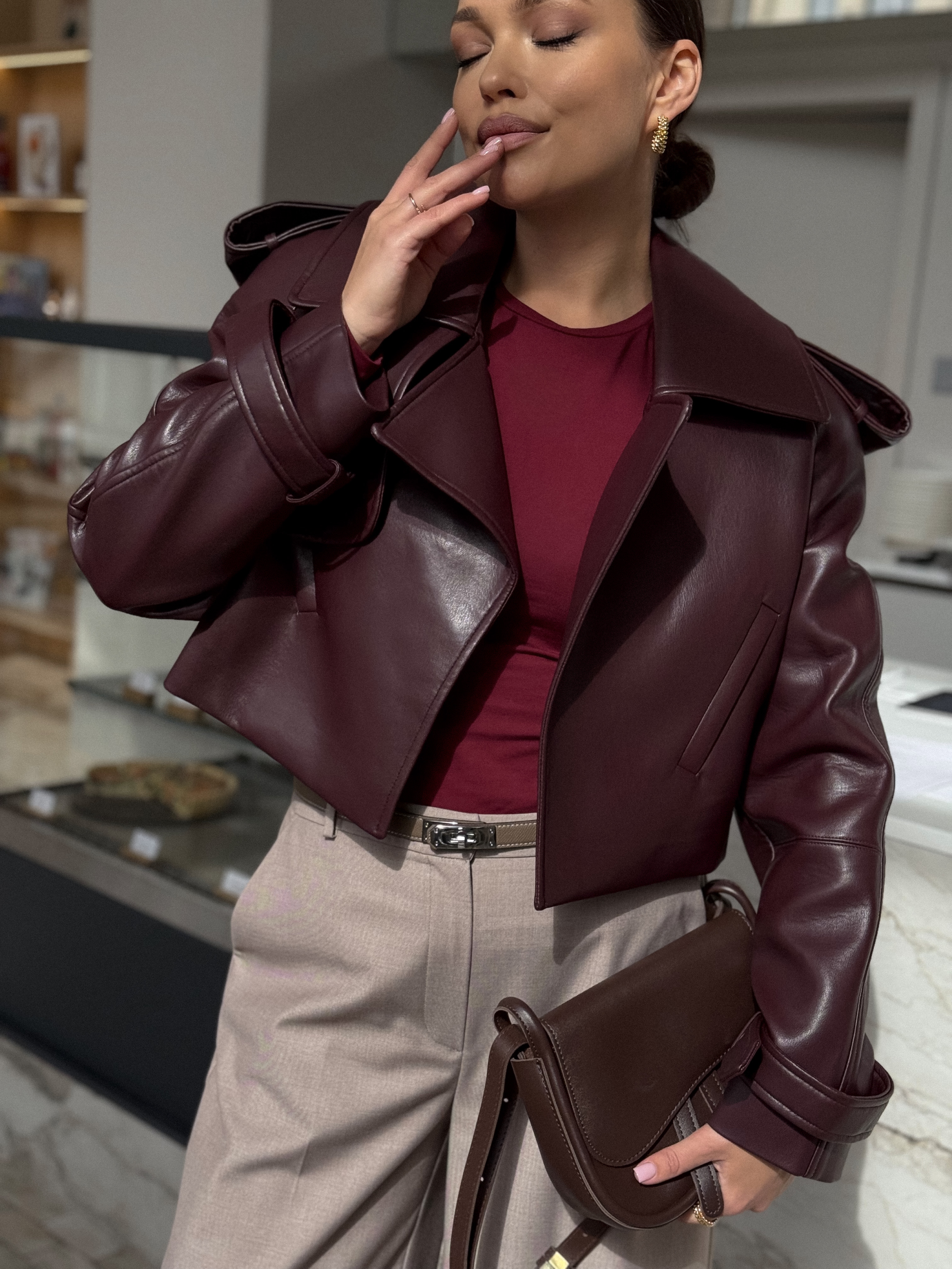 Тренчкот с широким лацканом, погонами на плечах , с поясом на талии , с двумя большими фронтальными карманами. На задней части тренчкота снизу имеется разрез.