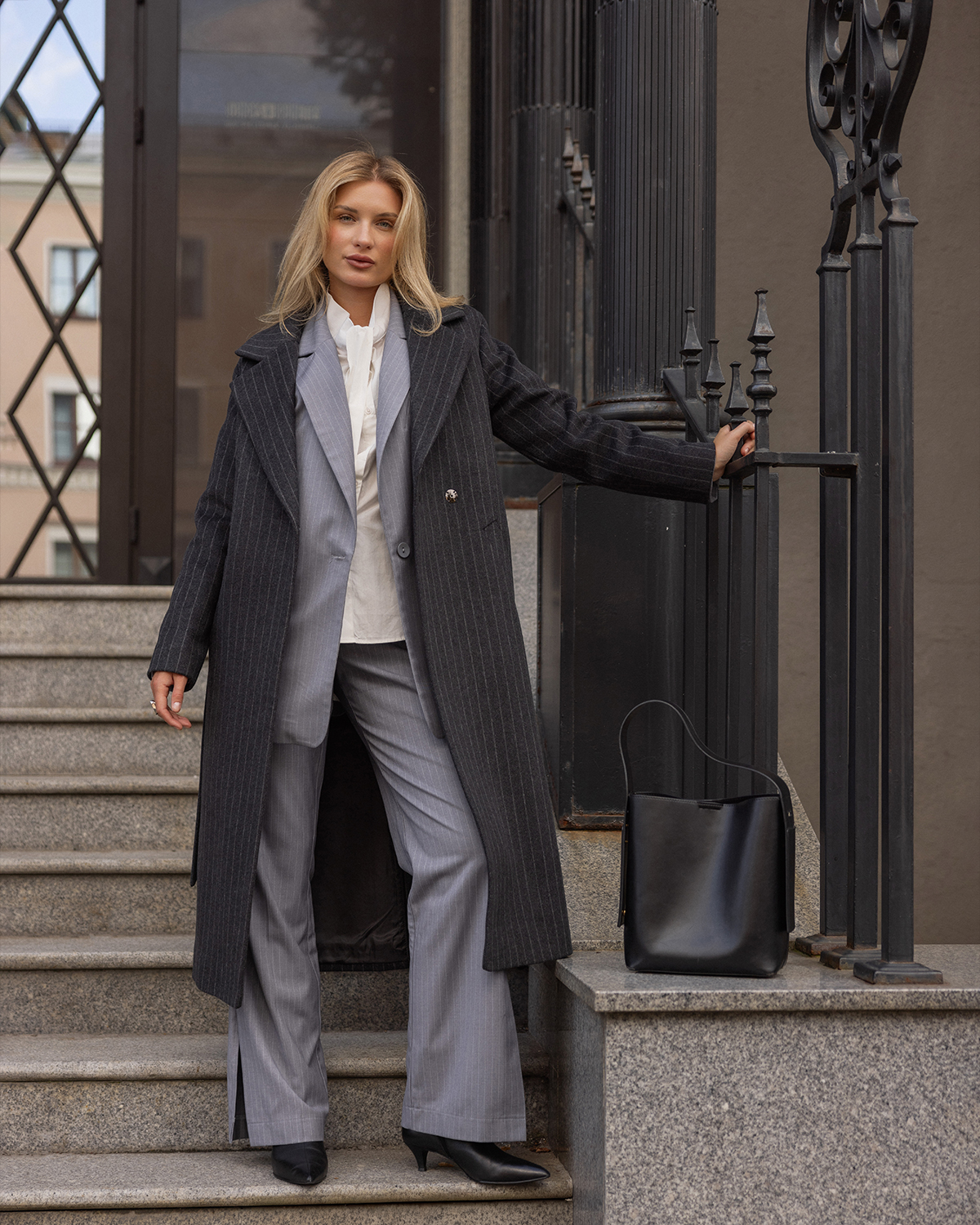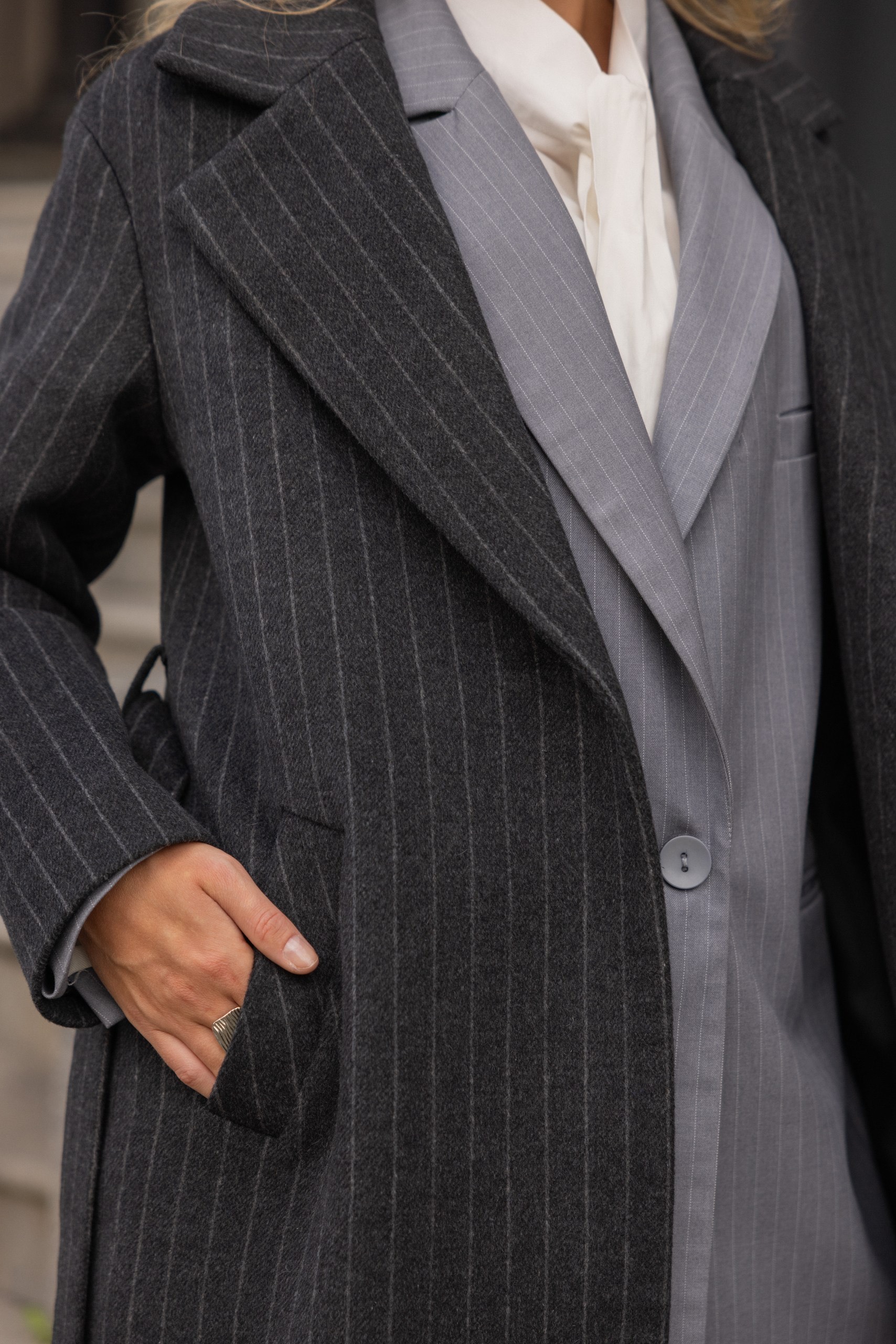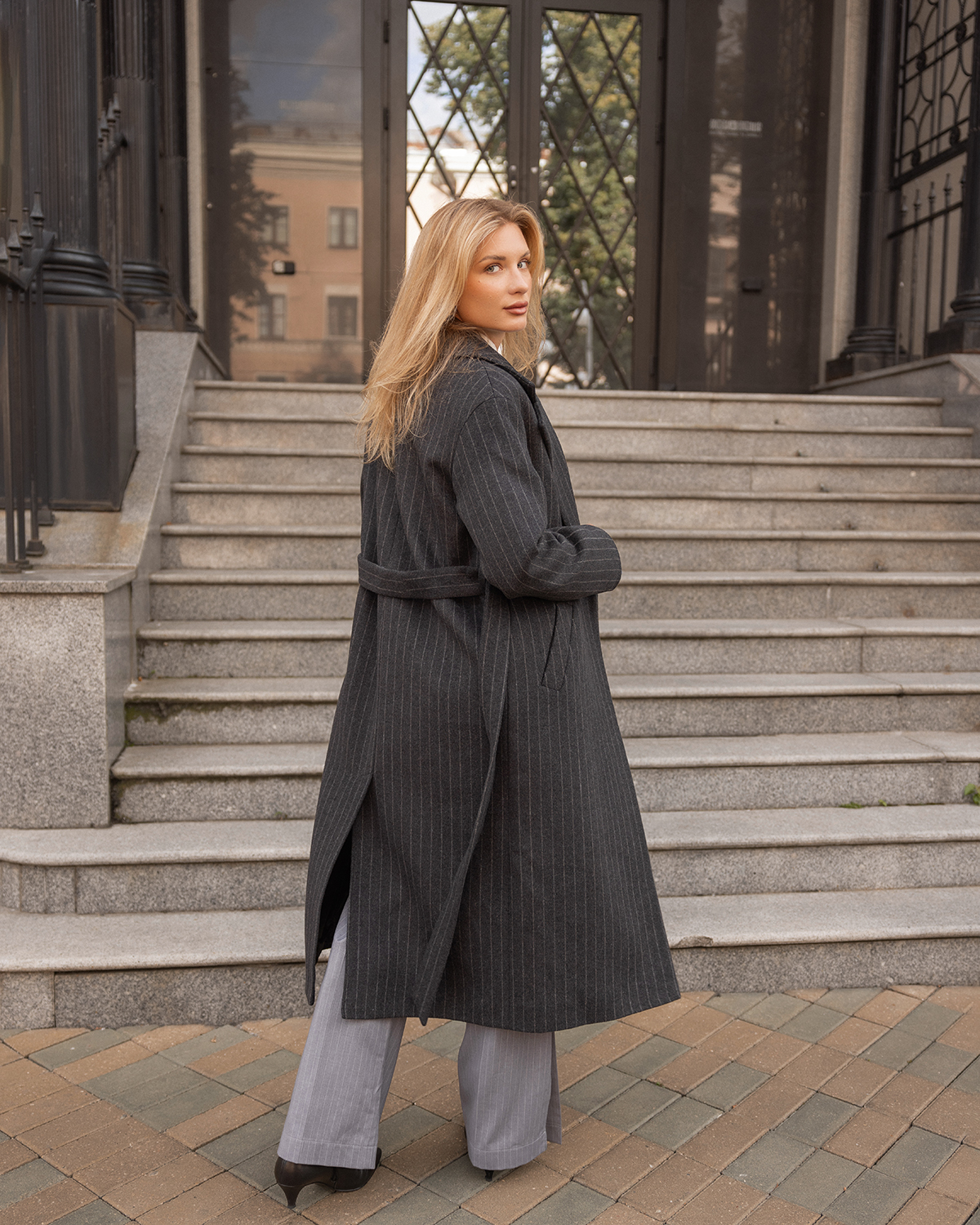 Пальто-халат в полоску, серый
