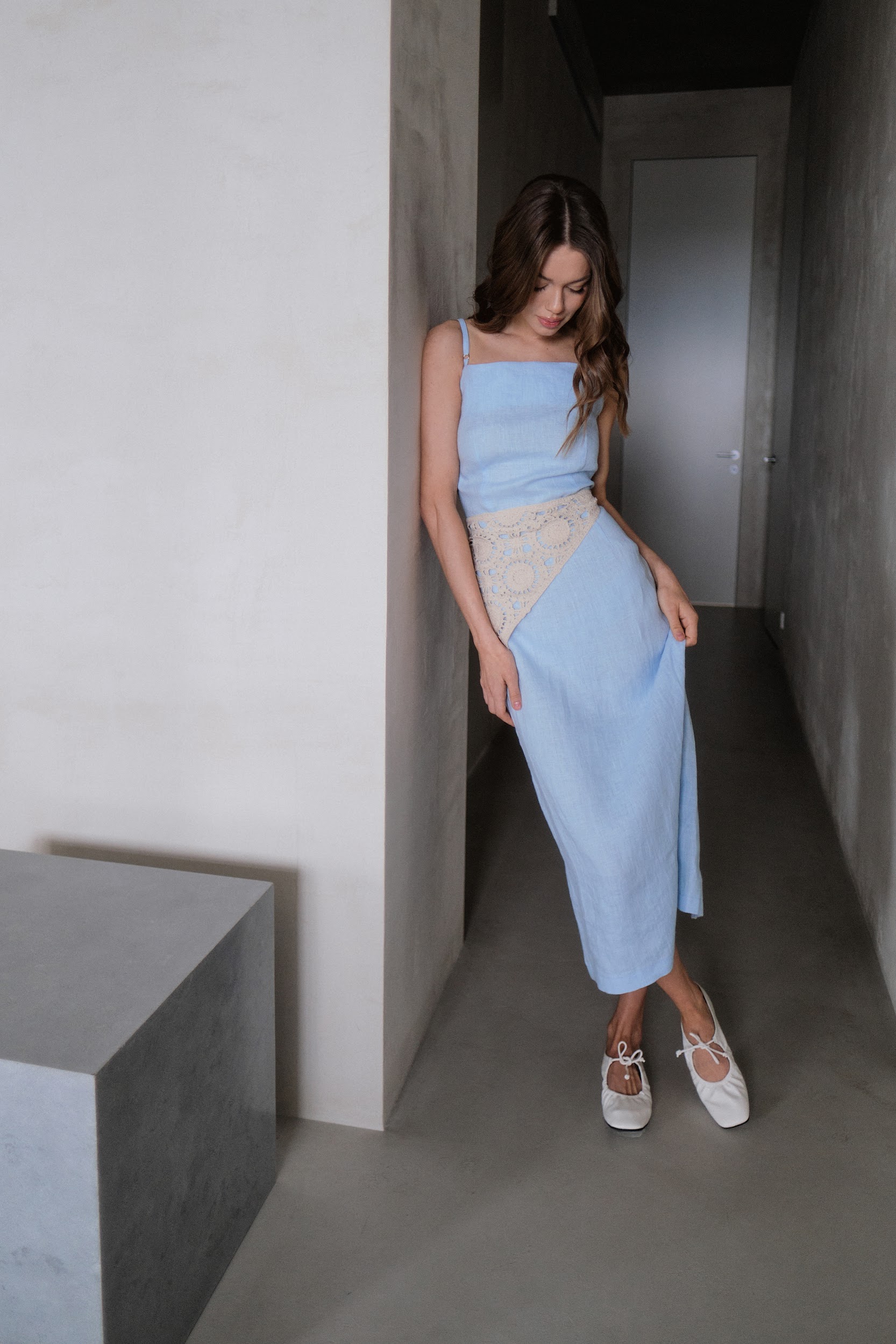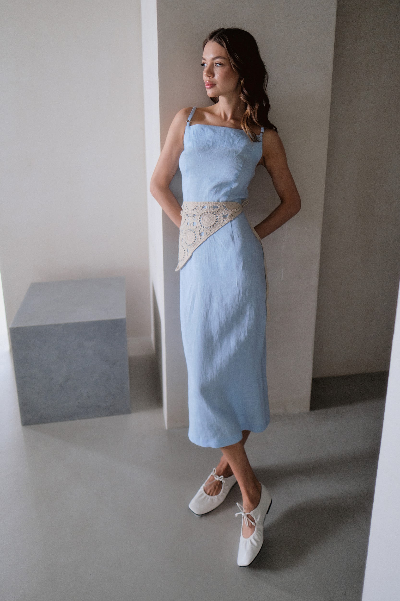 Льняной сарафан на тонких бретелях в голубом цвете