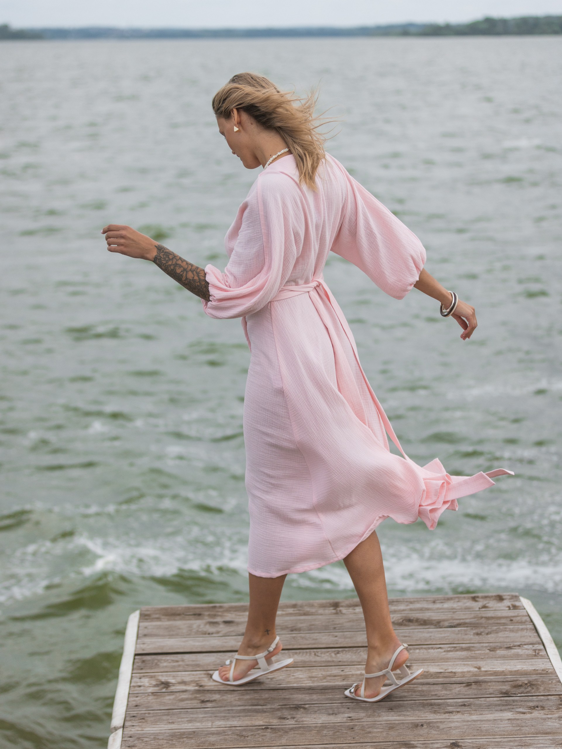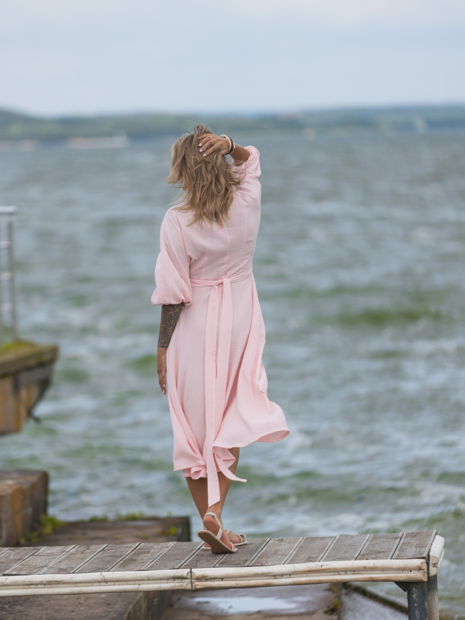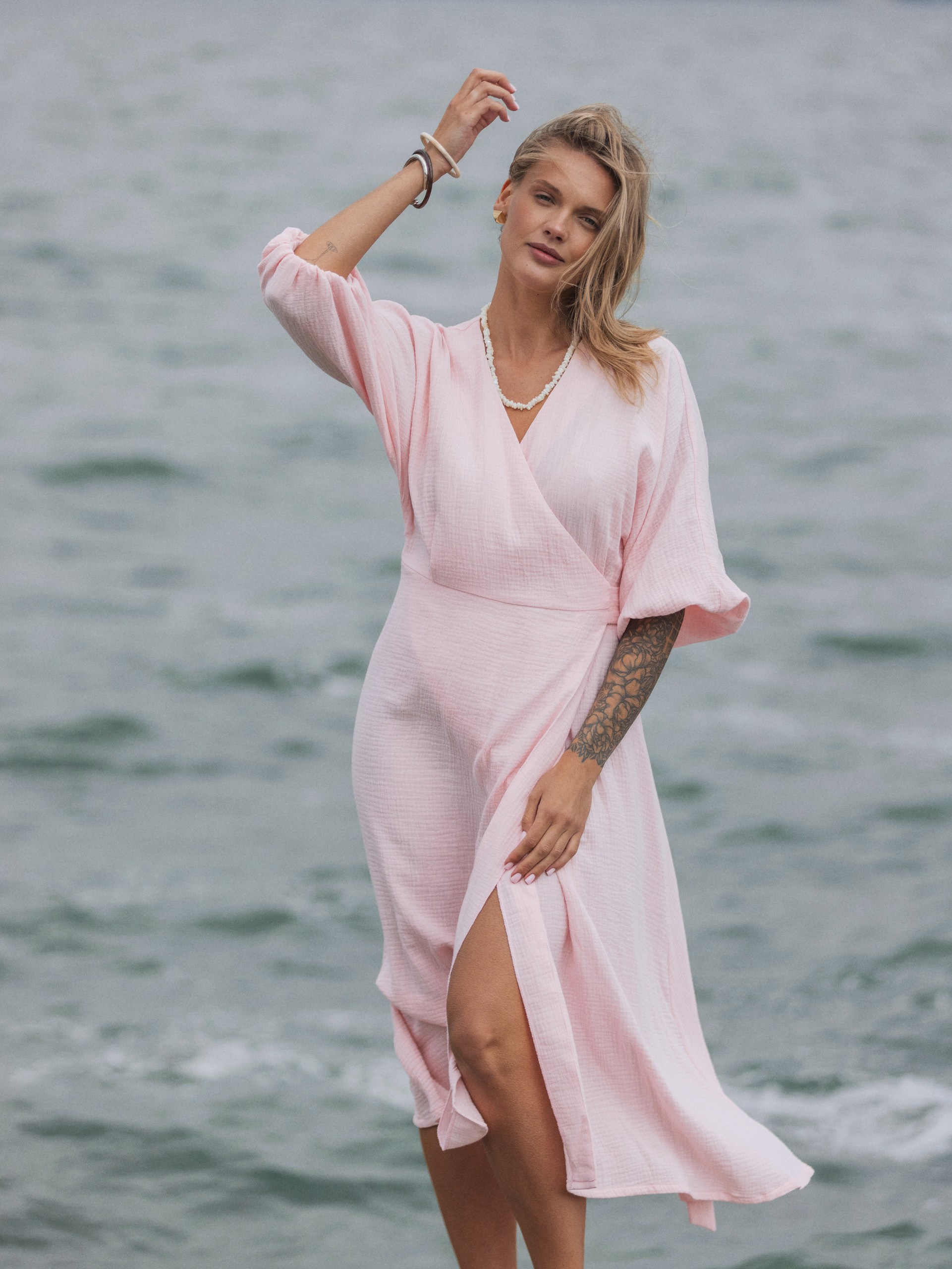 Платье из муслина с поясом на запах в розовом цвете