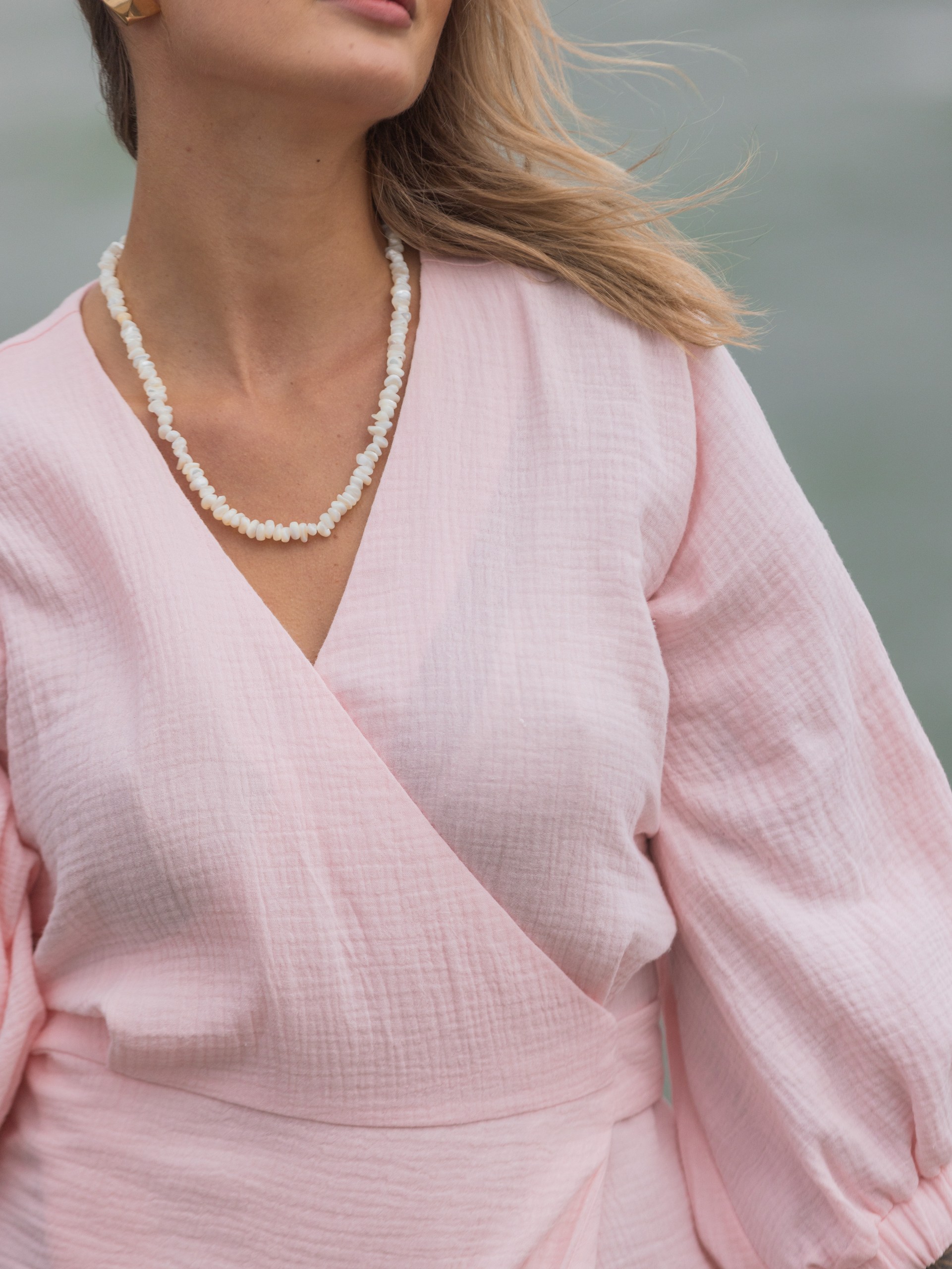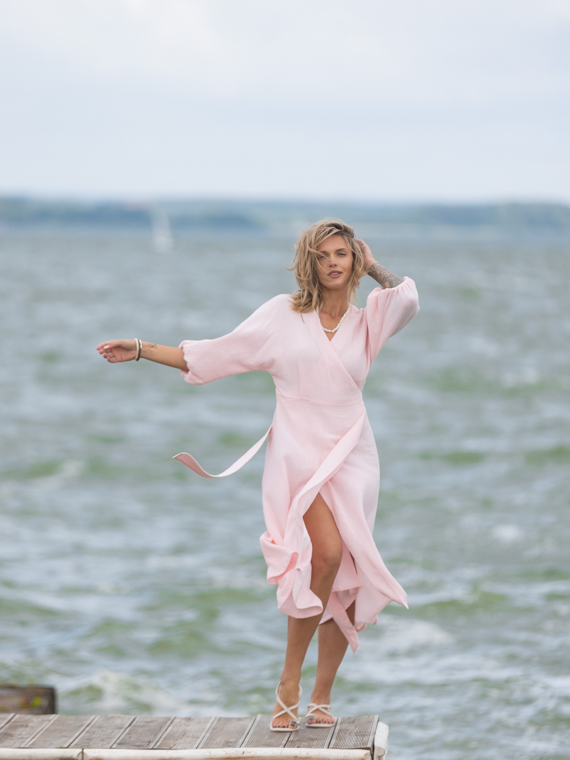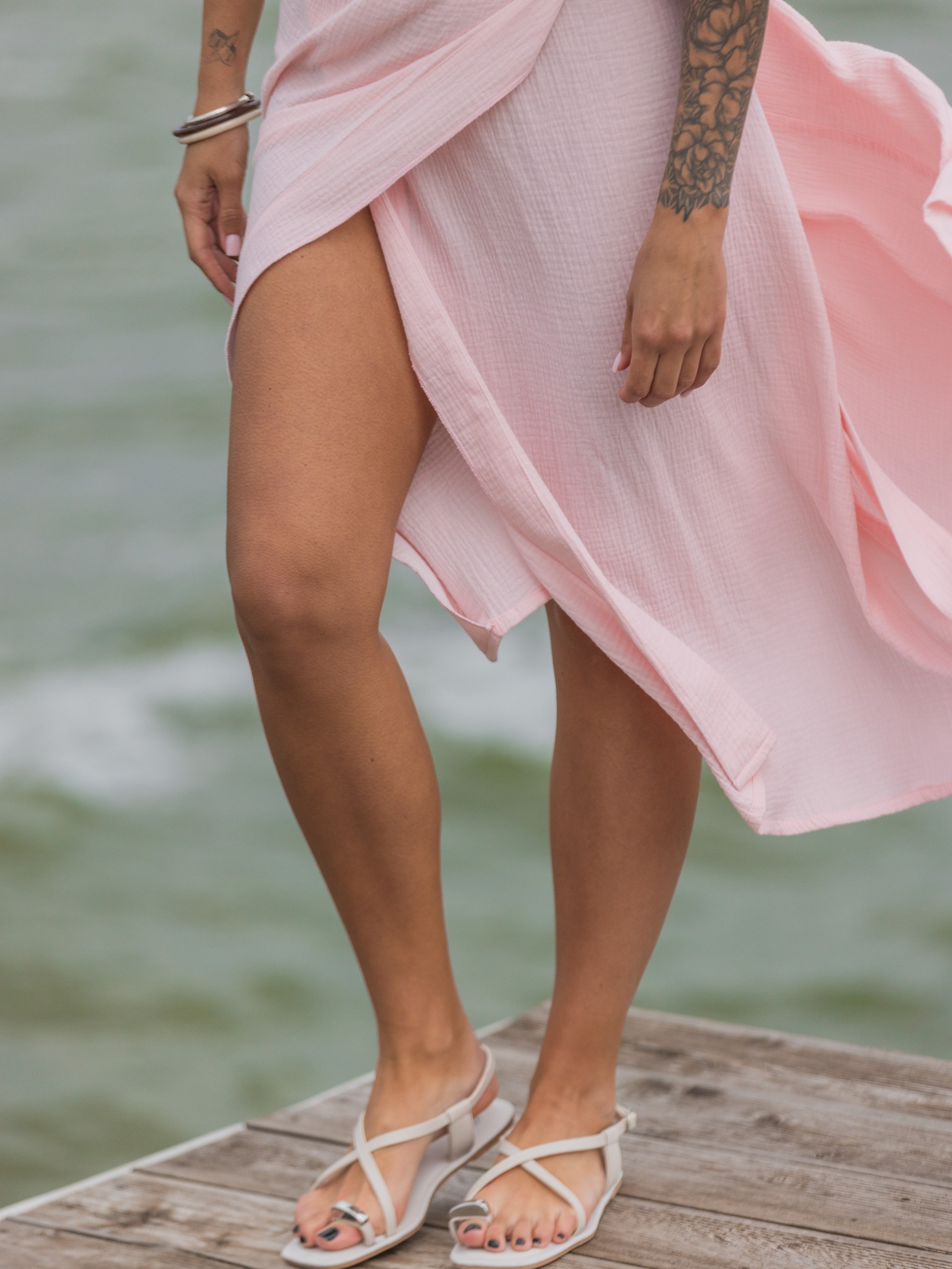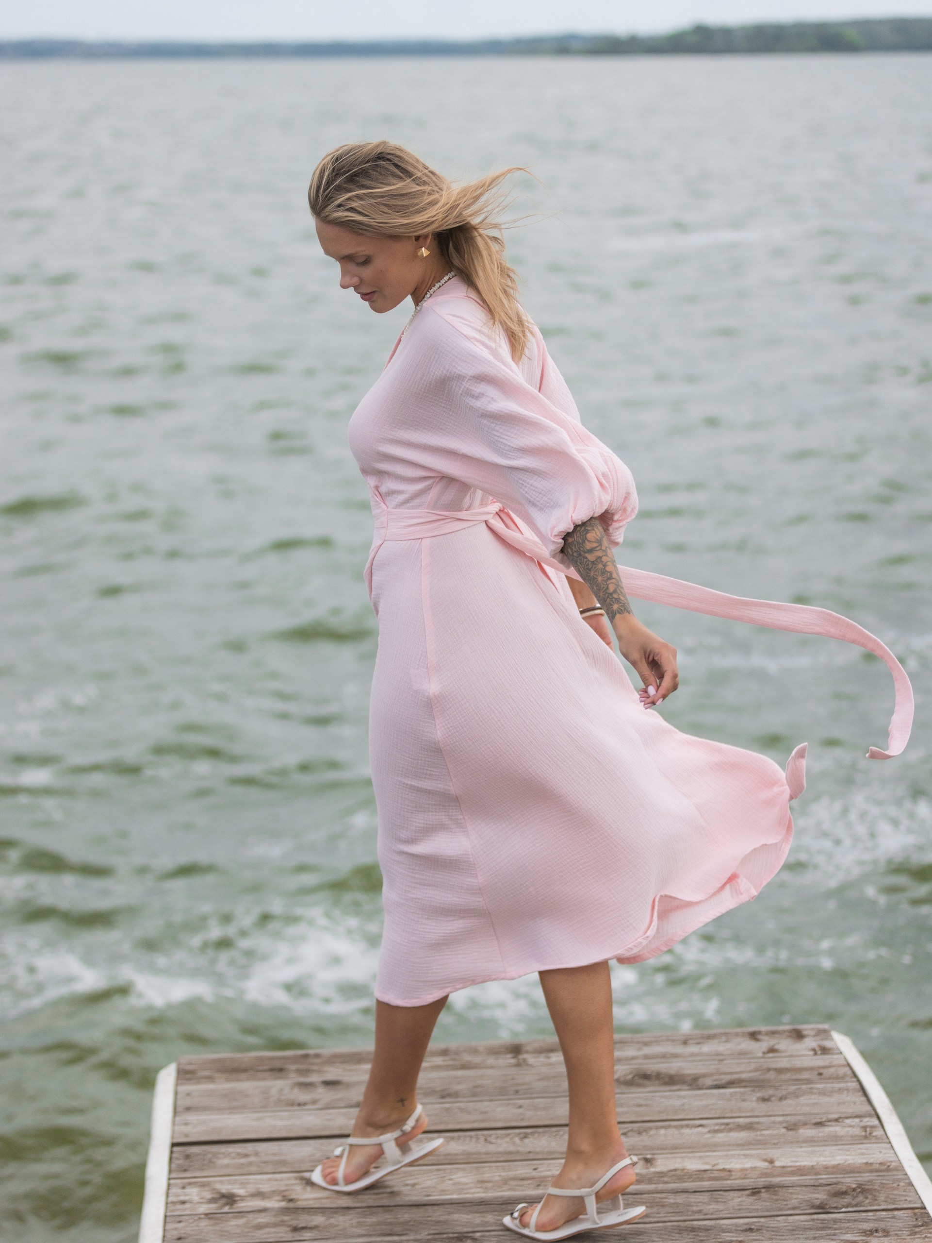 Платье из муслина с поясом на запах в розовом цвете