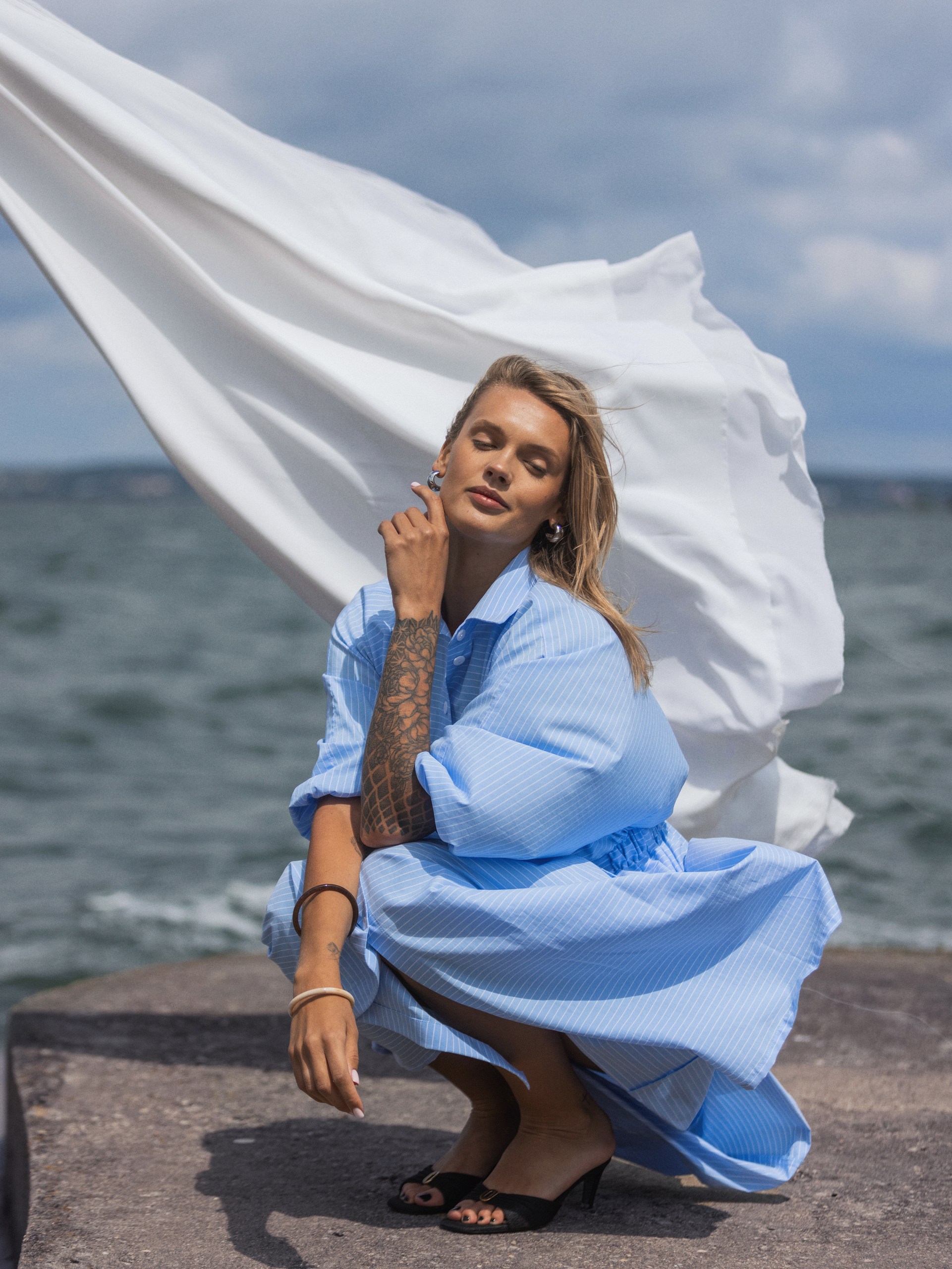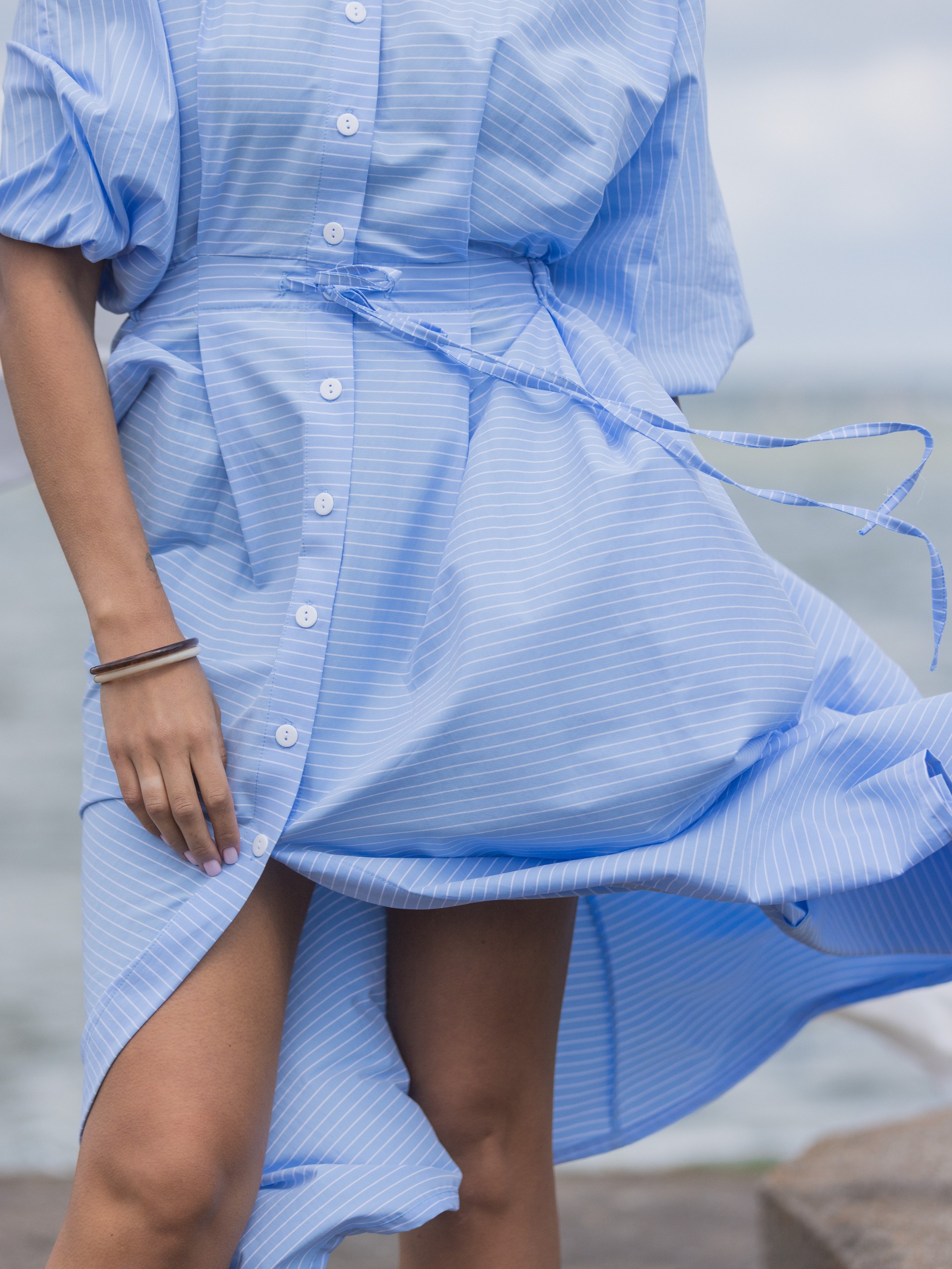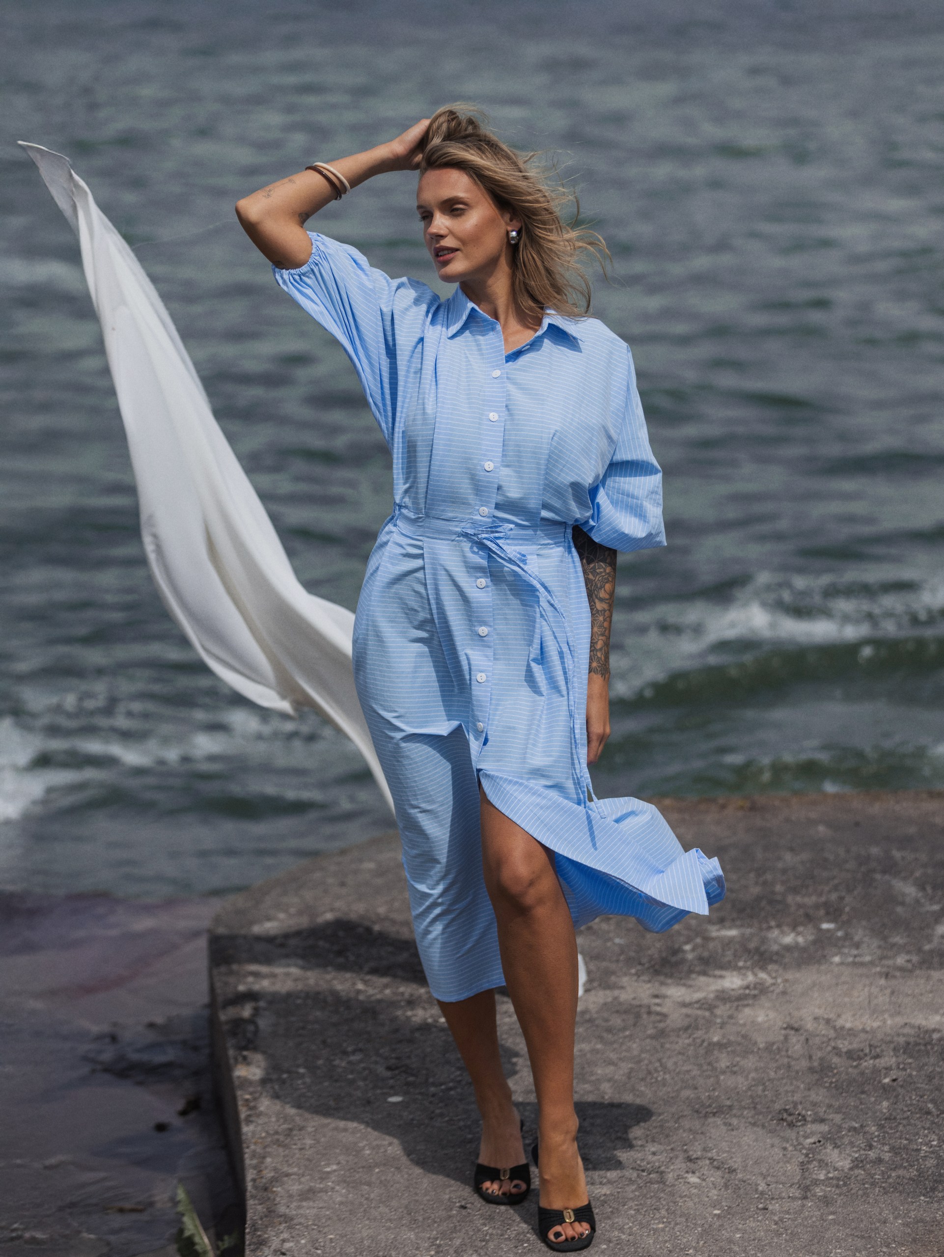 Платье-рубашка свободного кроя с рукавами буффами и резинкой на талии в голубом цвете в полоску