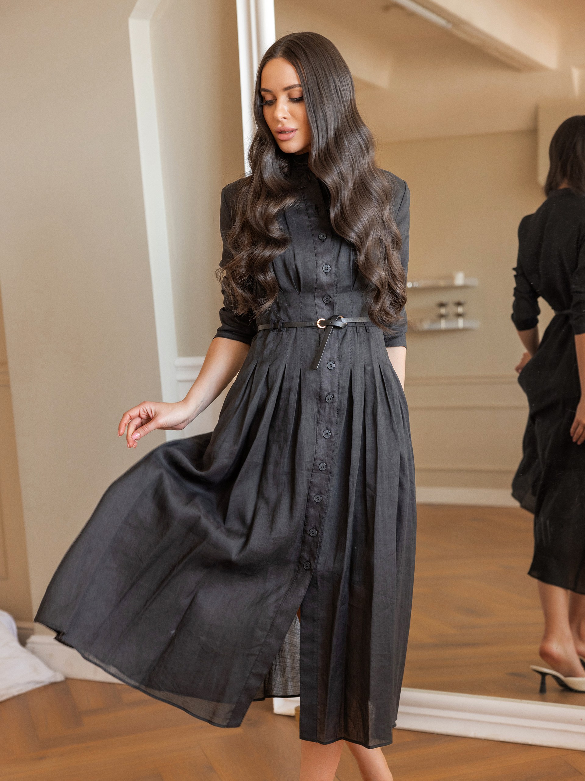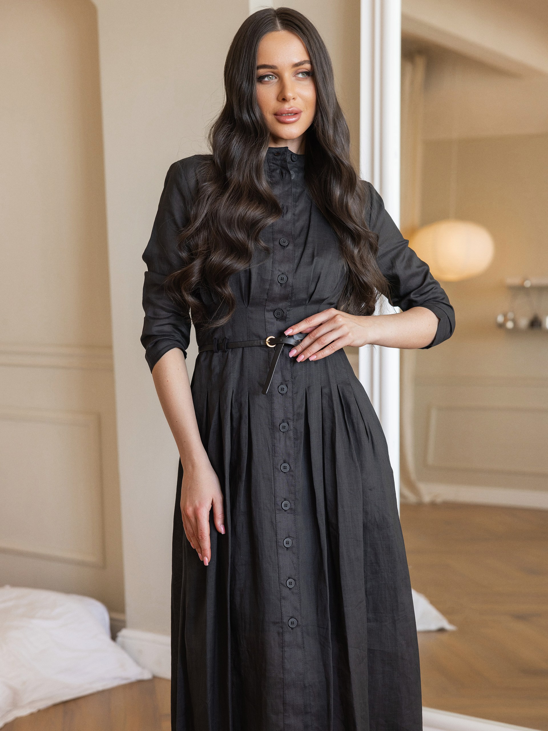 Платье имеет рукава три четверти, воротник-стойку и застегивается на пуговицы спереди. Также у платья есть пояс, который завязывается на талии. Имеются карманы , под платьем видно легкую подкладку, которая выглядит как нижнее платье или комбинация, что делает его более непрозрачным и удобным для ношения.