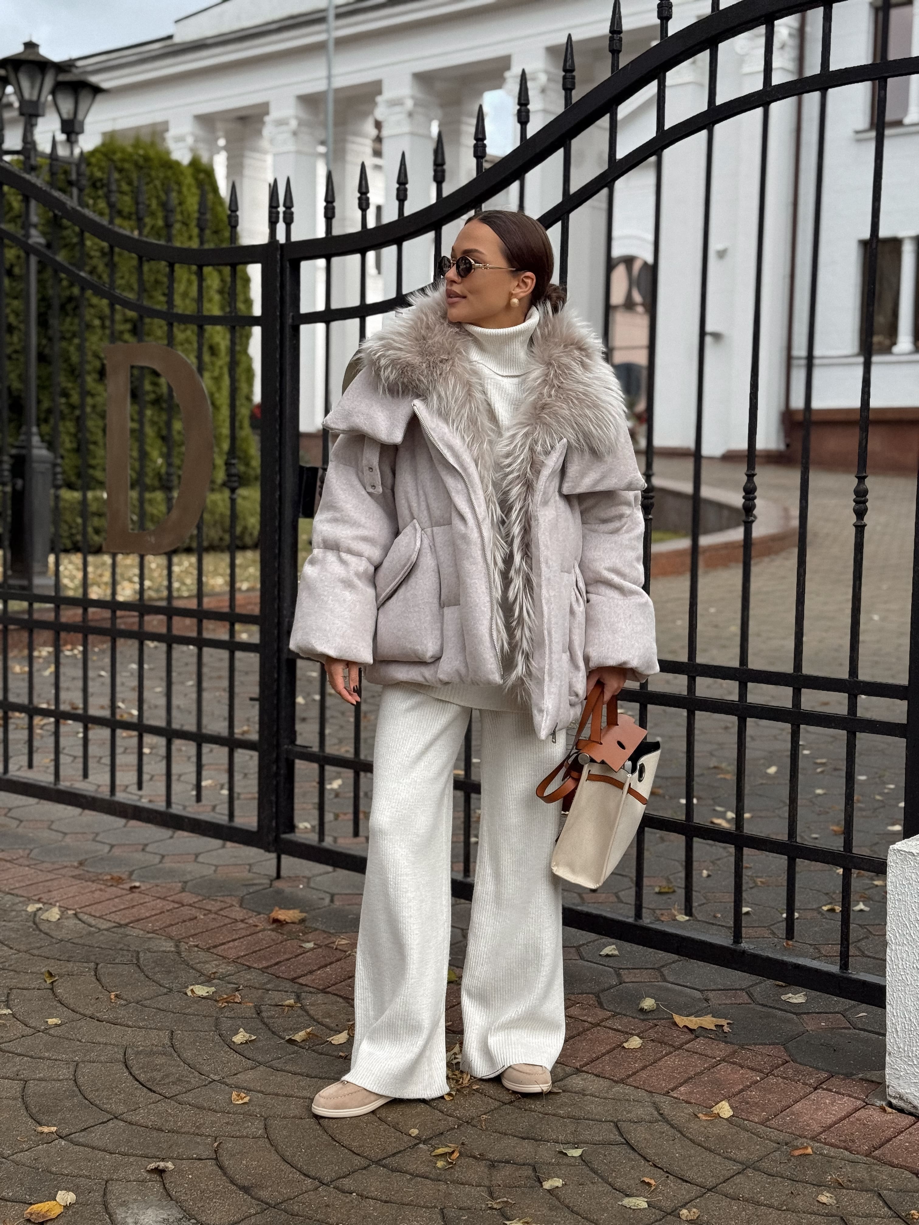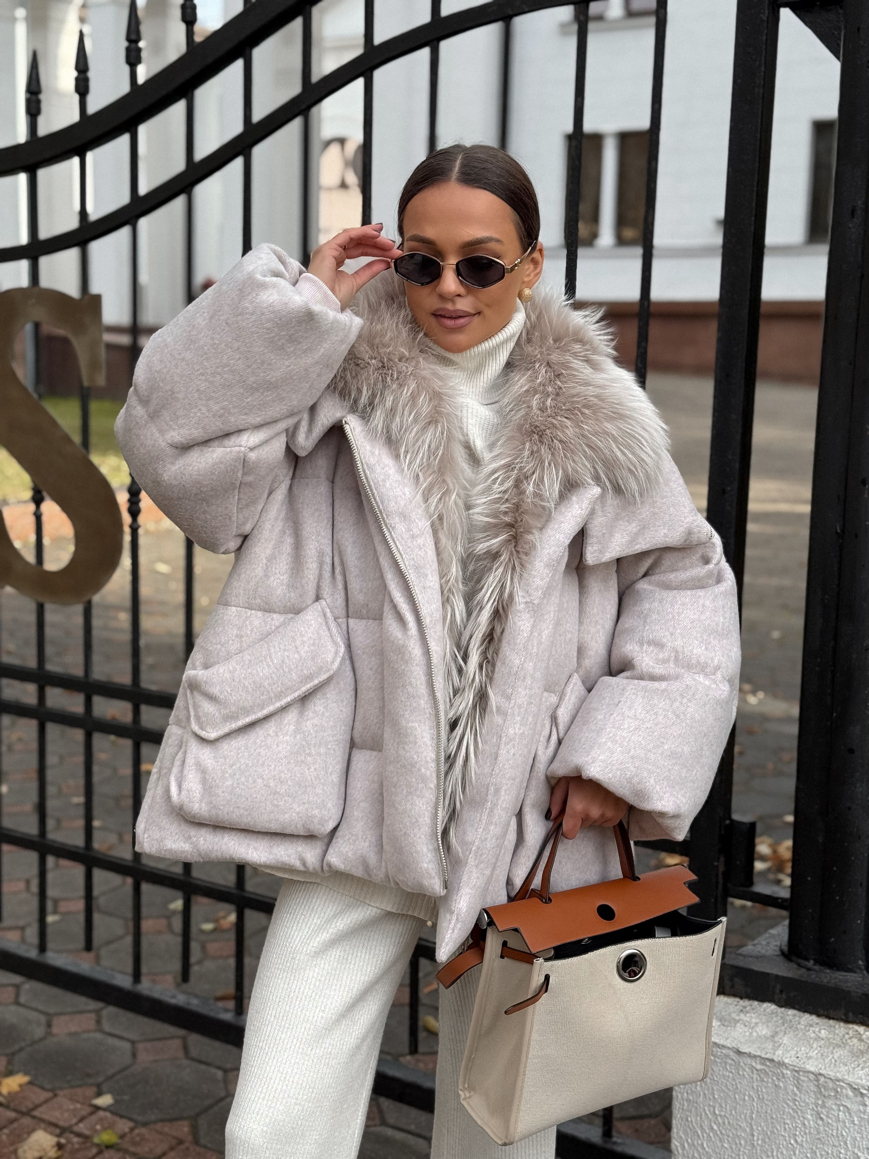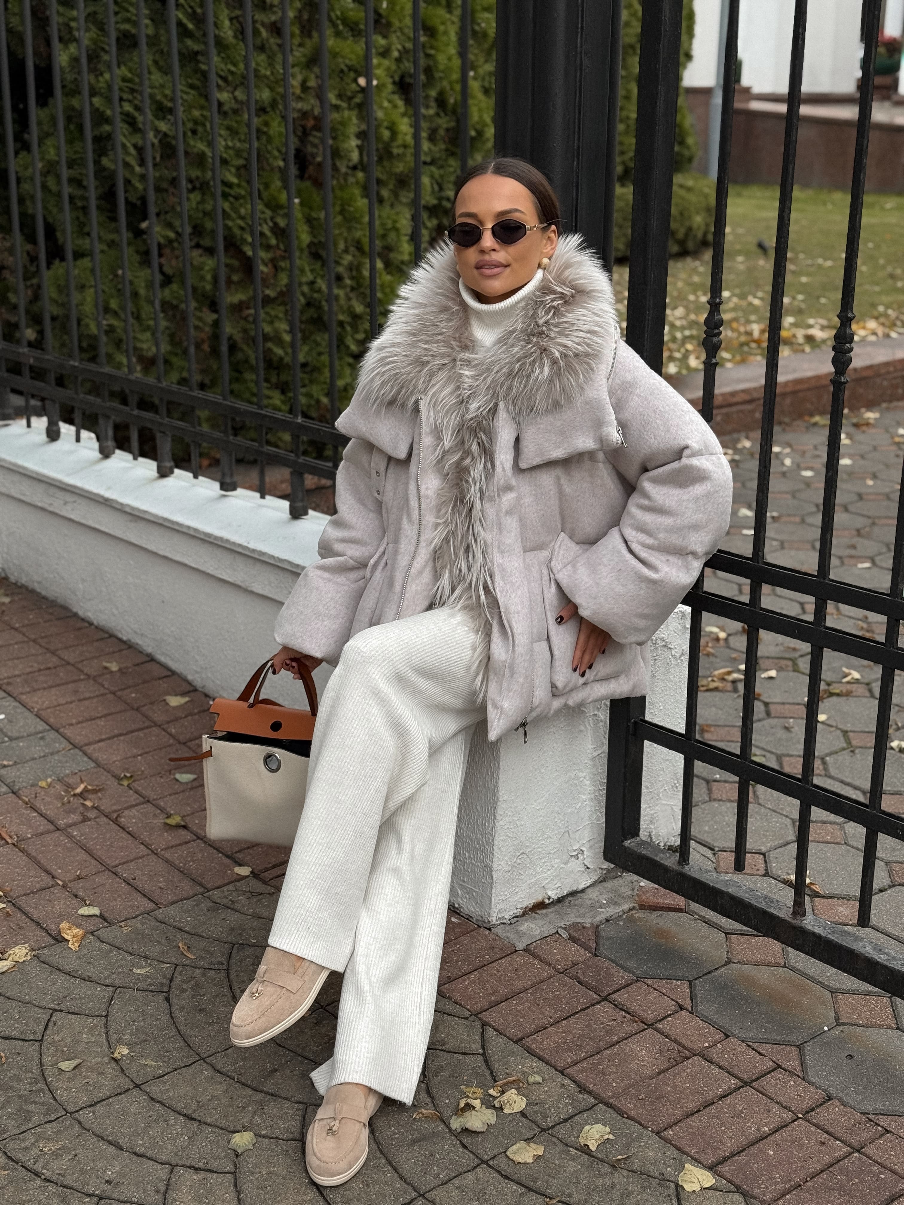 Пуховик с мехом лисы из мохера, белый