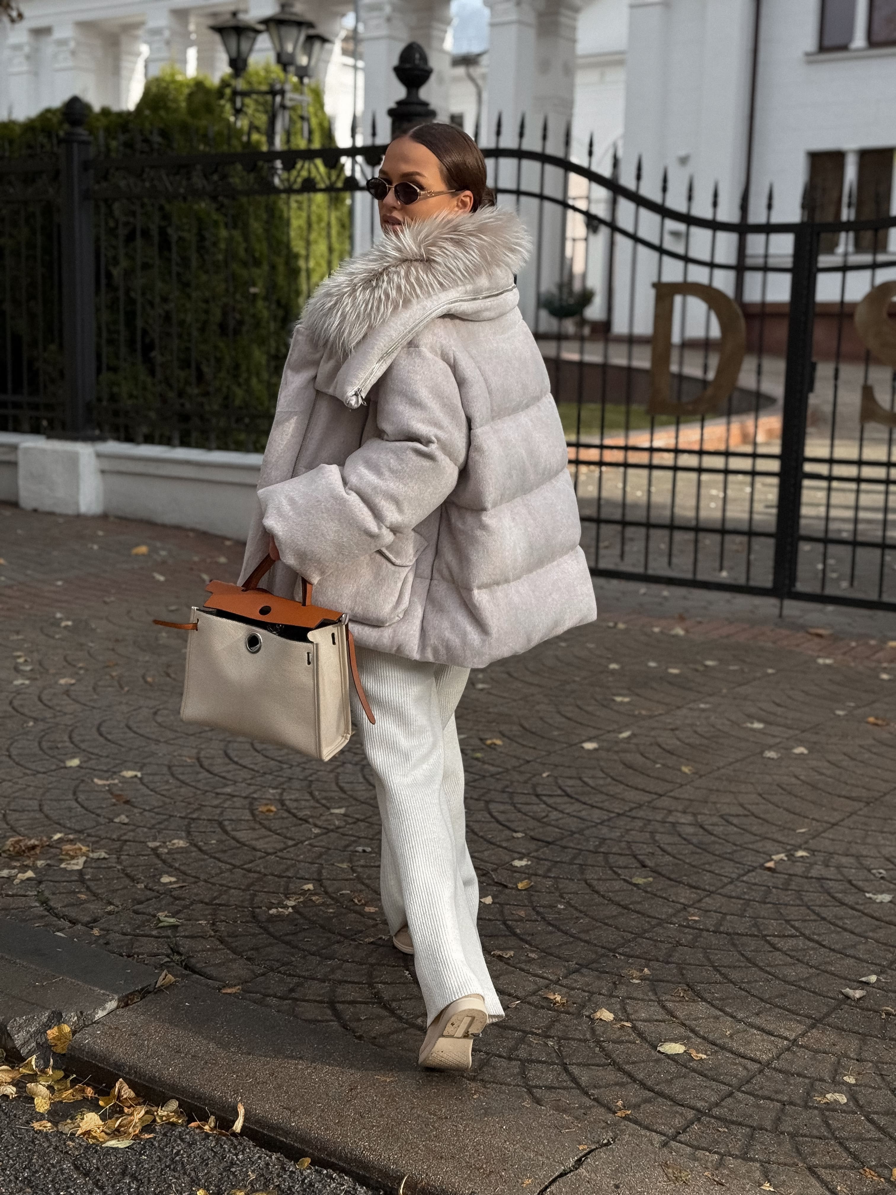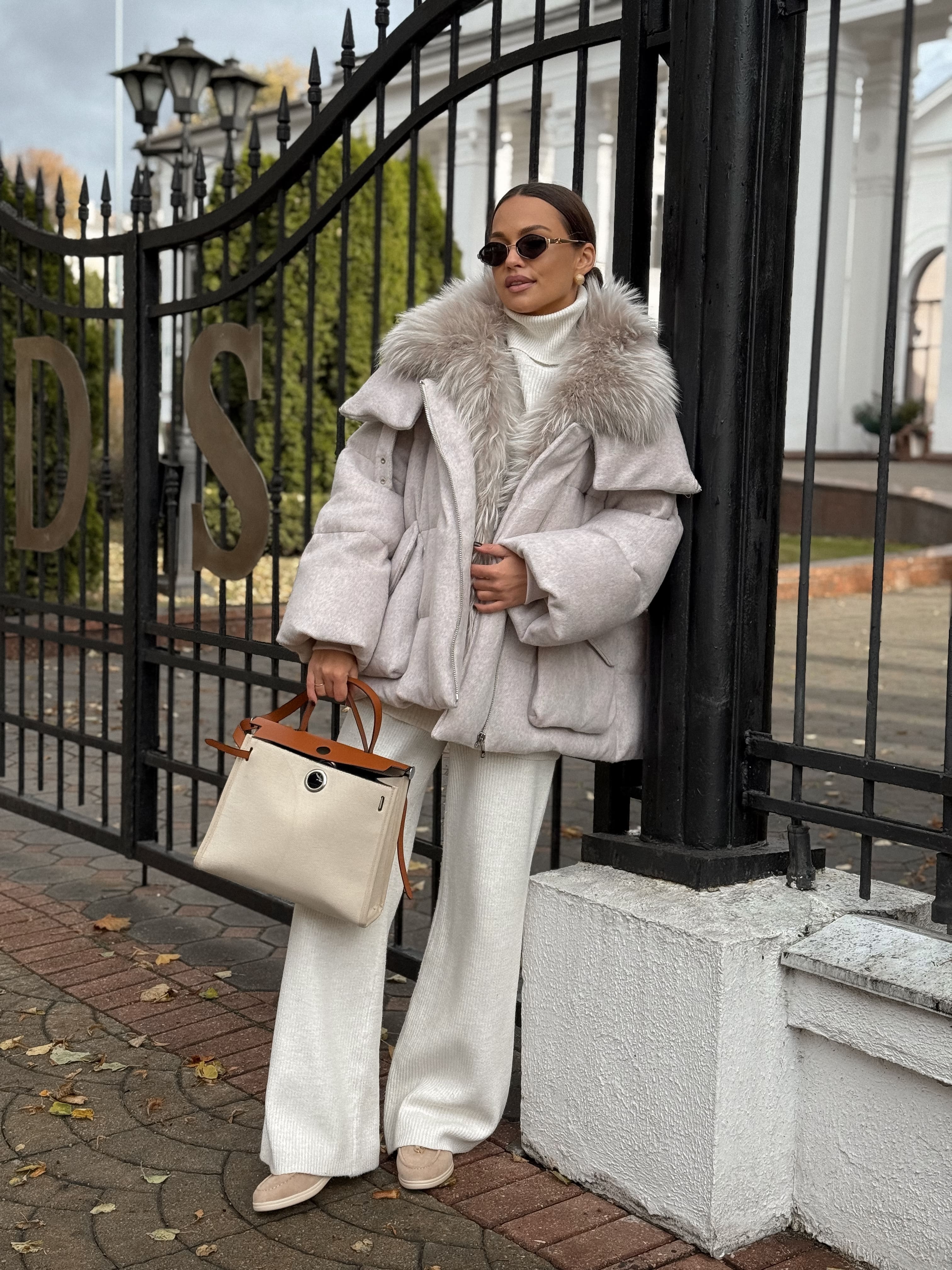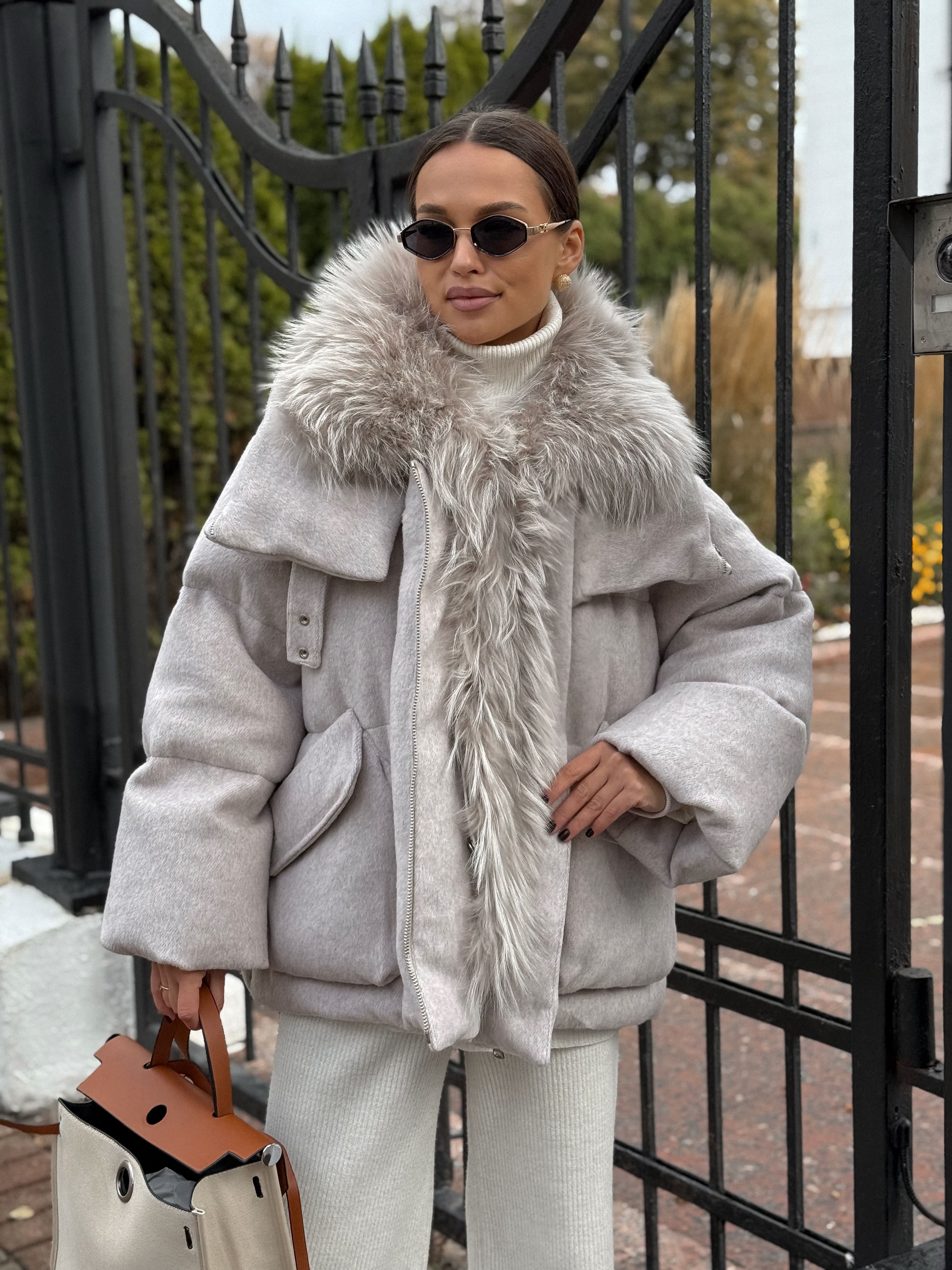 Пуховик с мехом лисы из мохера, белый