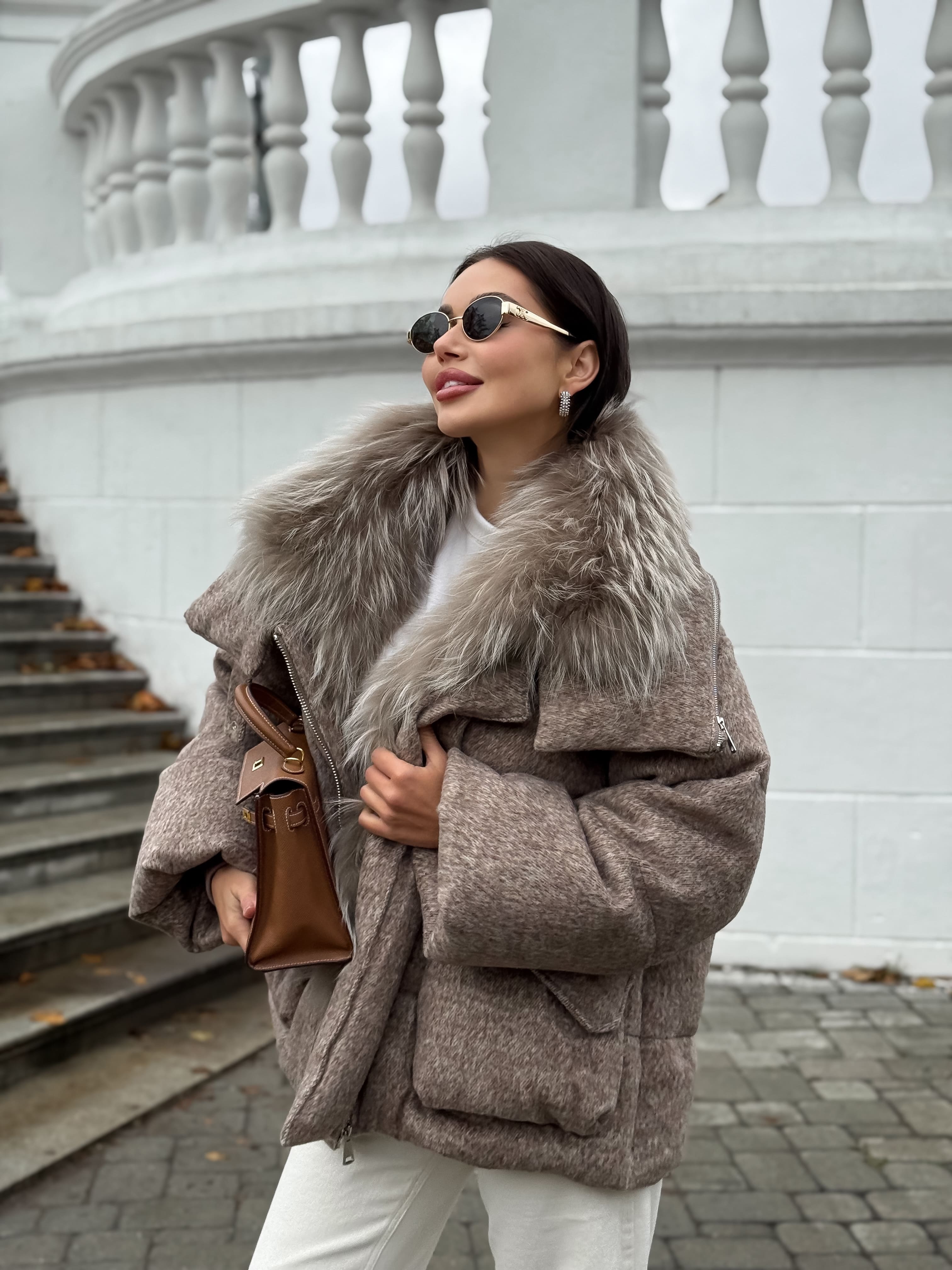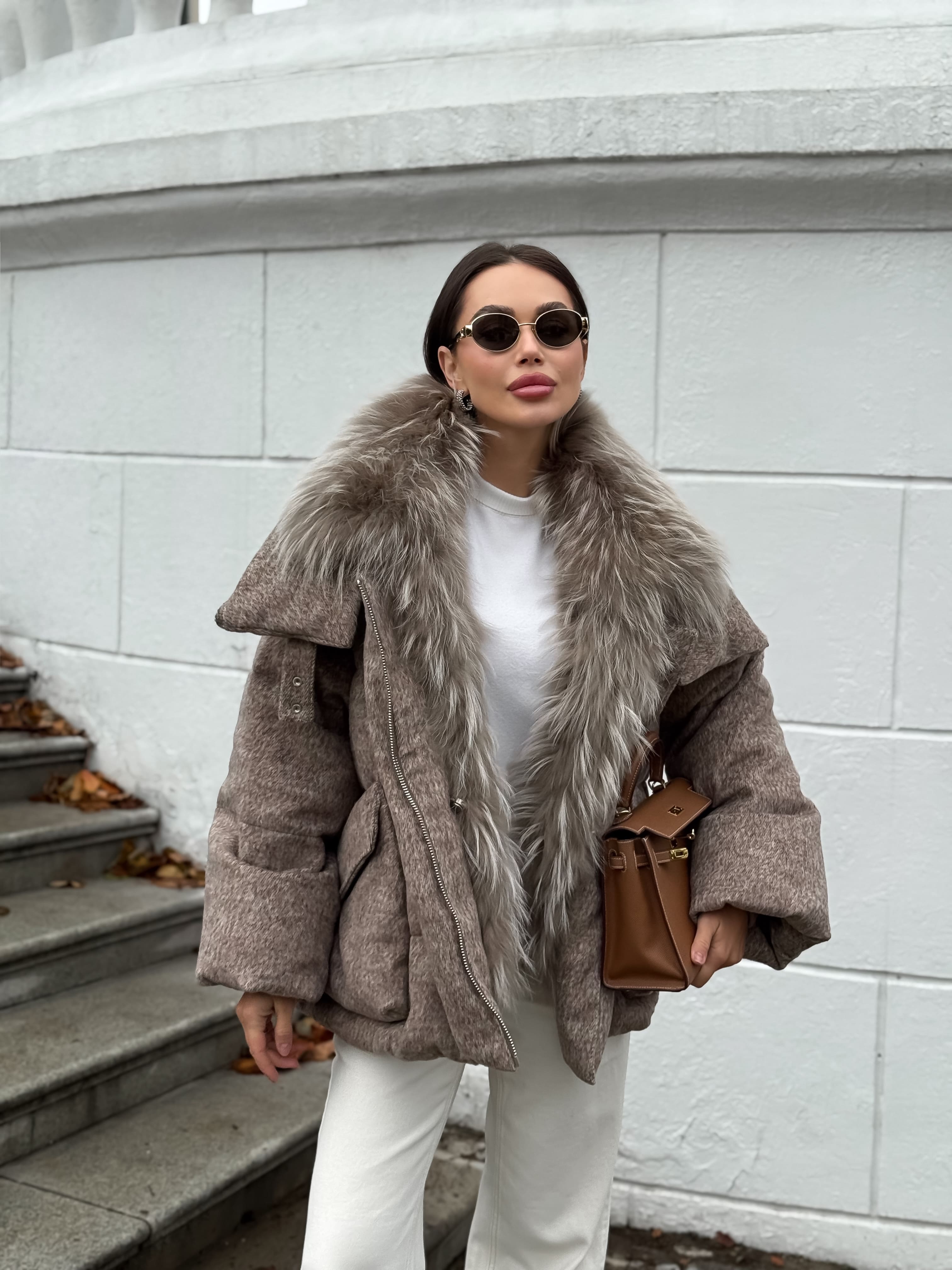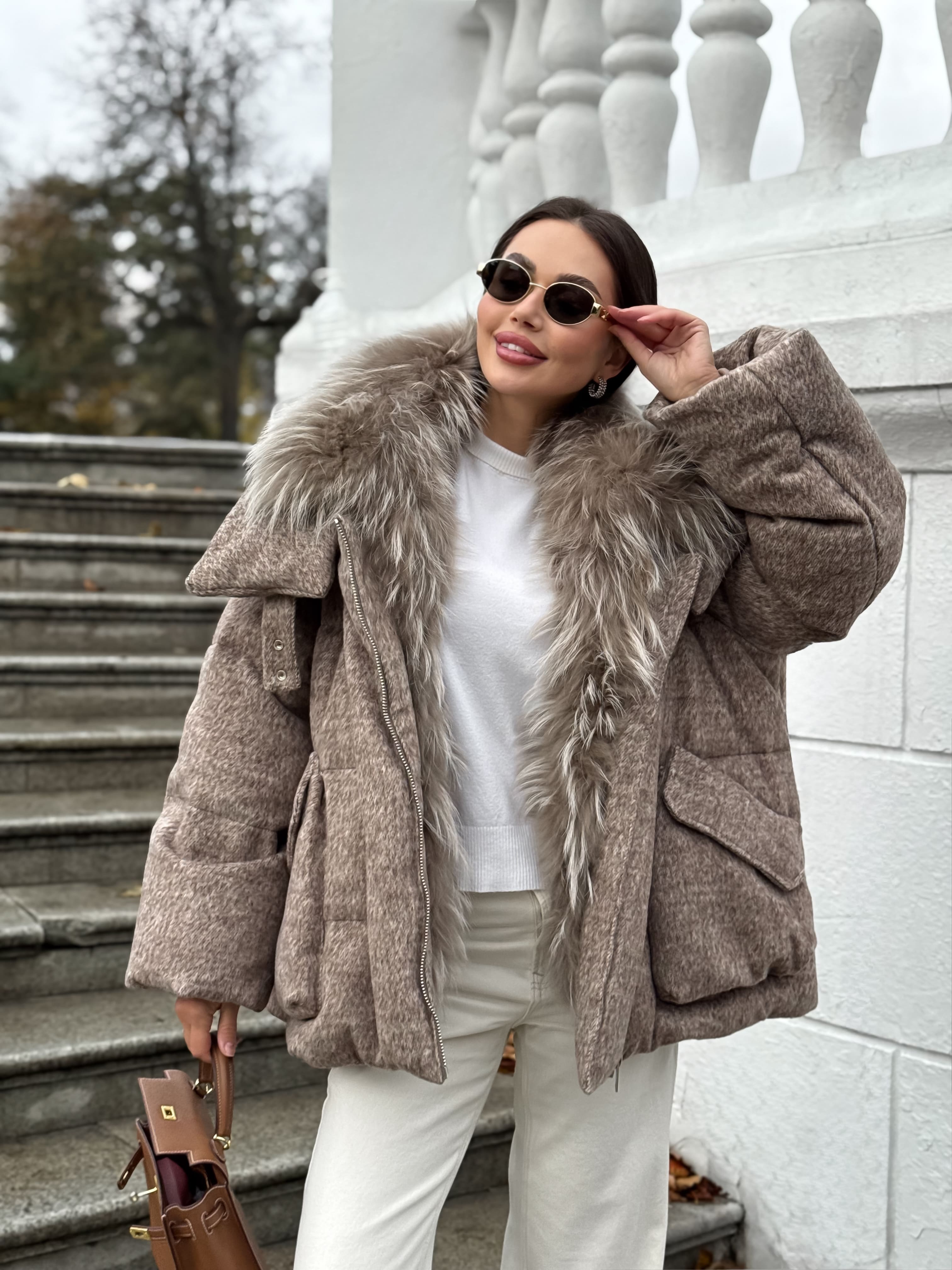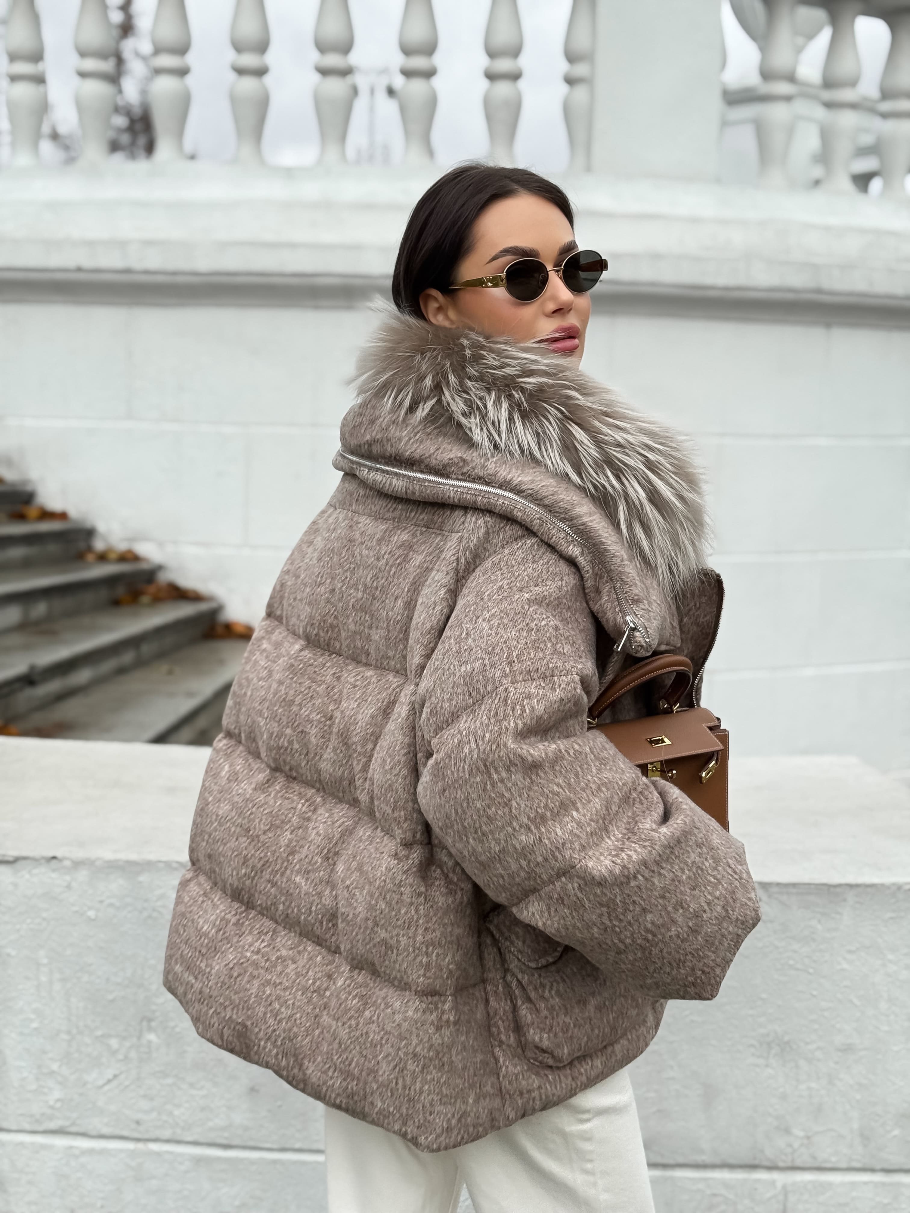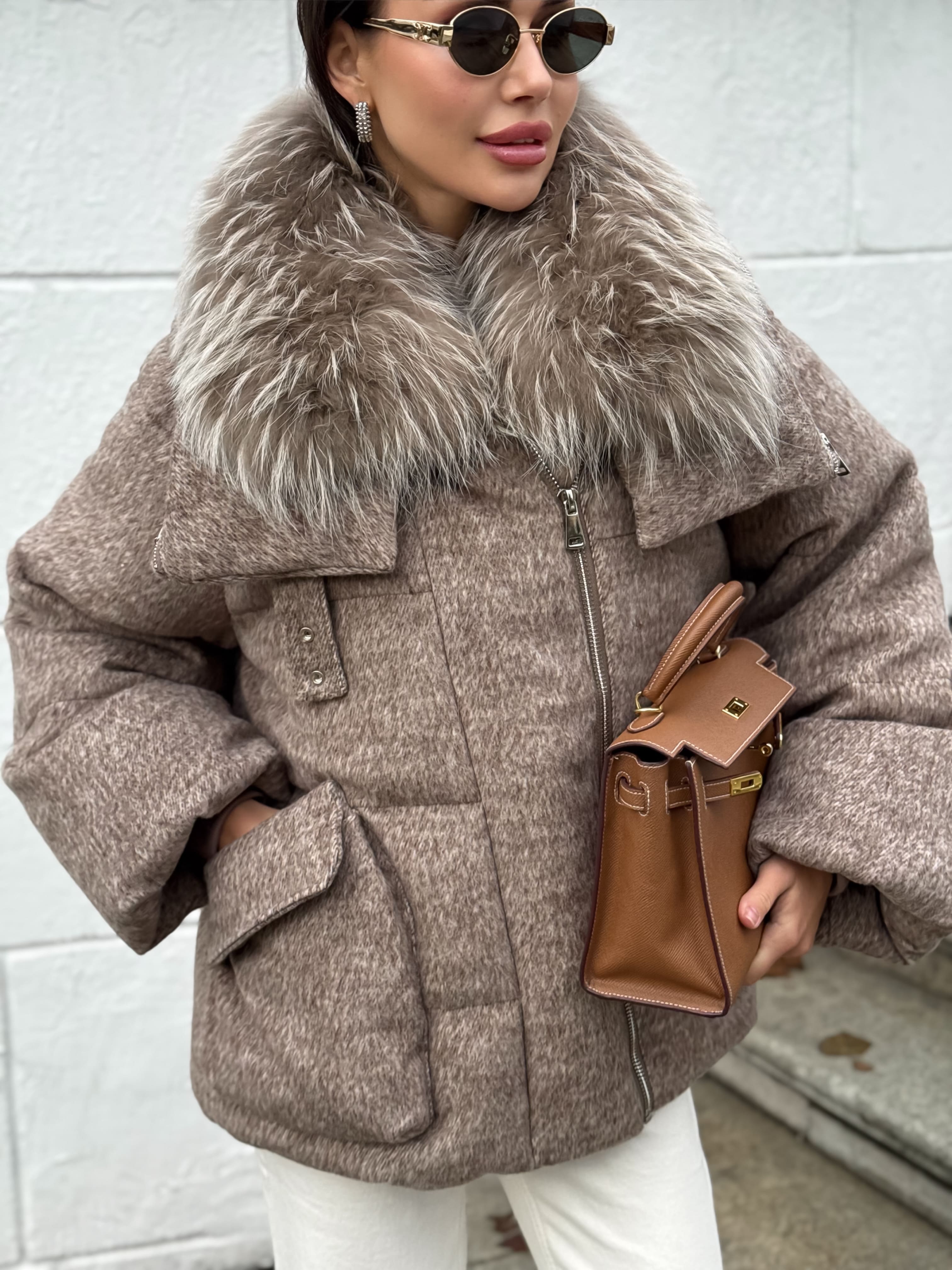 Пуховик с мехом лисы из мохера, кофейный