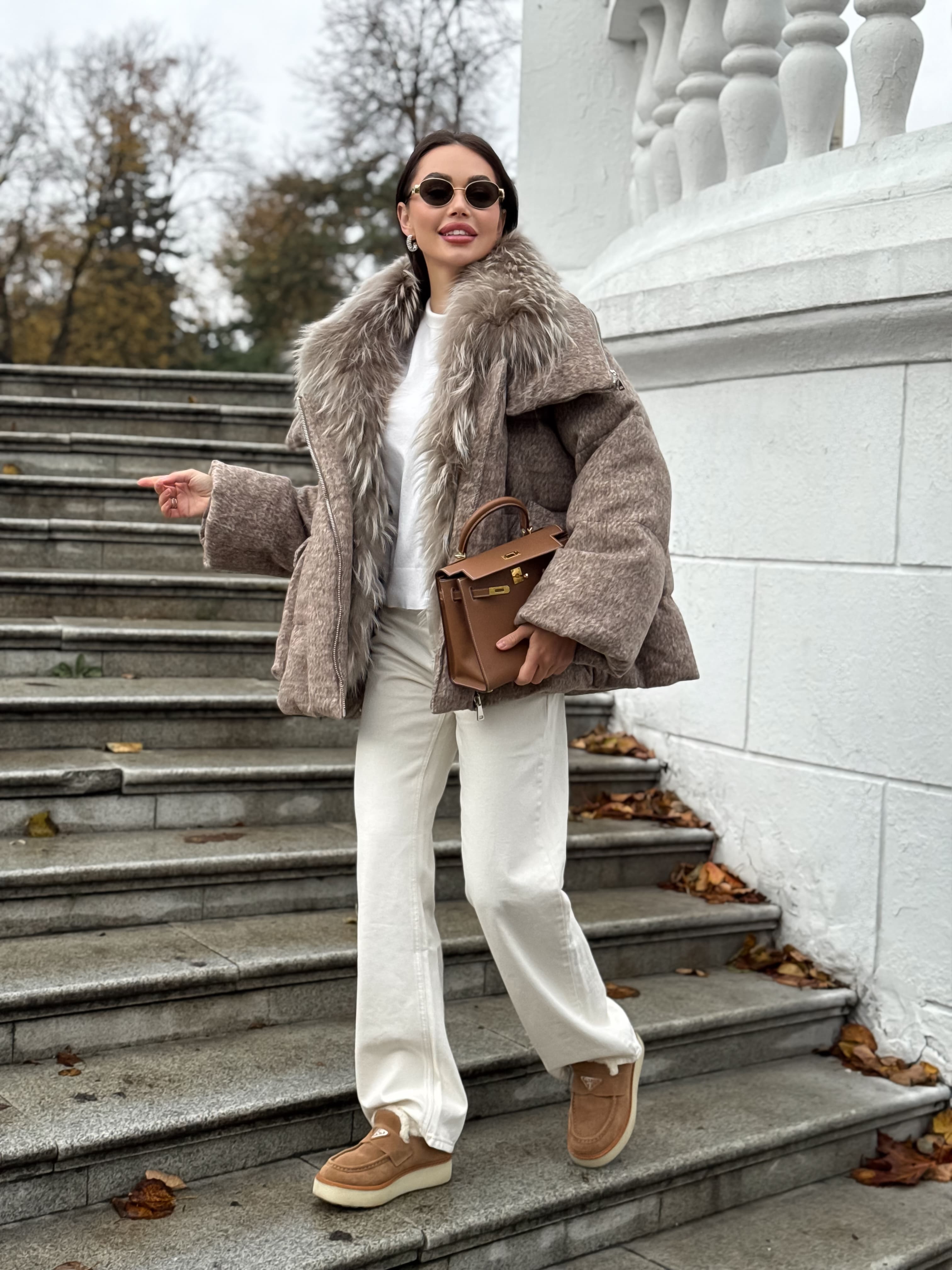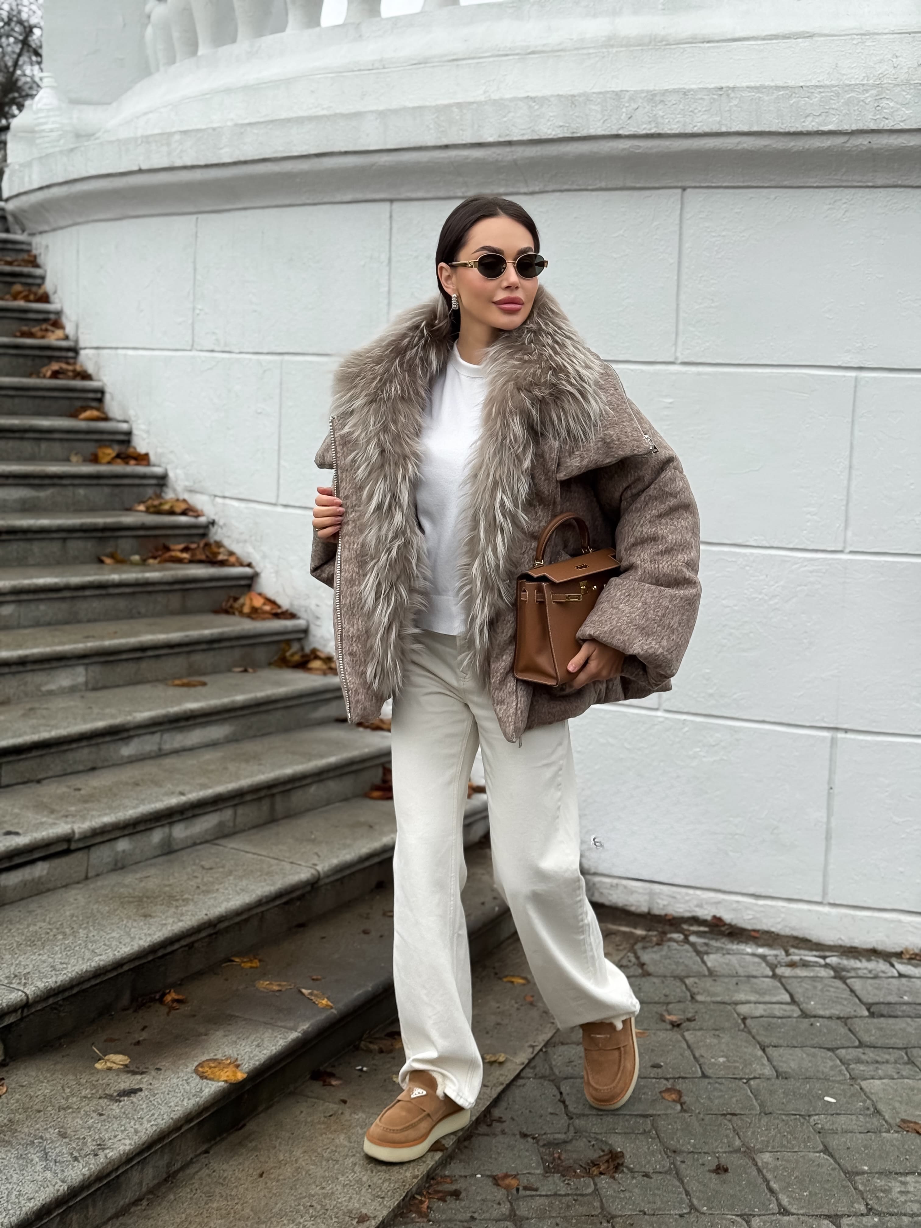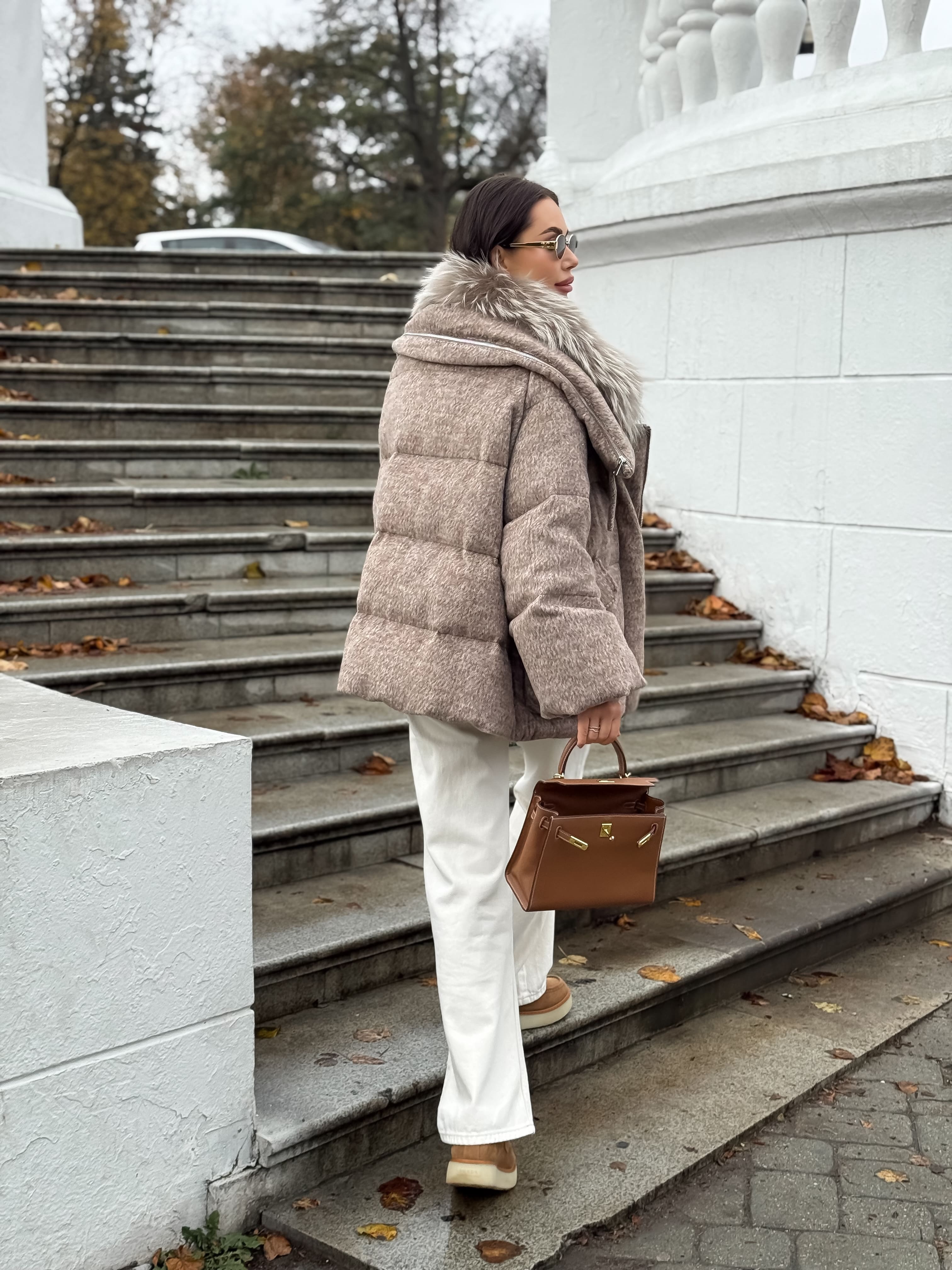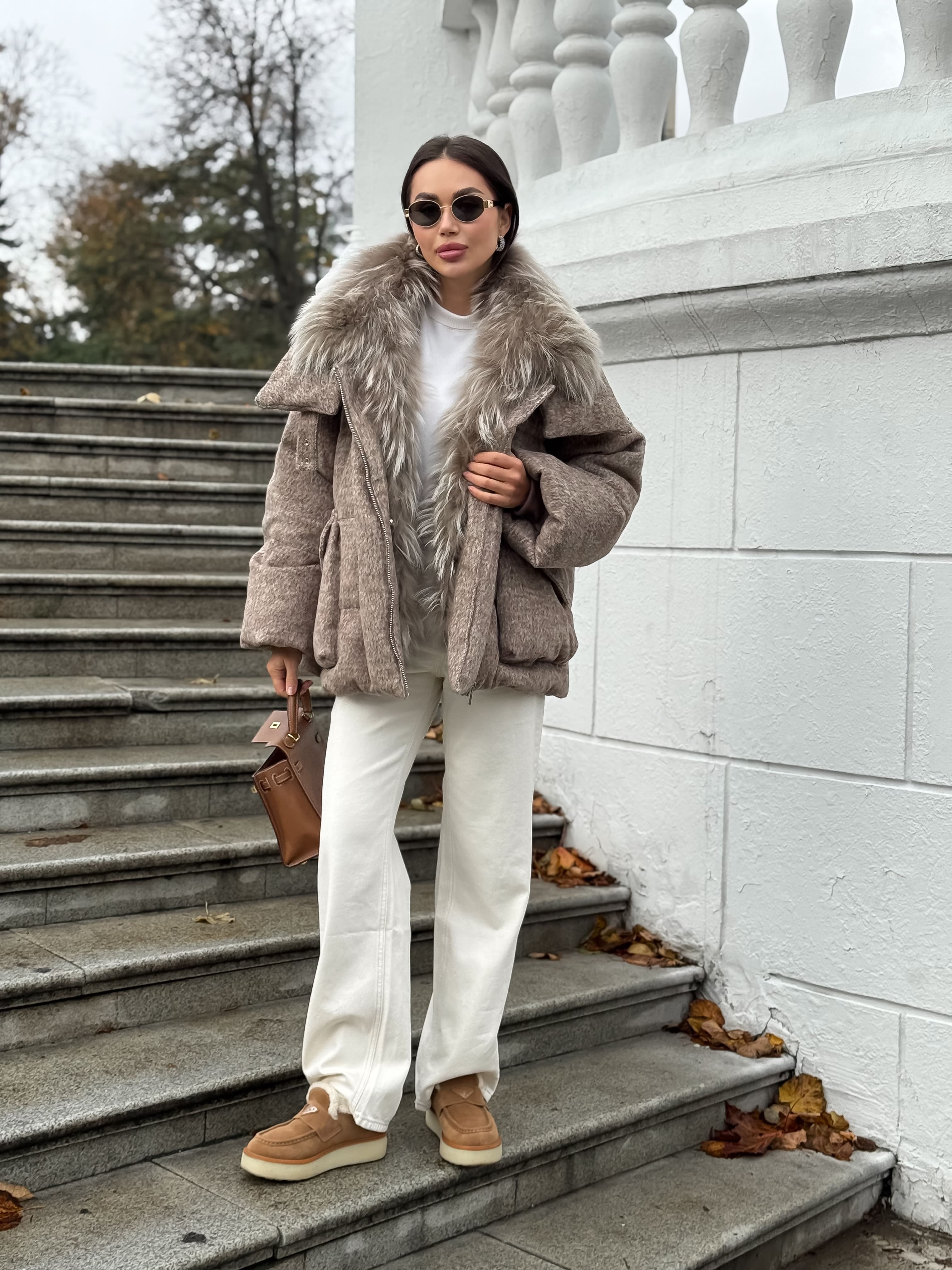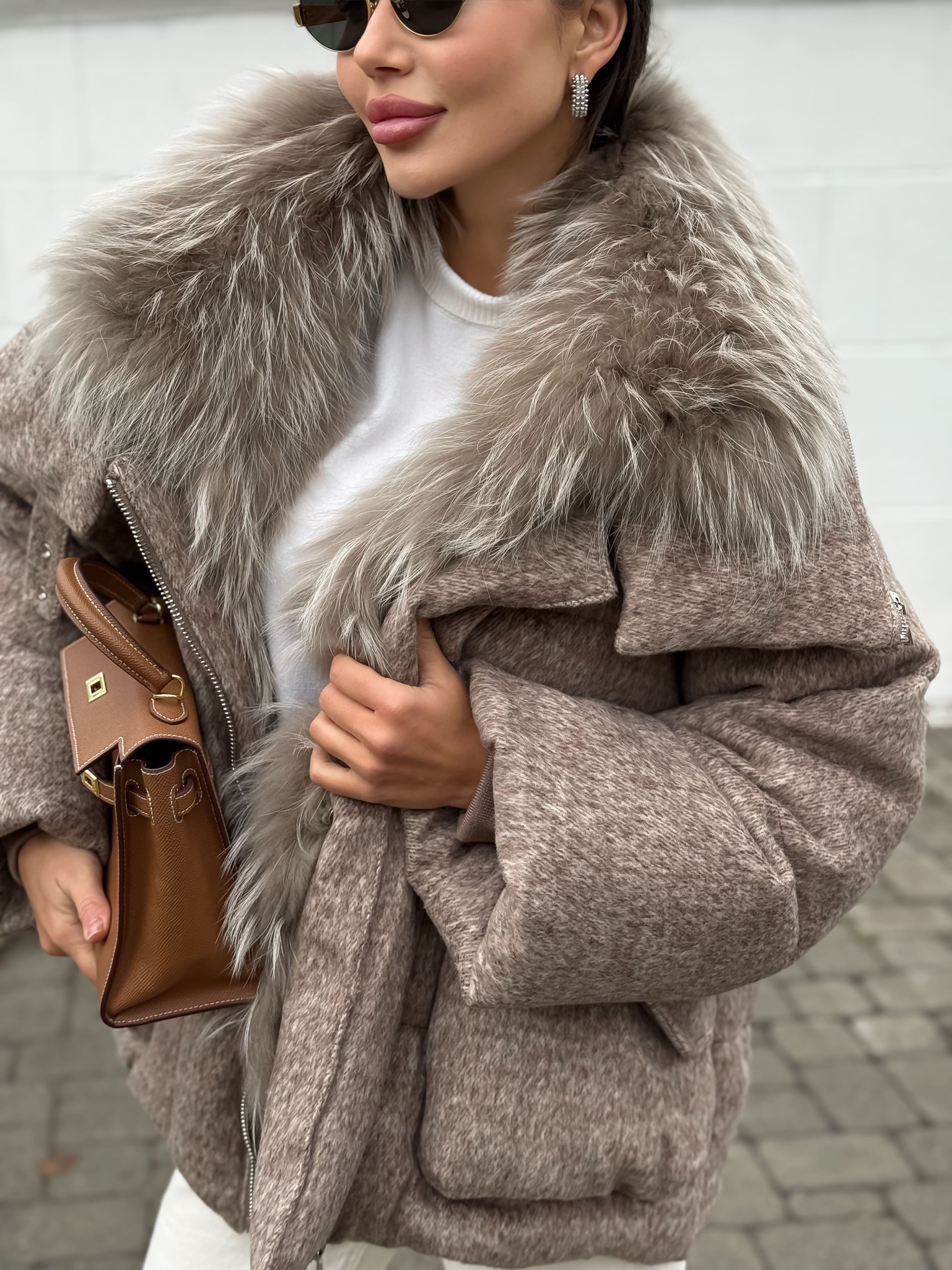 Пуховик с мехом лисы из мохера, кофейный