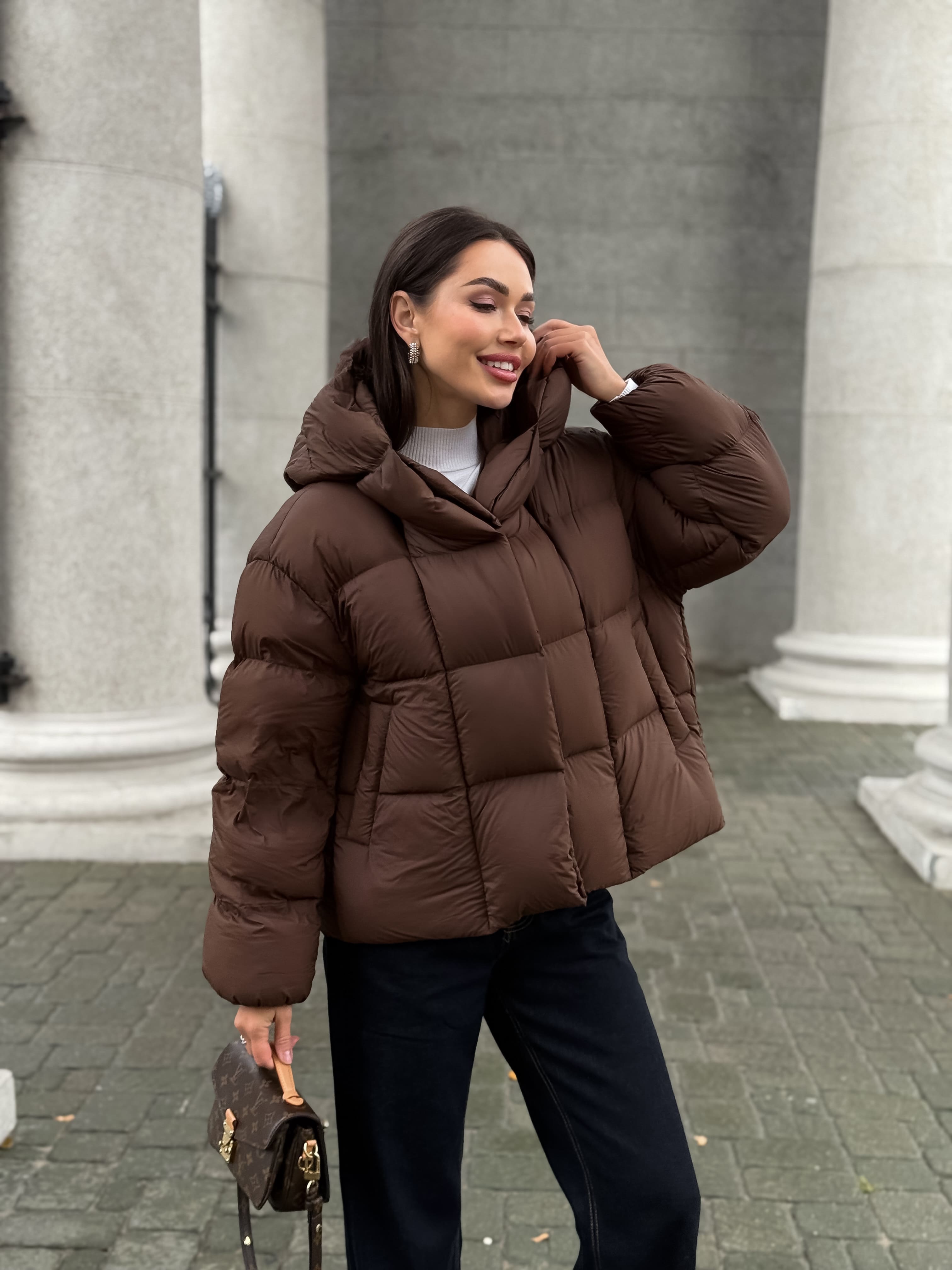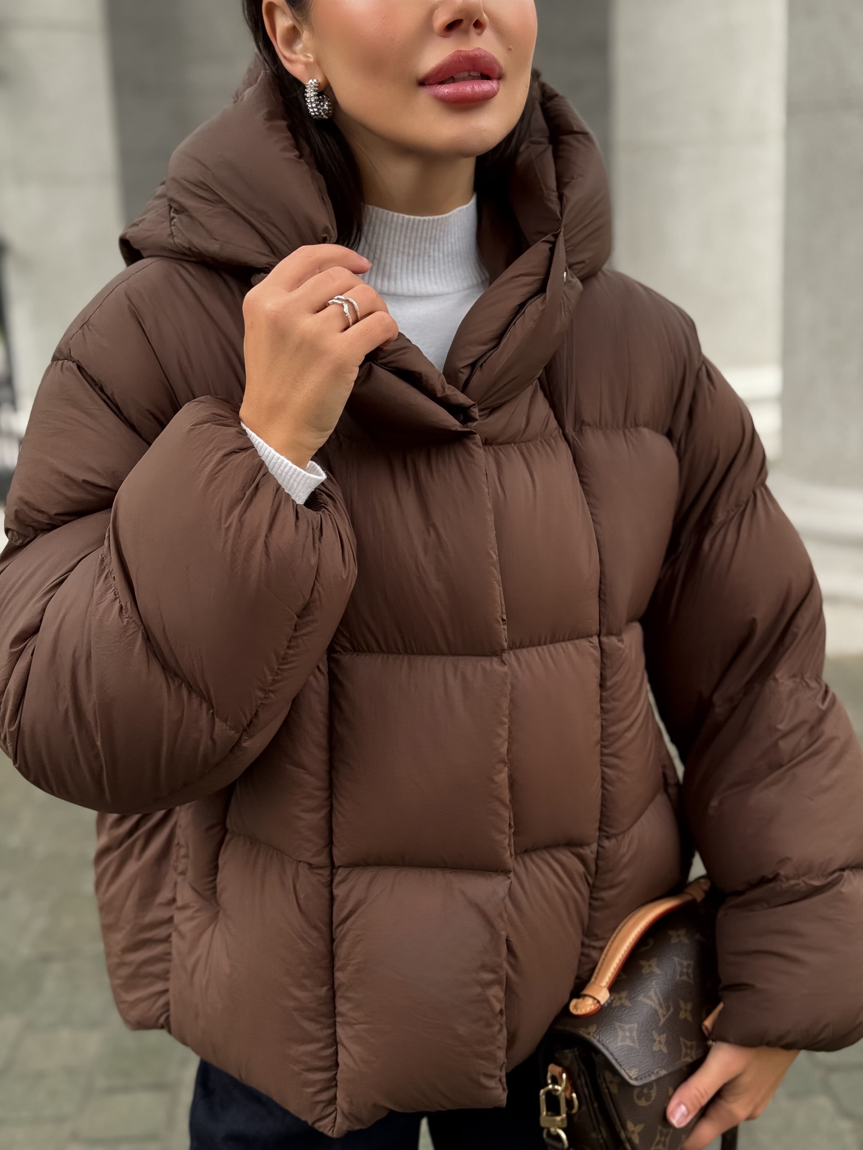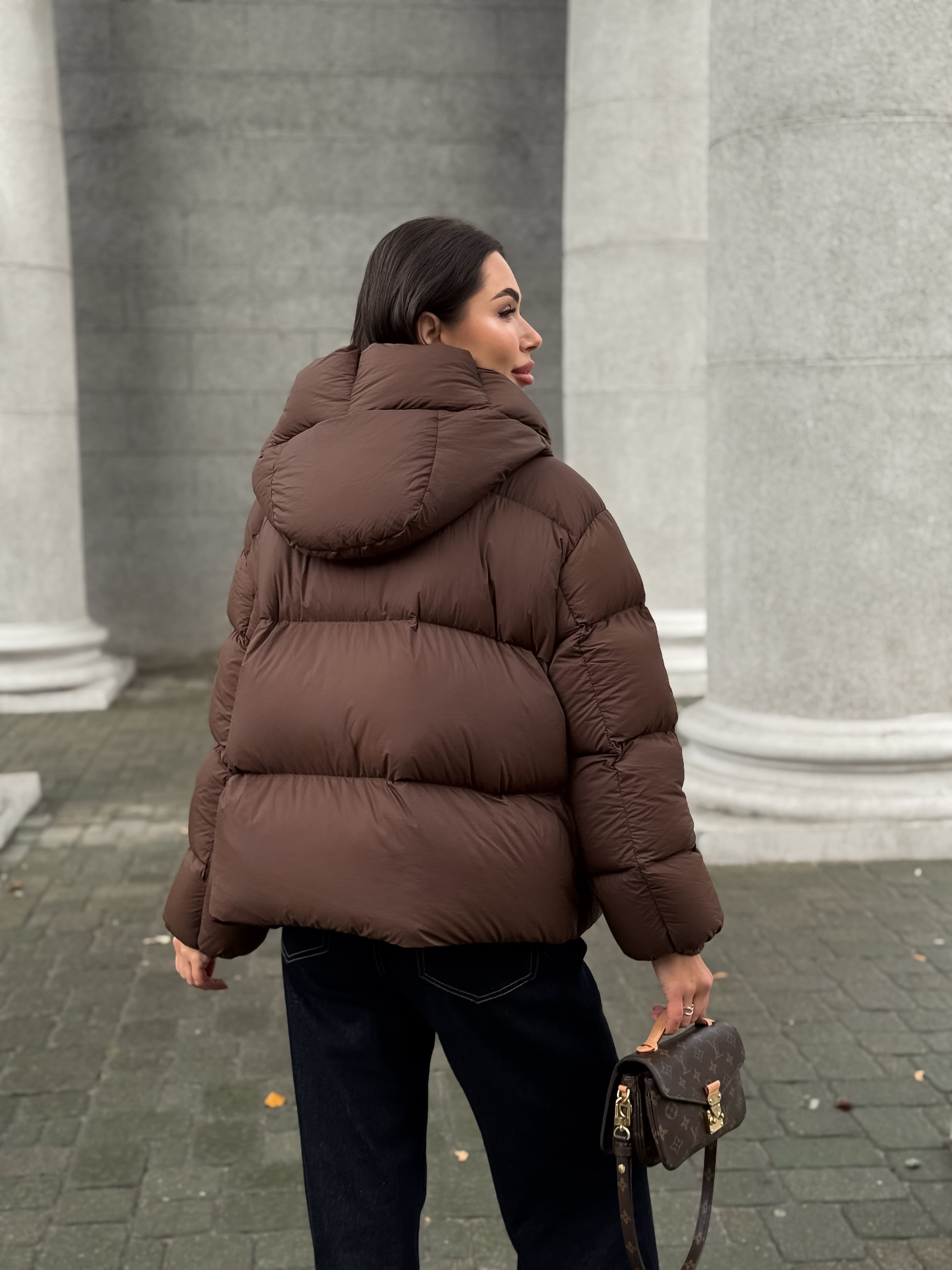 Пуховик укороченный с капюшоном, шоколадный