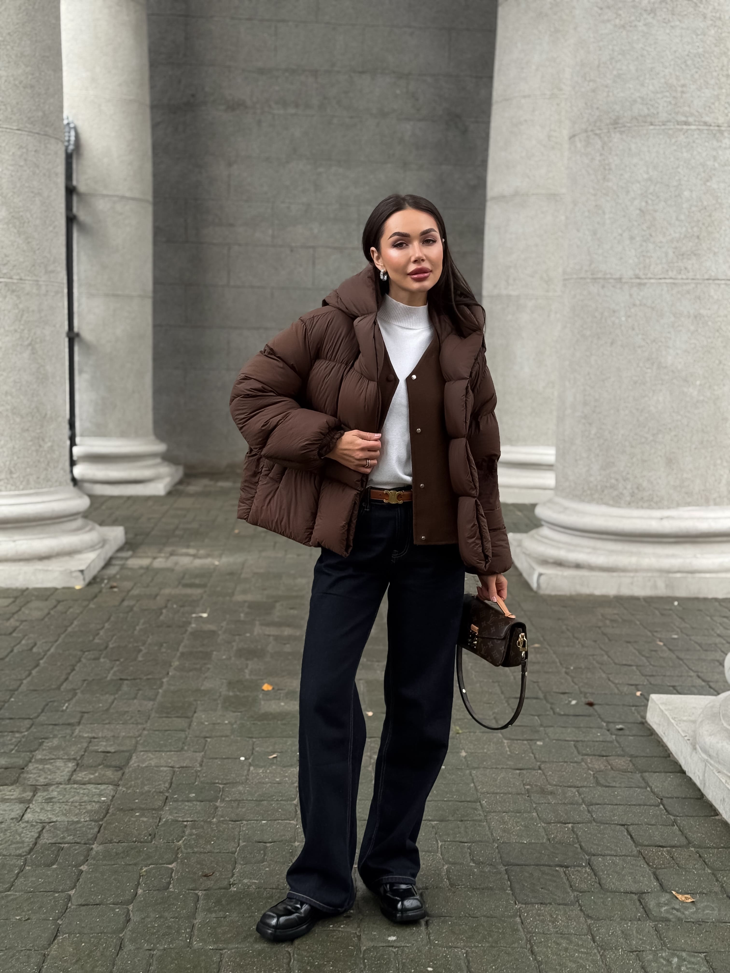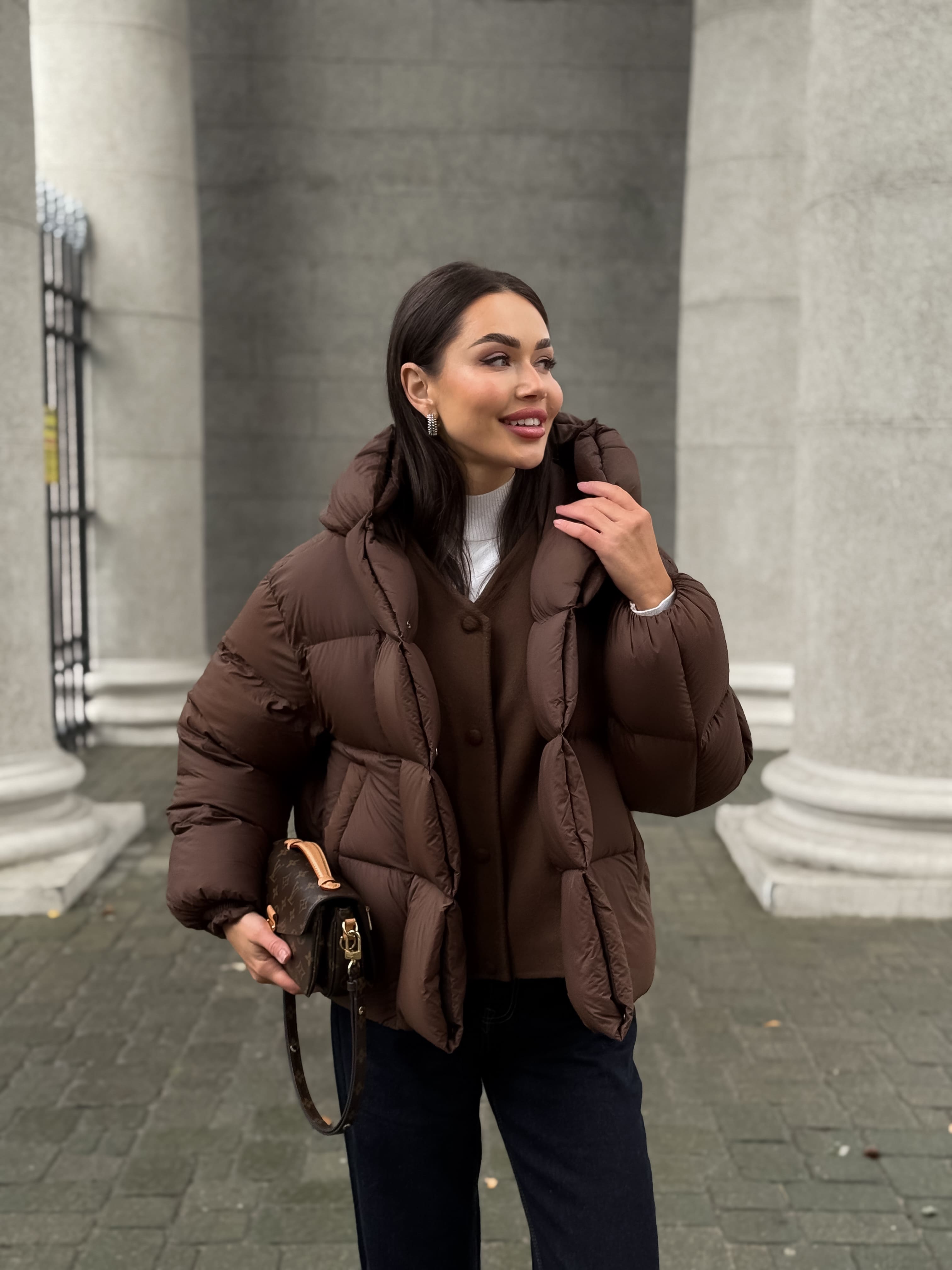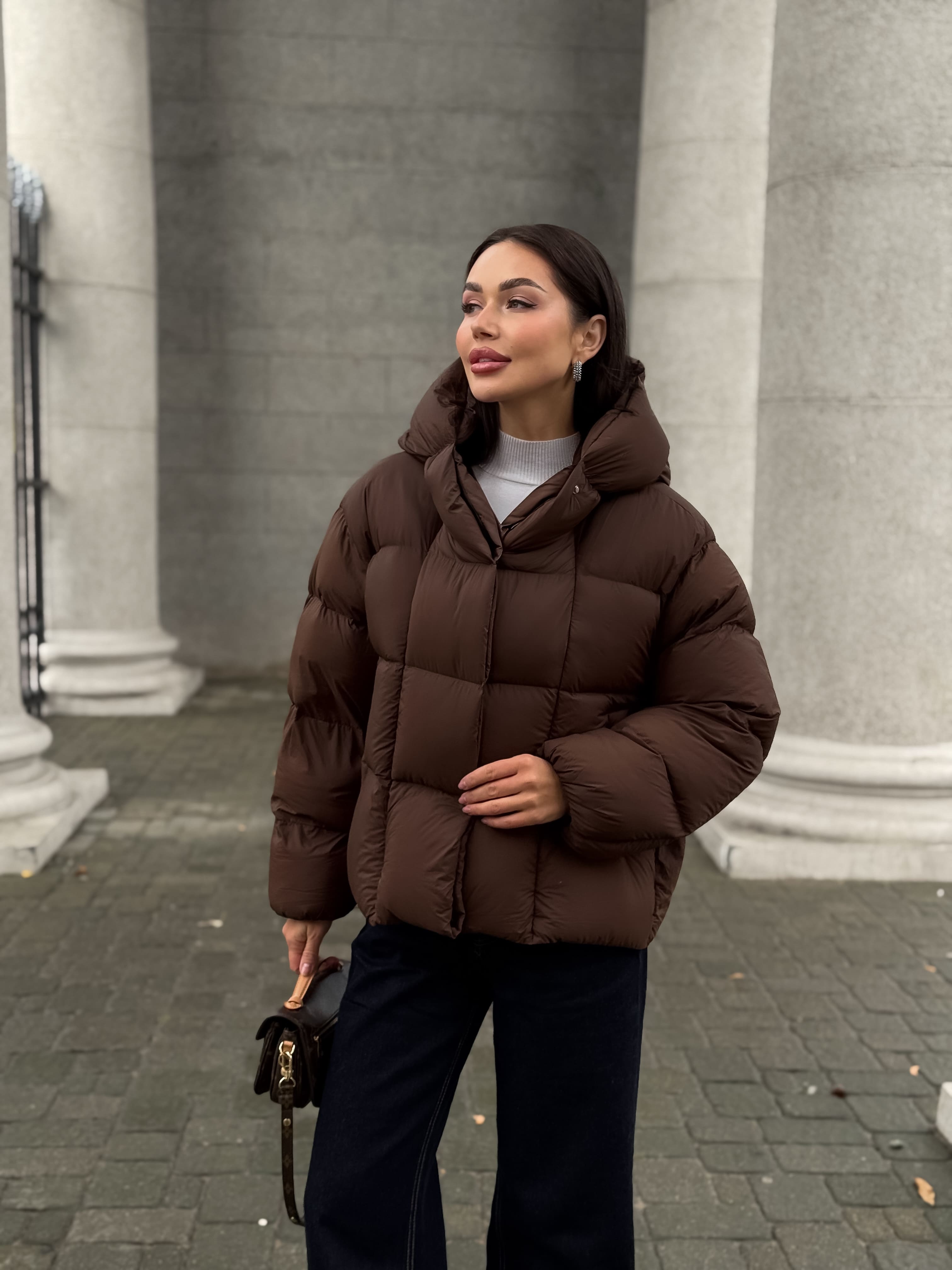 Пуховик укороченный с капюшоном, шоколадный