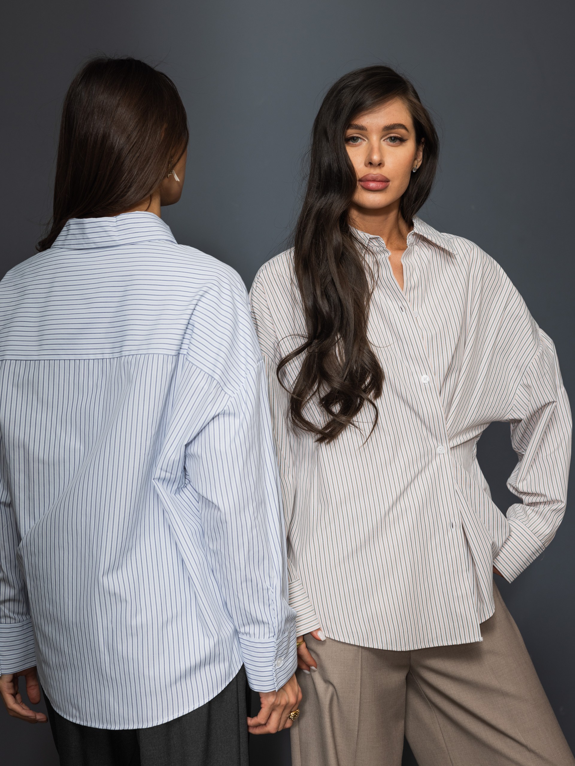 Рубашка имеет воротник и длинный рукав. На рубашке также есть особая пуговица, которая меняет фасон изделия при ее использовании.
