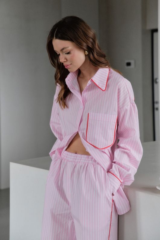 Рубашка свободного кроя с карманом на груди в полоску в розовом цвете