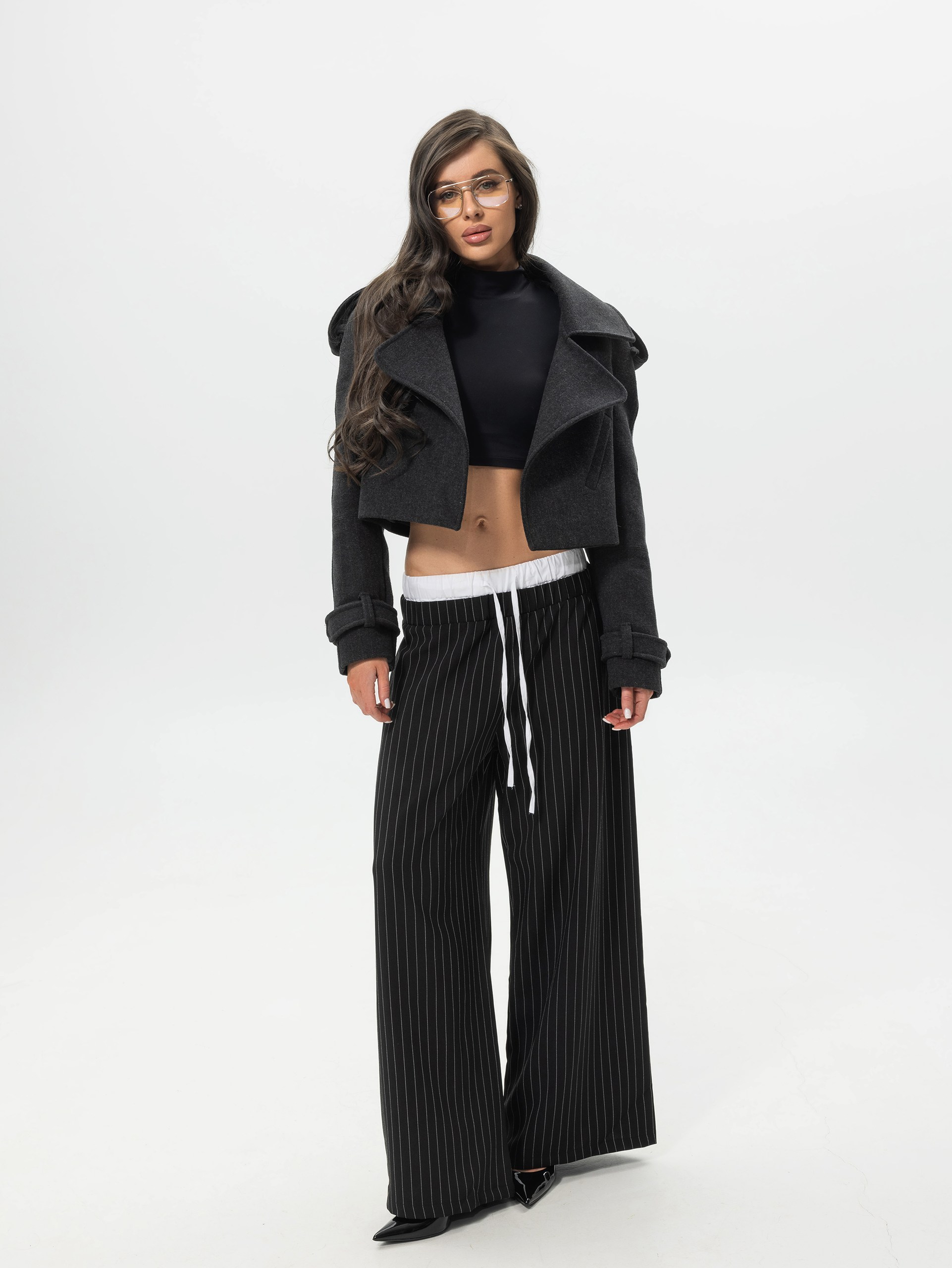 Пальто укороченное, с широкими лацканами и манжетами на рукавах.